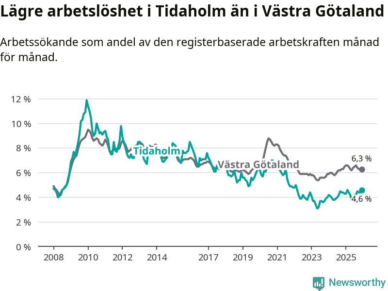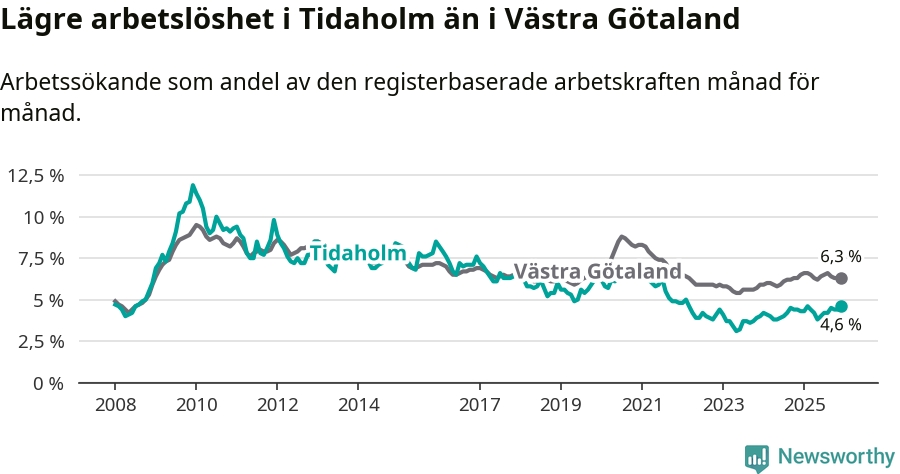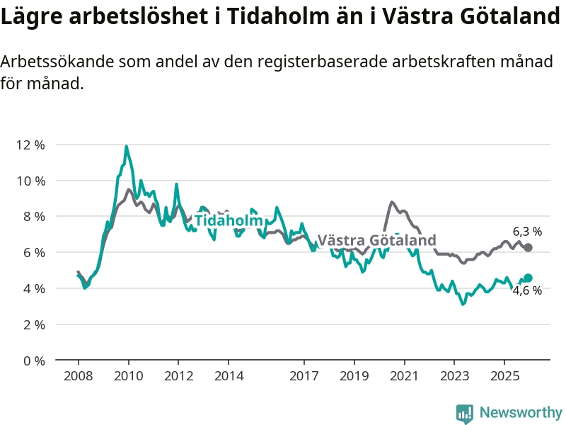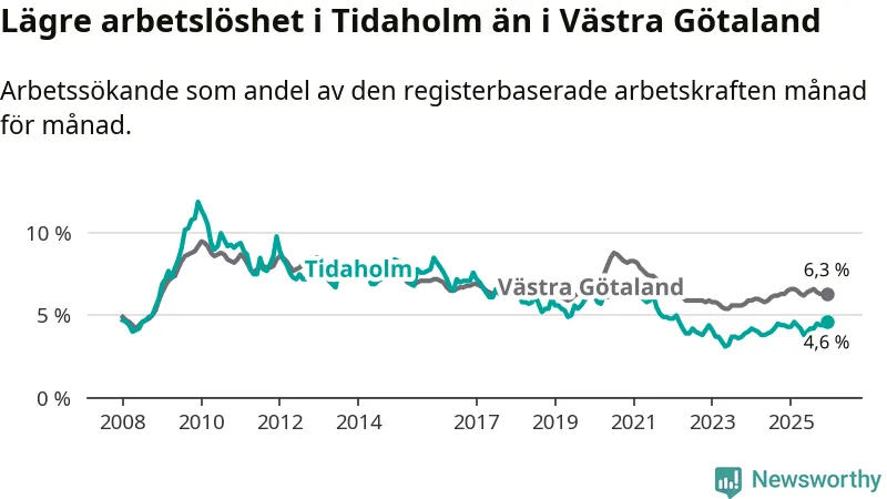 Under december månad rapporterade Tidaholms kommun en total arbetslöshet på 4,6 procent. Det är en ökning jämfört med samma tidpunkt i fjol (+0,3 procentenheter). I Västra Götalands län däremot sjunker arbetslösheten .
