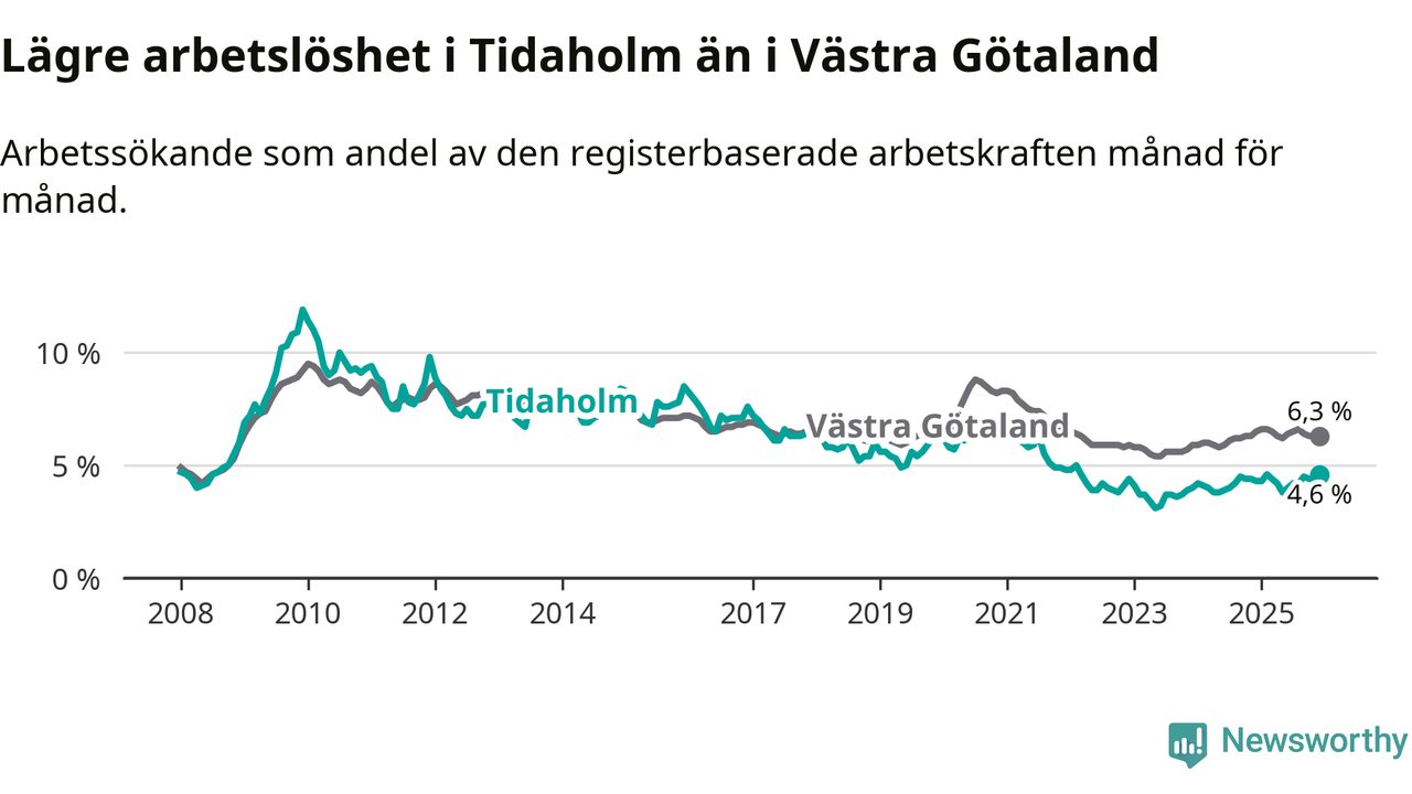 Även om arbetslösheten i Tidaholm alltså ökar, så ligger den fortfarande under snittet i hela Västra Götalands län (4,6 procent i kommunen, jämfört med 6,3 procent i hela länet). Öckerö har den lägsta arbetslösheten i länet (3,0 procent), medan Gullspång har den högsta (8,8 procent). För att Tidaholm skulle komma ner i samma arbetslöshetsnivå som Öckerö skulle 96 personer behöva sysselsättas.