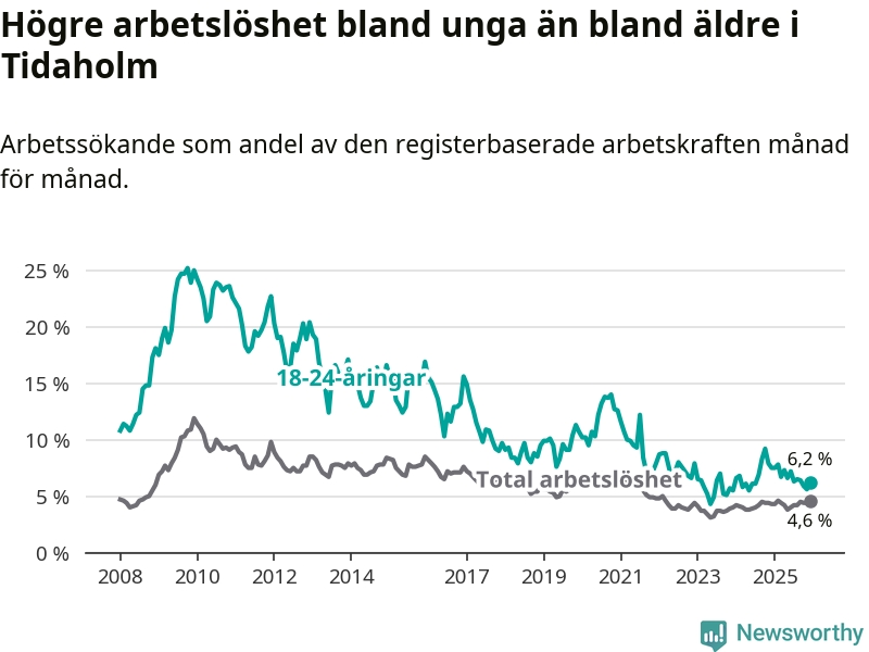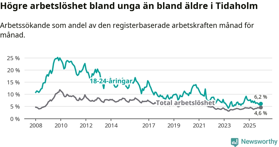 Till skillnad från den totala arbetslösheten sjunker arbetslösheten bland unga (−1,3 procentenheter). I december var 6,2 procent av 18–24-åringarna inskrivna som arbetssökande (motsvarande 38 personer). Mäter vi antalet inskrivna ser vi en minskning med elva personer på ett års sikt.