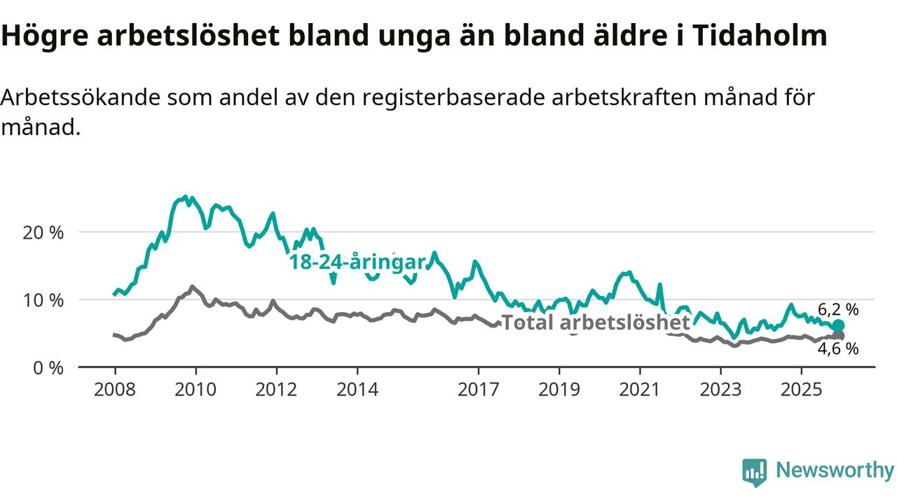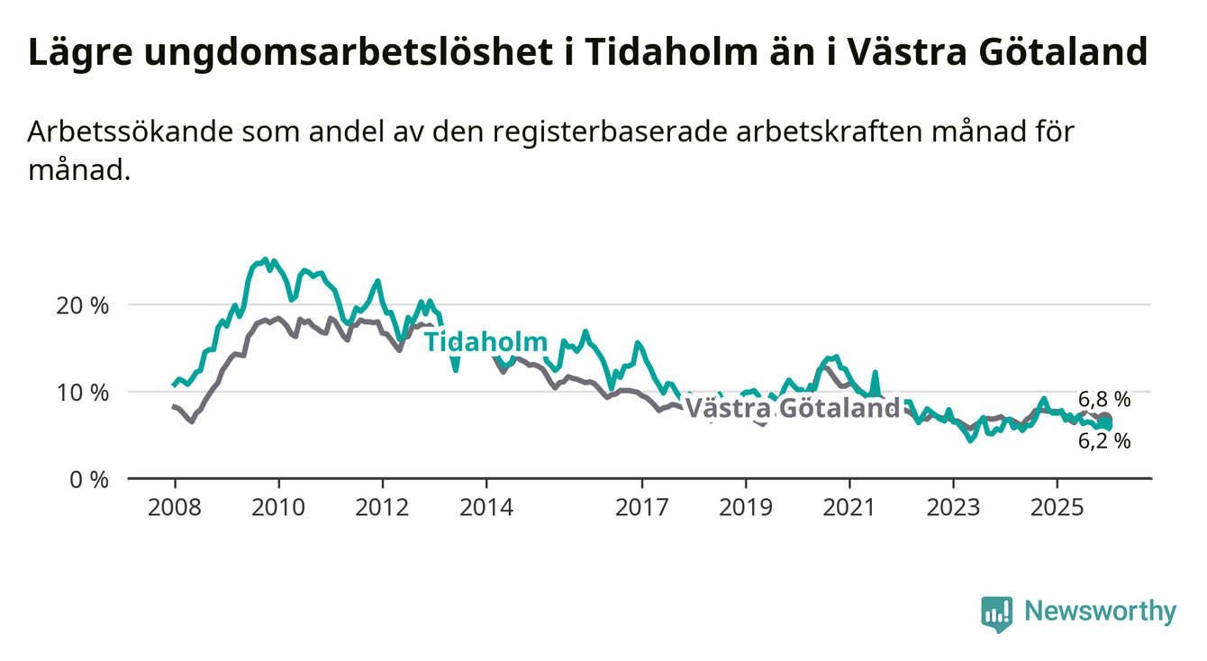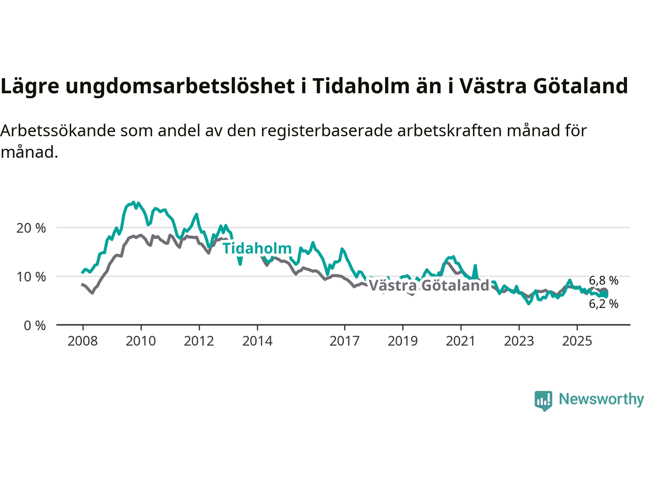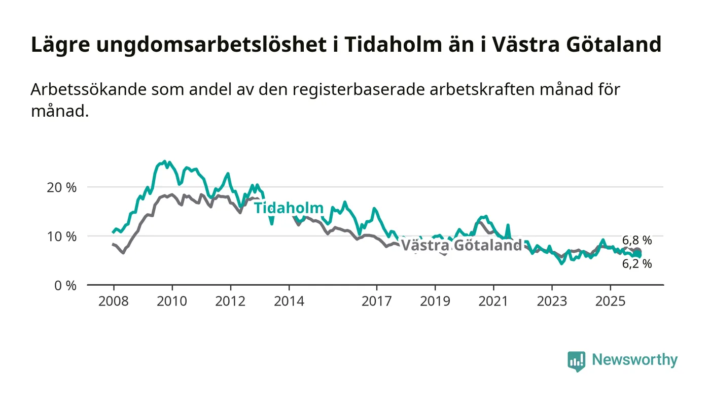 Precis som den totala arbetslösheten ligger ungdomsarbetslösheten i Tidaholm lägre än i Västra Götaland som helhet. Skillnaden mellan kommunen och länet är 0,6 procentenheter.
