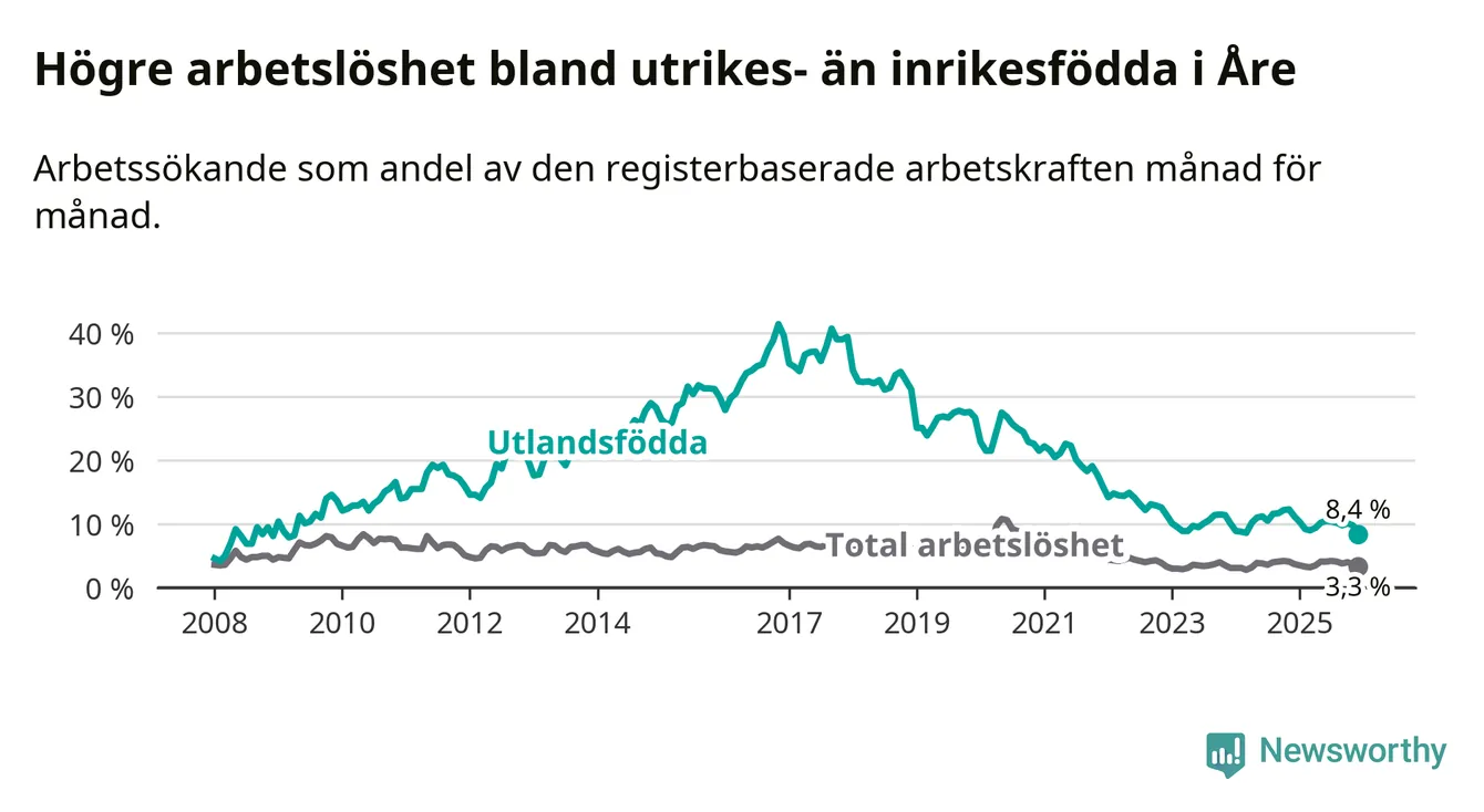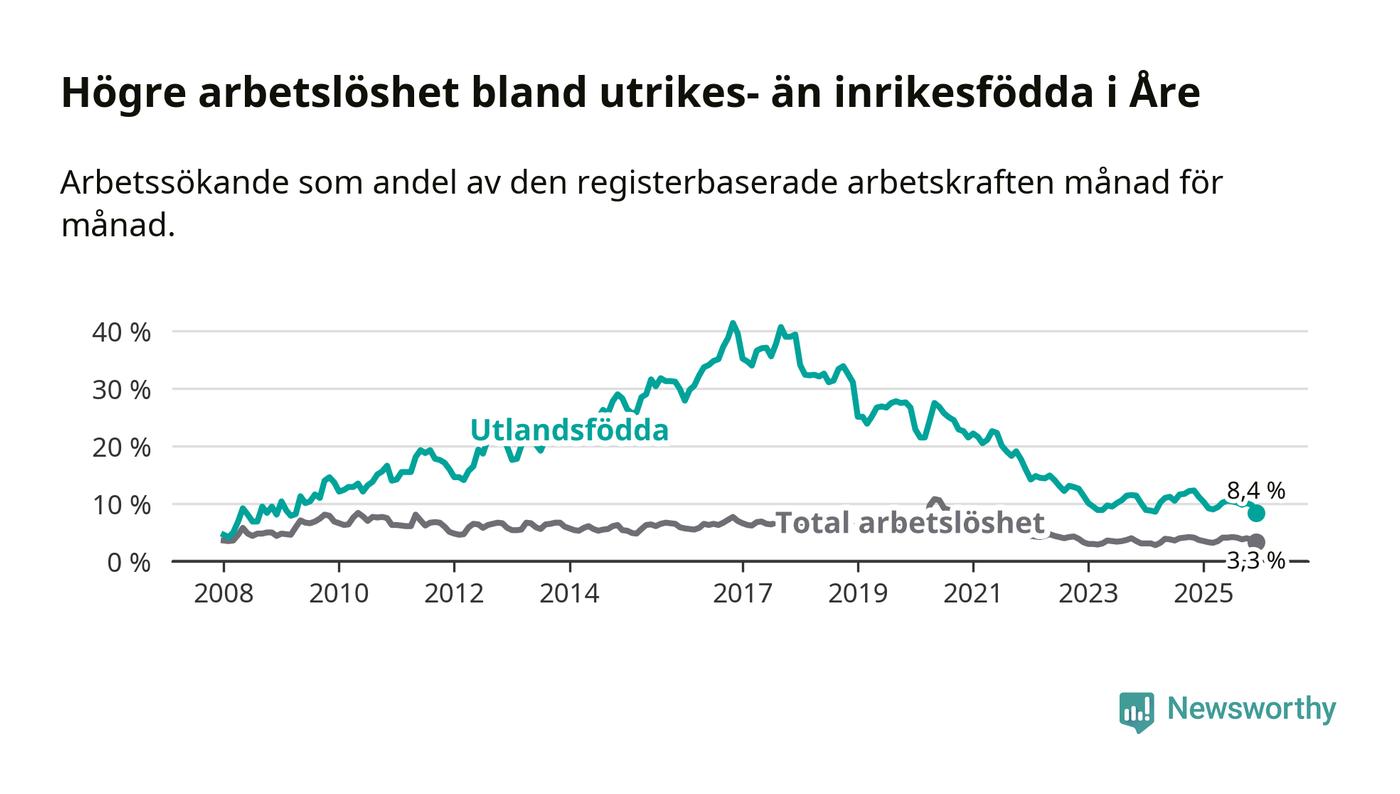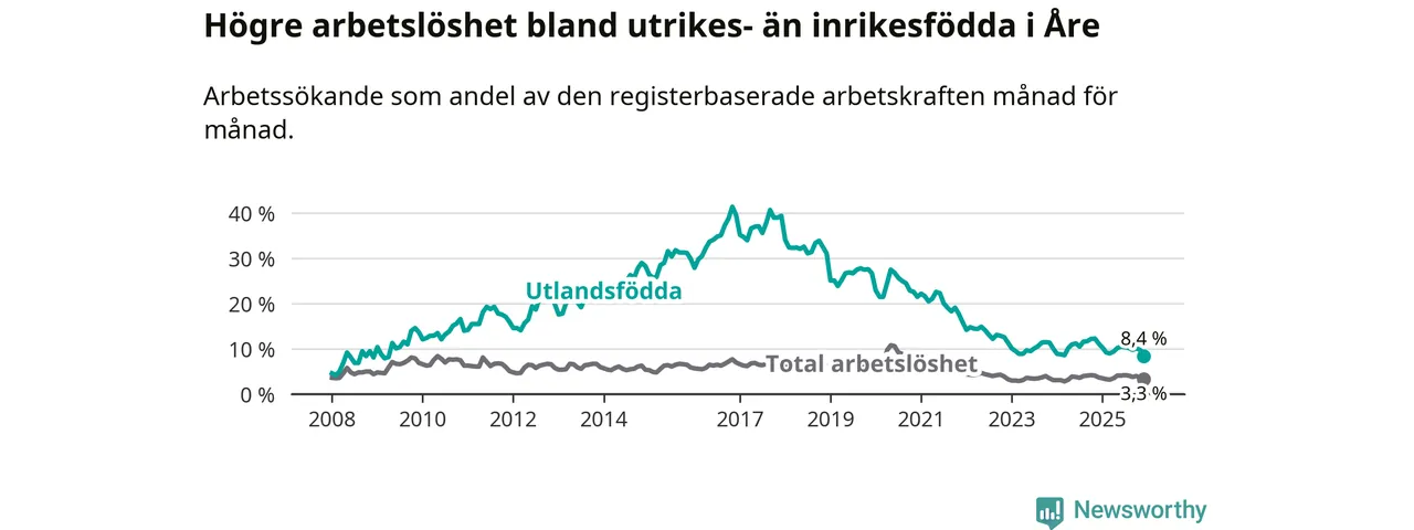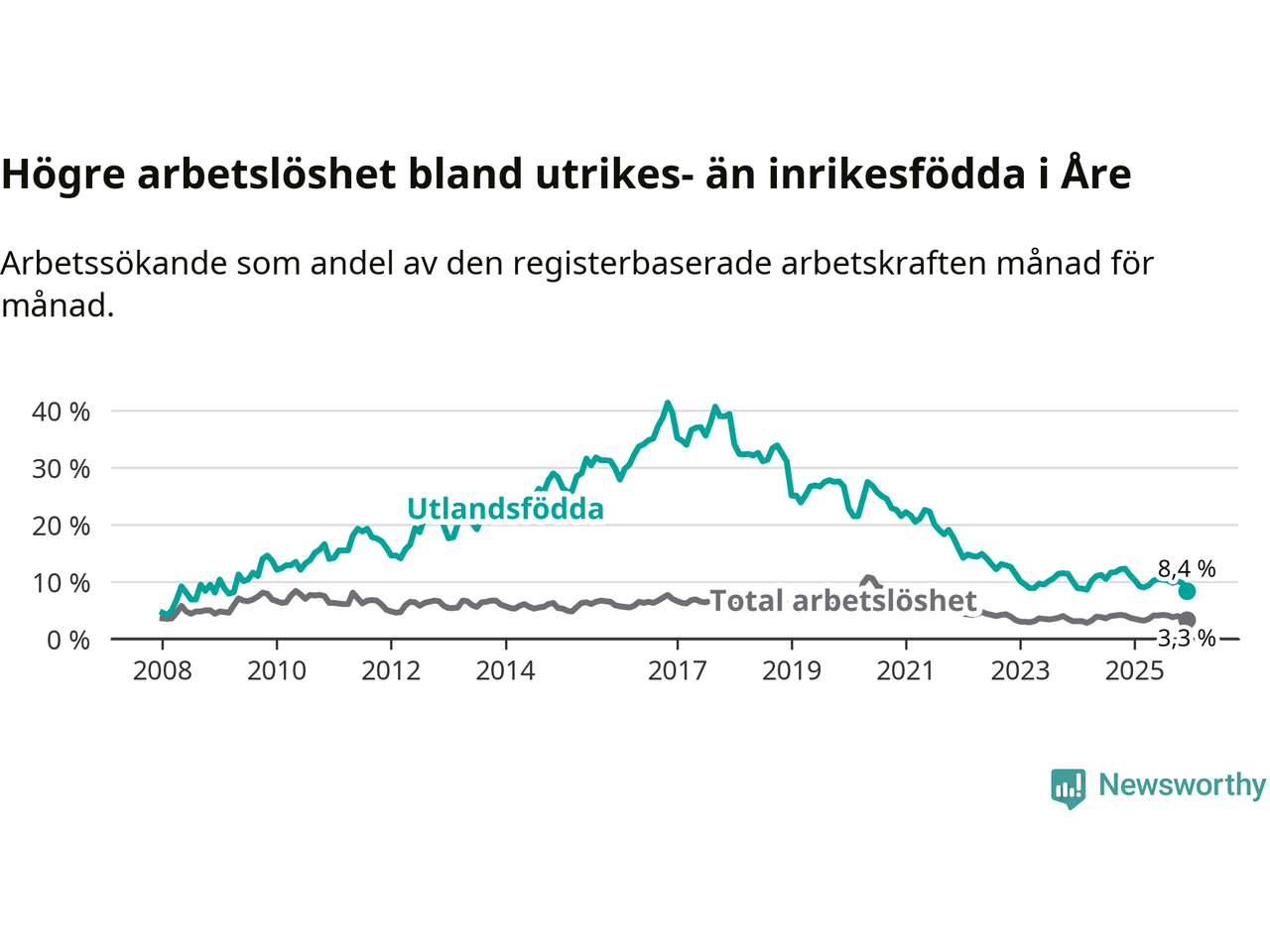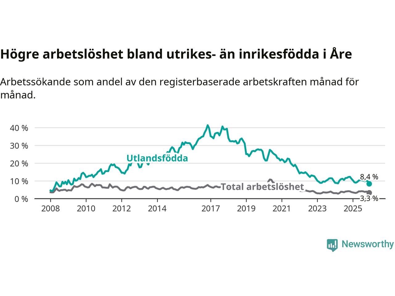 Skillnaden i arbetslöshet mellan utrikesfödda och hela befolkningen är 5,1 procentenheter i Åre. Det är en betydligt mindre skillnad än för ett år sedan (−2,4 procentenheter).