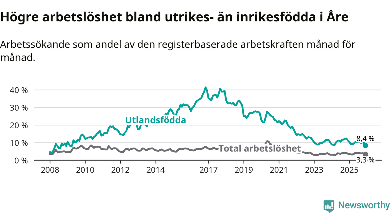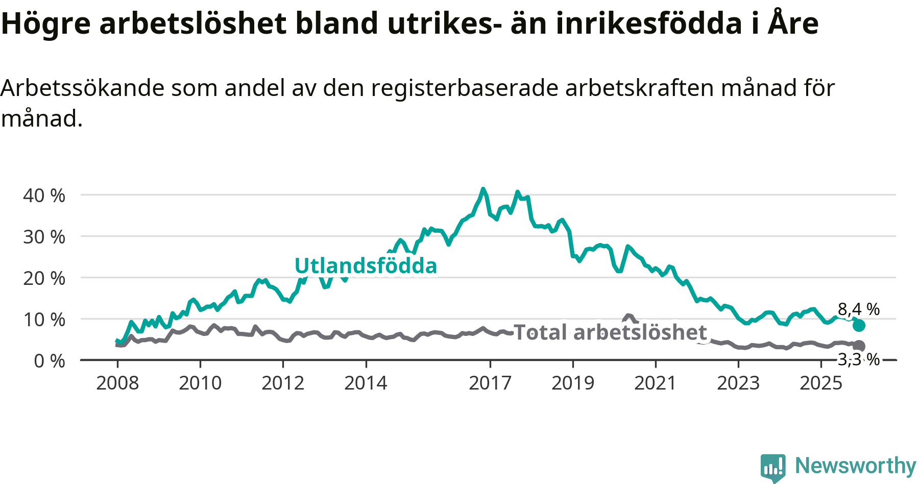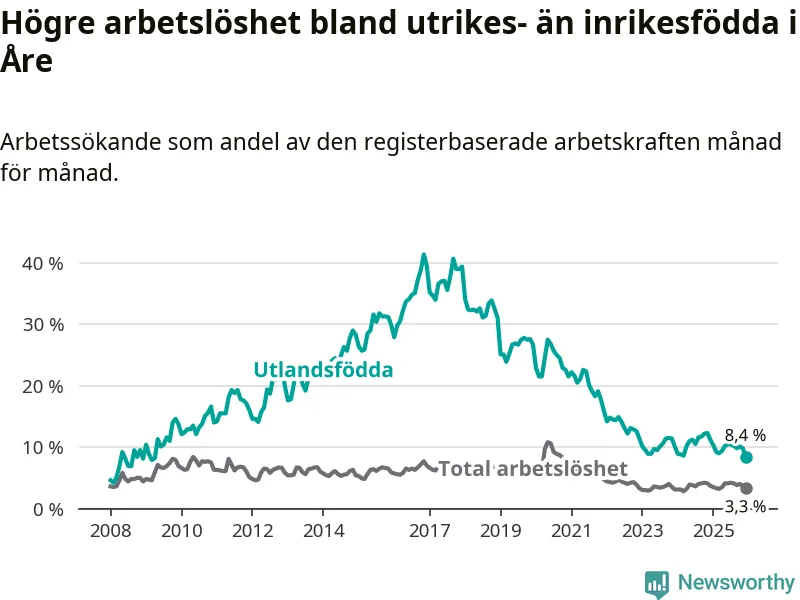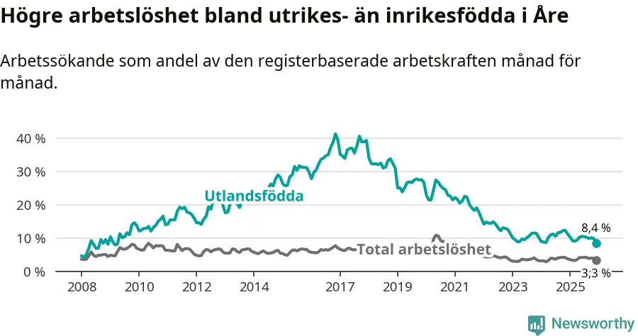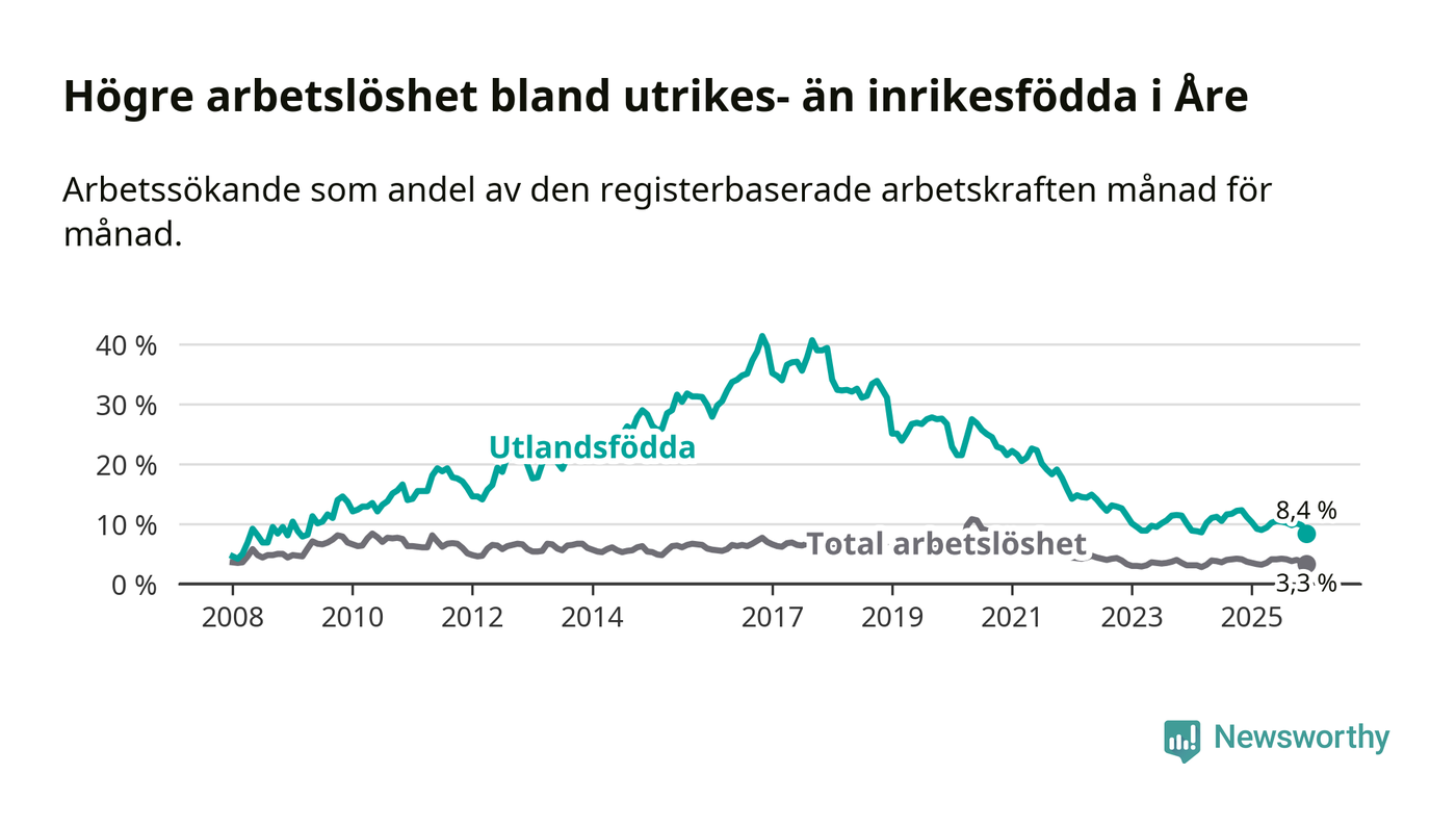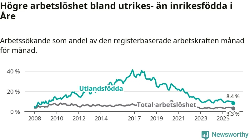 Skillnaden i arbetslöshet mellan utrikesfödda och hela befolkningen är 5,1 procentenheter i Åre. Det är en betydligt mindre skillnad än för ett år sedan (−2,4 procentenheter).
