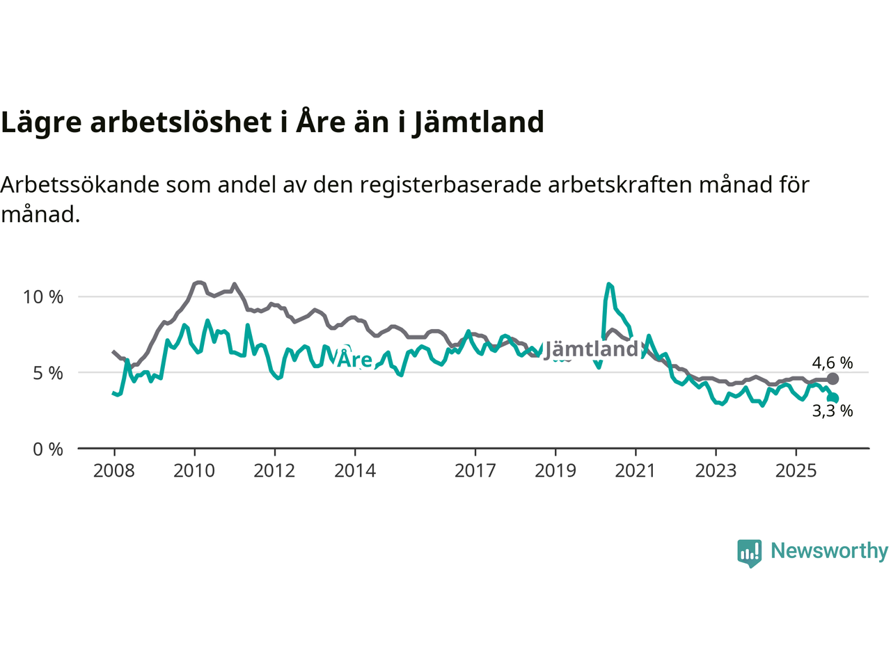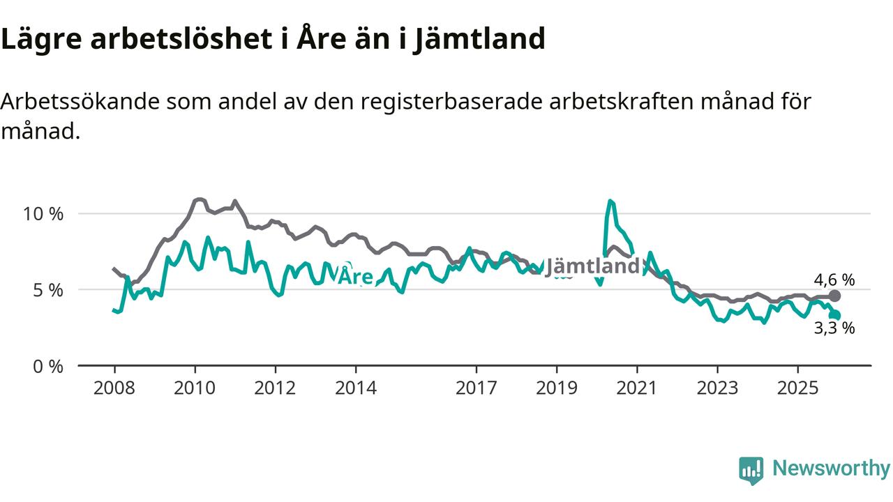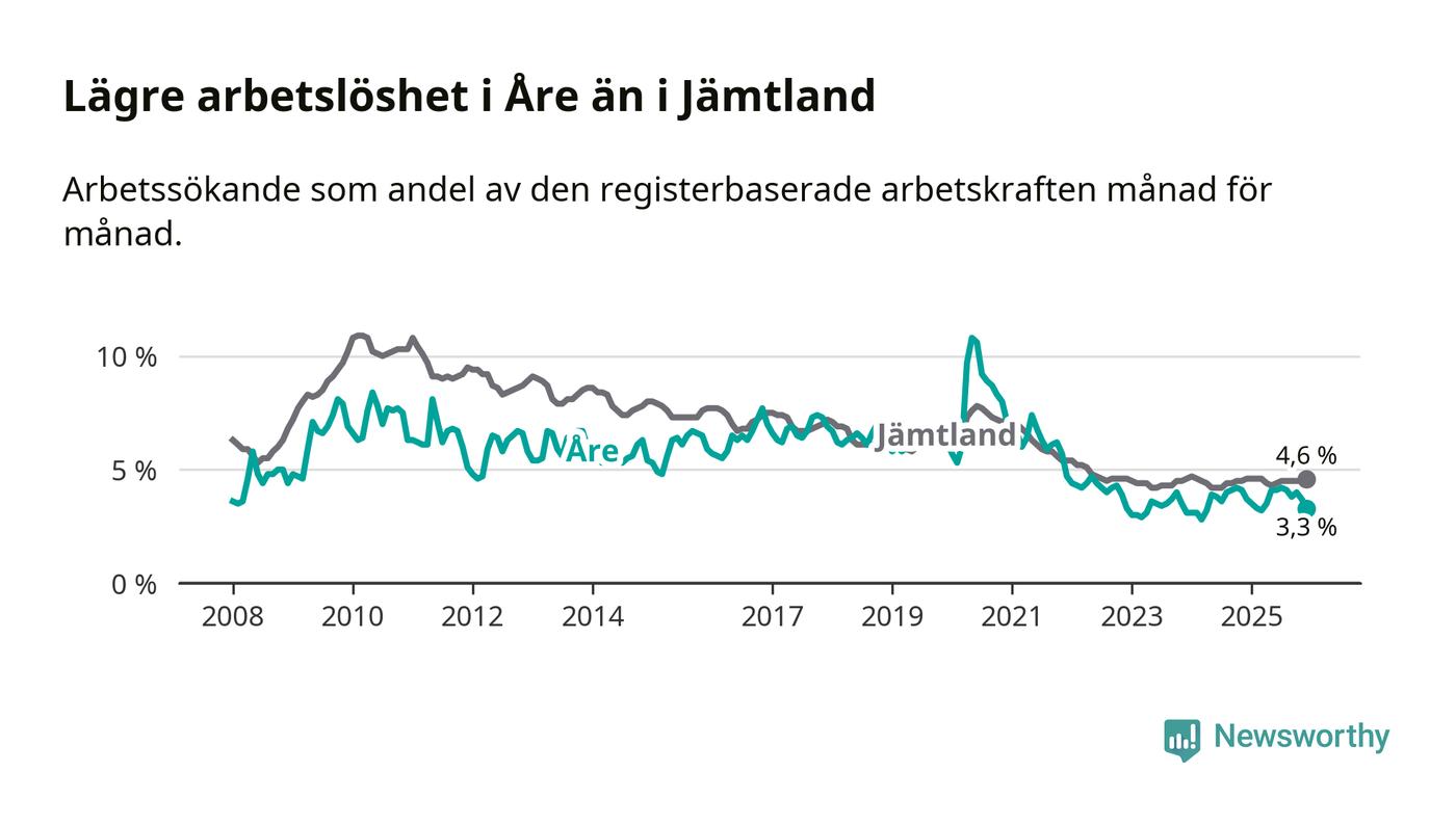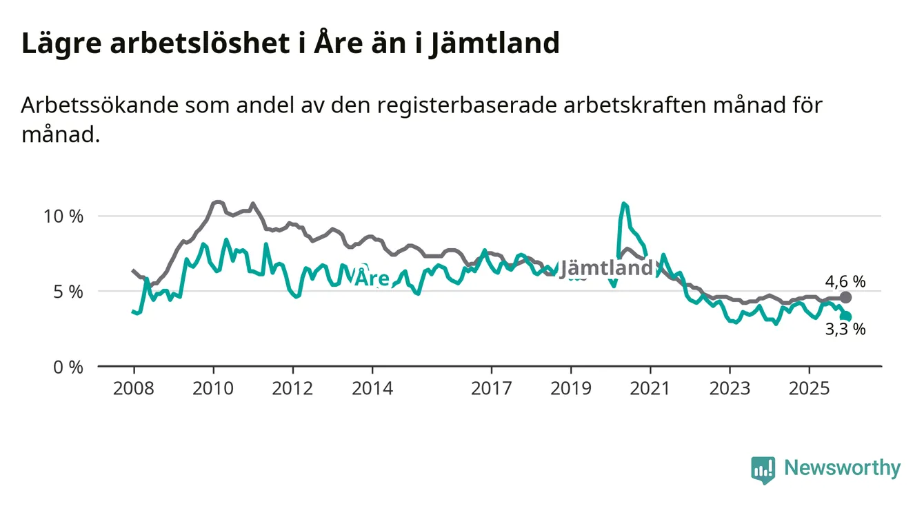 Åre hade redan tidigare lägre arbetslöshet än snittet i hela Jämtlands län och nu växer klyftan (3,3 procent i kommunen, jämfört med 4,6 procent i hela länet). Åre har därmed även den lägsta arbetslöshetsnivån i länet. Strömsund har den högsta (6,4 procent).