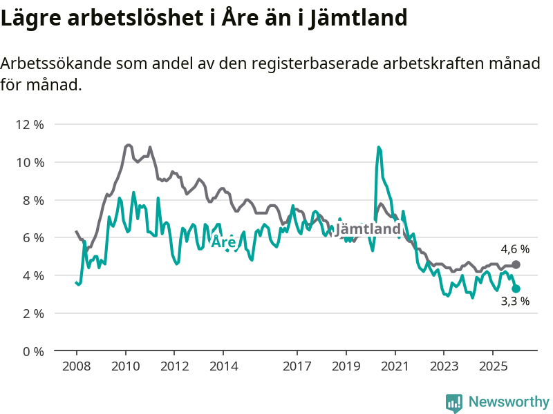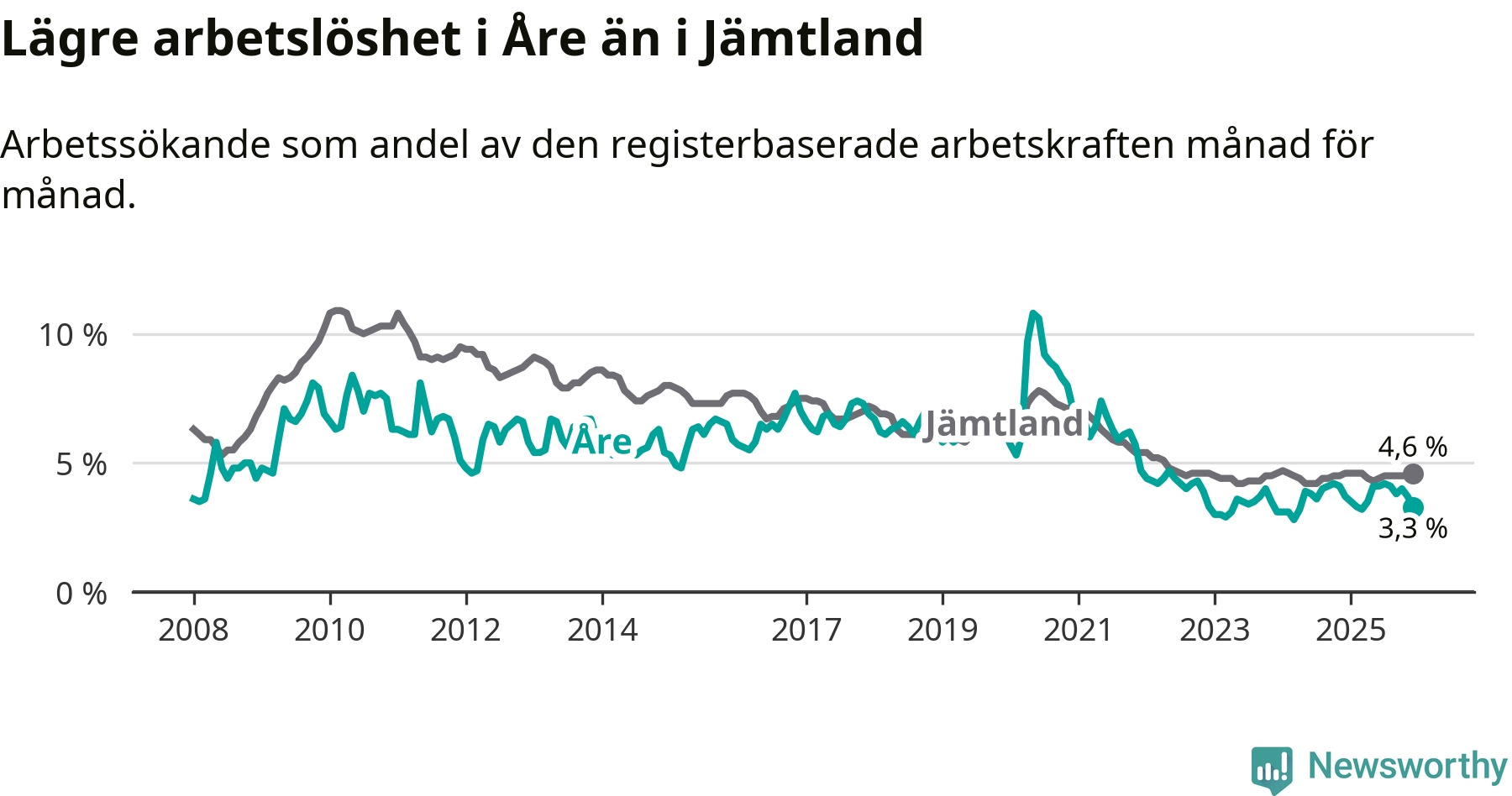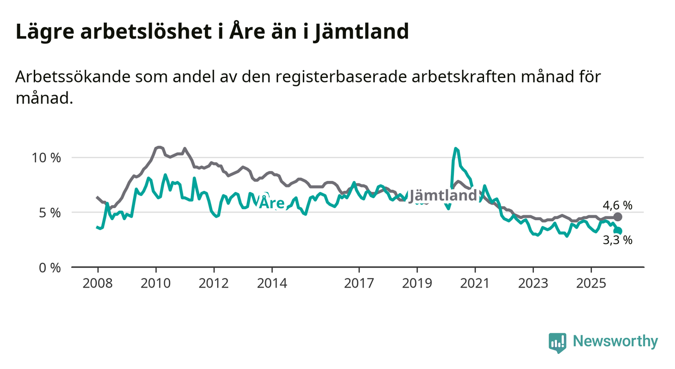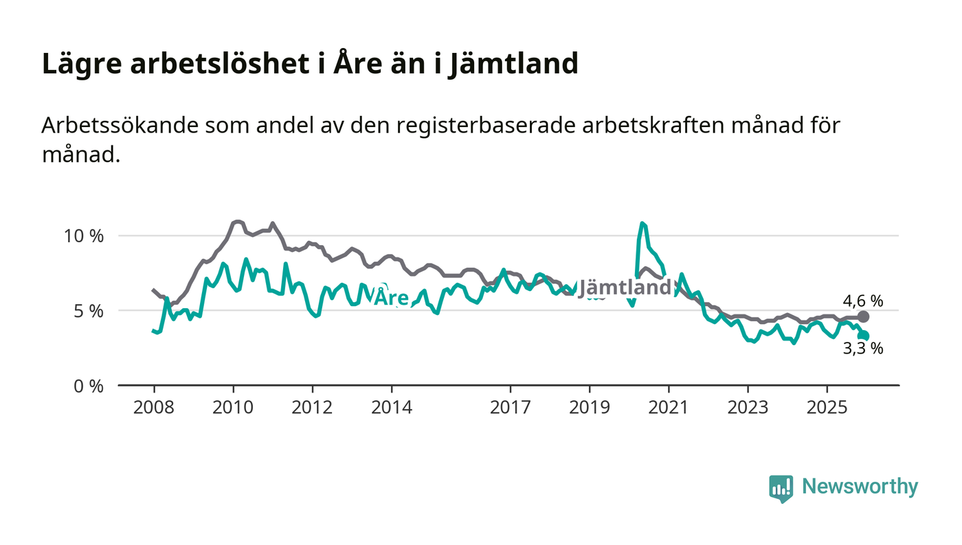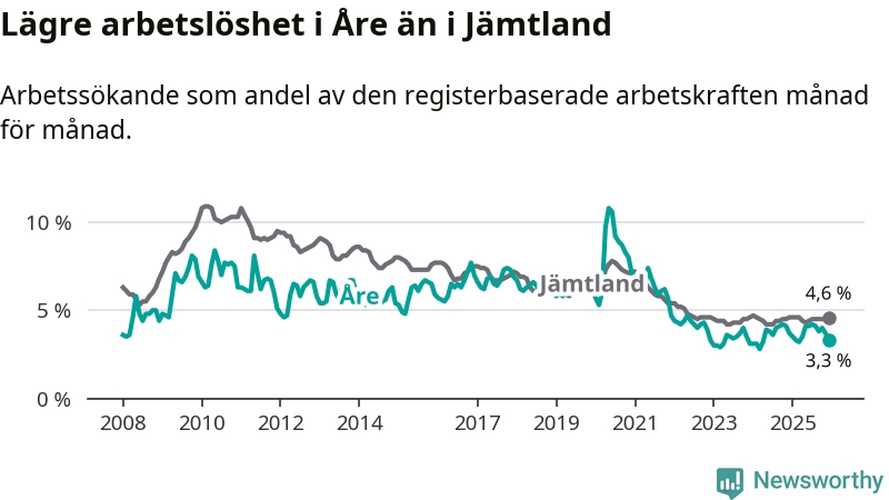 Åre hade redan tidigare lägre arbetslöshet än snittet i hela Jämtlands län och nu växer klyftan (3,3 procent i kommunen, jämfört med 4,6 procent i hela länet). Åre har därmed även den lägsta arbetslöshetsnivån i länet. Strömsund har den högsta (6,4 procent).