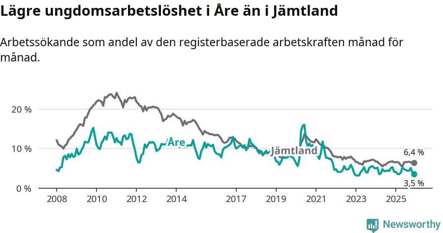 Precis som den totala arbetslösheten ligger ungdomsarbetslösheten i Åre lägre än i Jämtland som helhet. Skillnaden mellan kommunen och länet är 2,9 procentenheter.