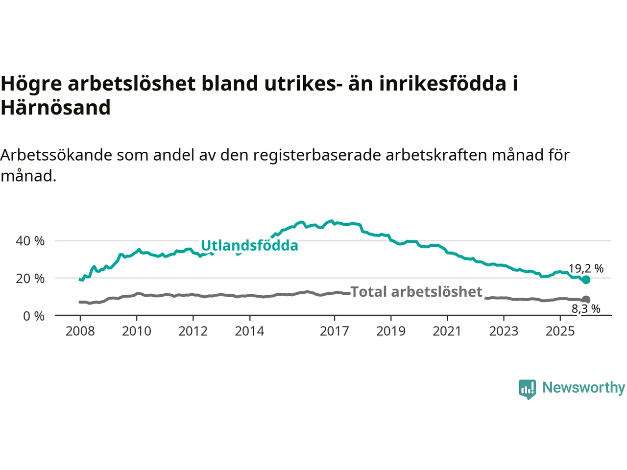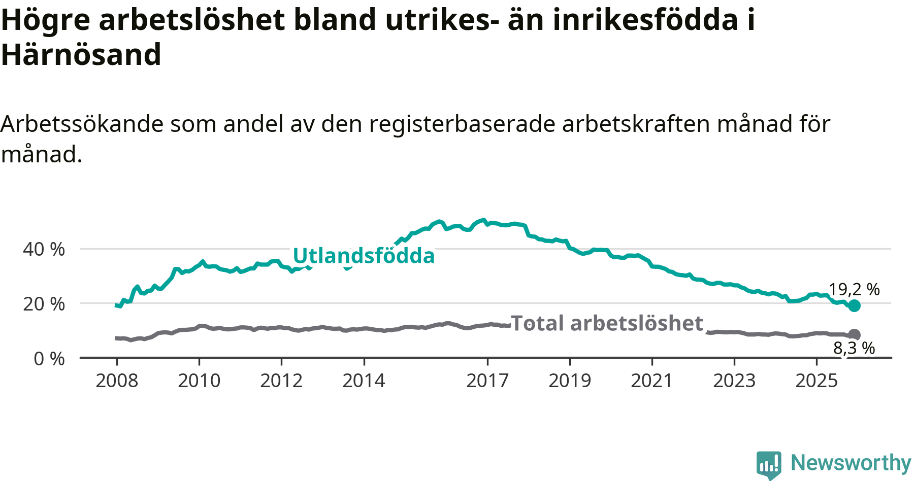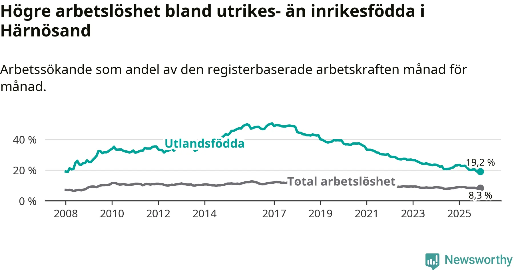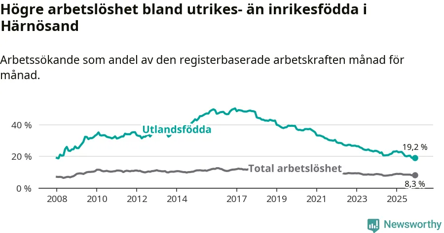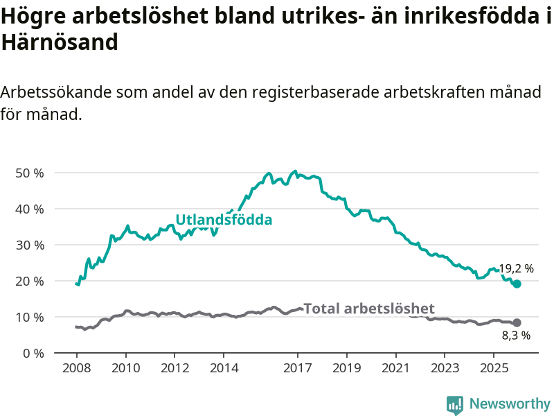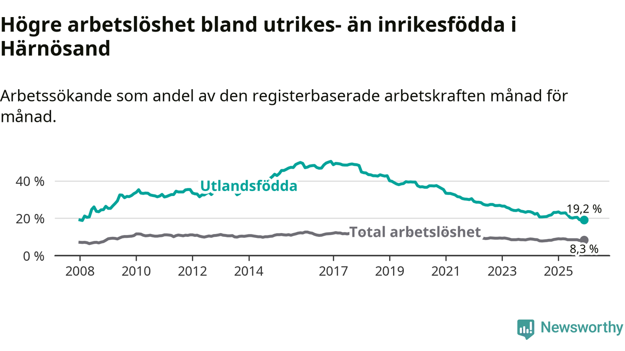 Arbetslösheten bland utlandsfödda var 19,2 procent i Härnösand under december månad, motsvarande 407 av 2 120 personer. Det är 3,9 procentenheter färre än vid samma tidpunkt i fjol (−83 om man räknar personer). Därmed är de utlandsföddas arbetslöshet lägre än vid samma tidpunkt i fjol för sjunde månaden i följd. Sedan maj 2025 har arbetslösheten bland utlandsfödda minskat från 21,8 till 19,2 procent.
