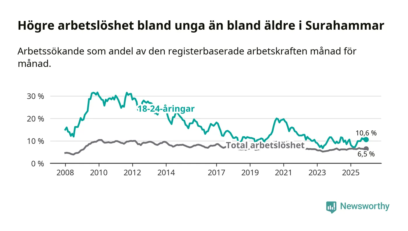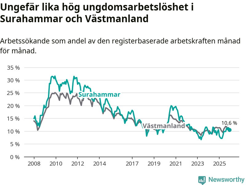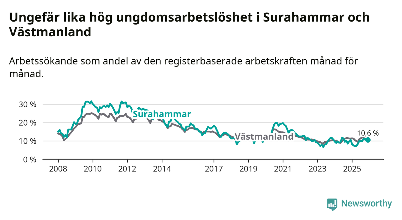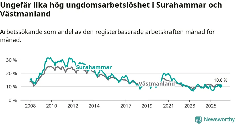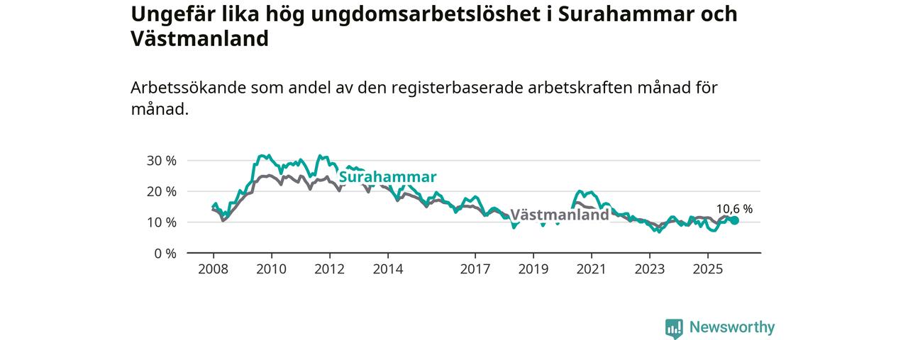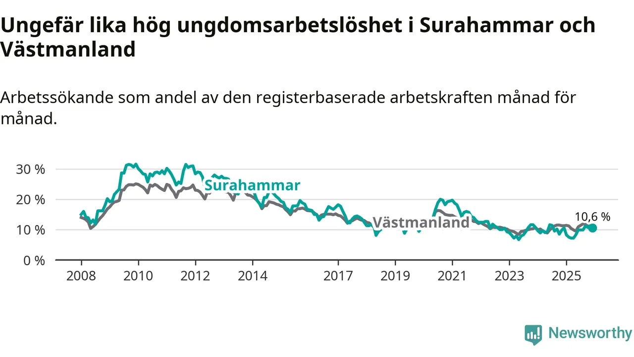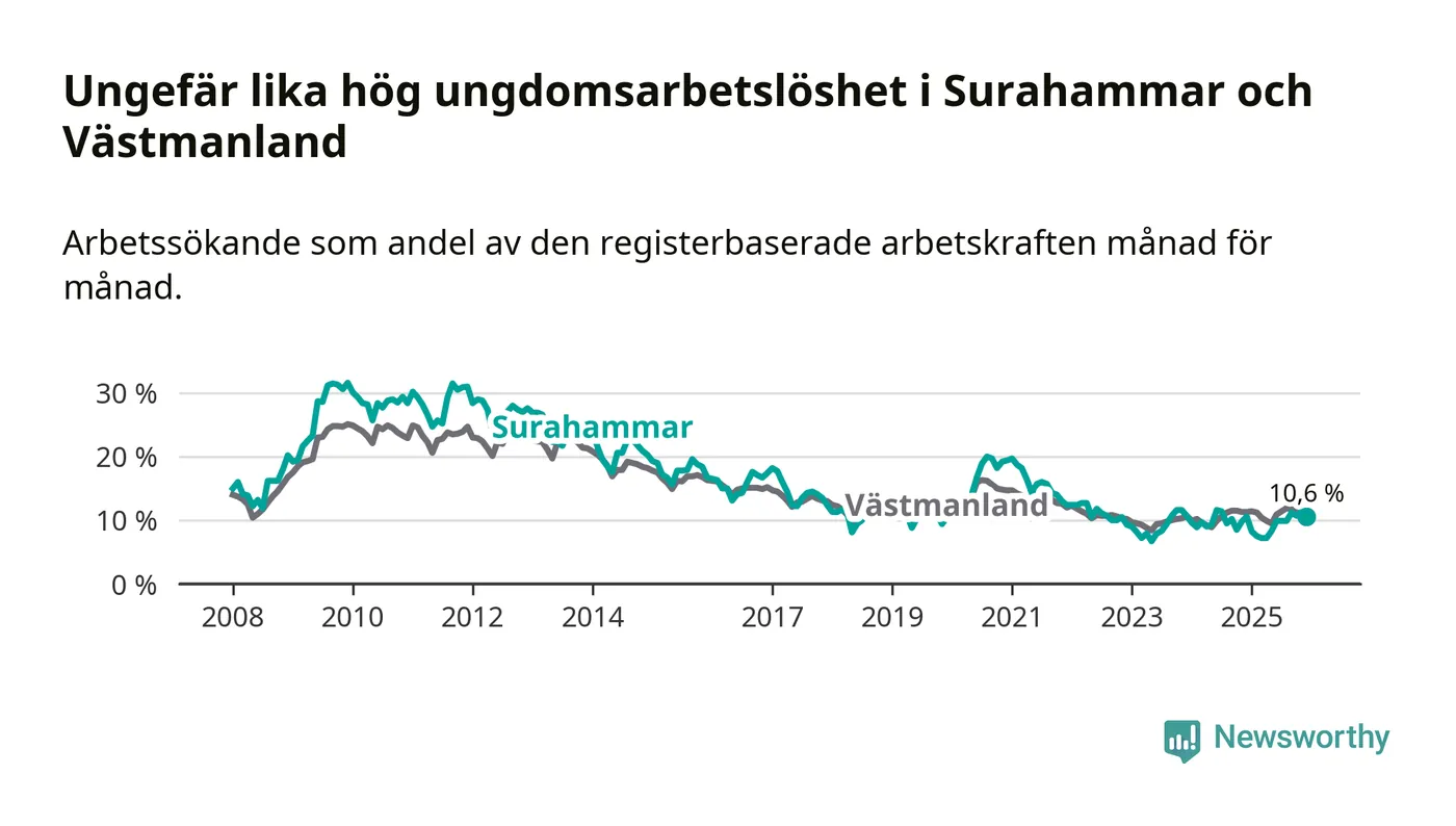 Medan Surahammar har lägre total arbetslöshet än Västmanland, ligger ungdomsarbetslösheten på i stort sett samma nivå.