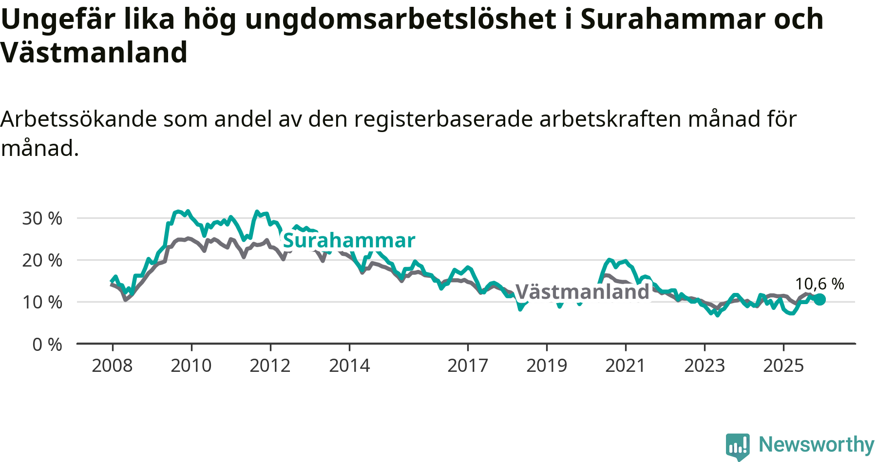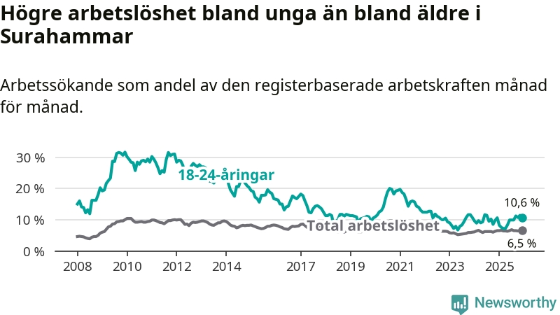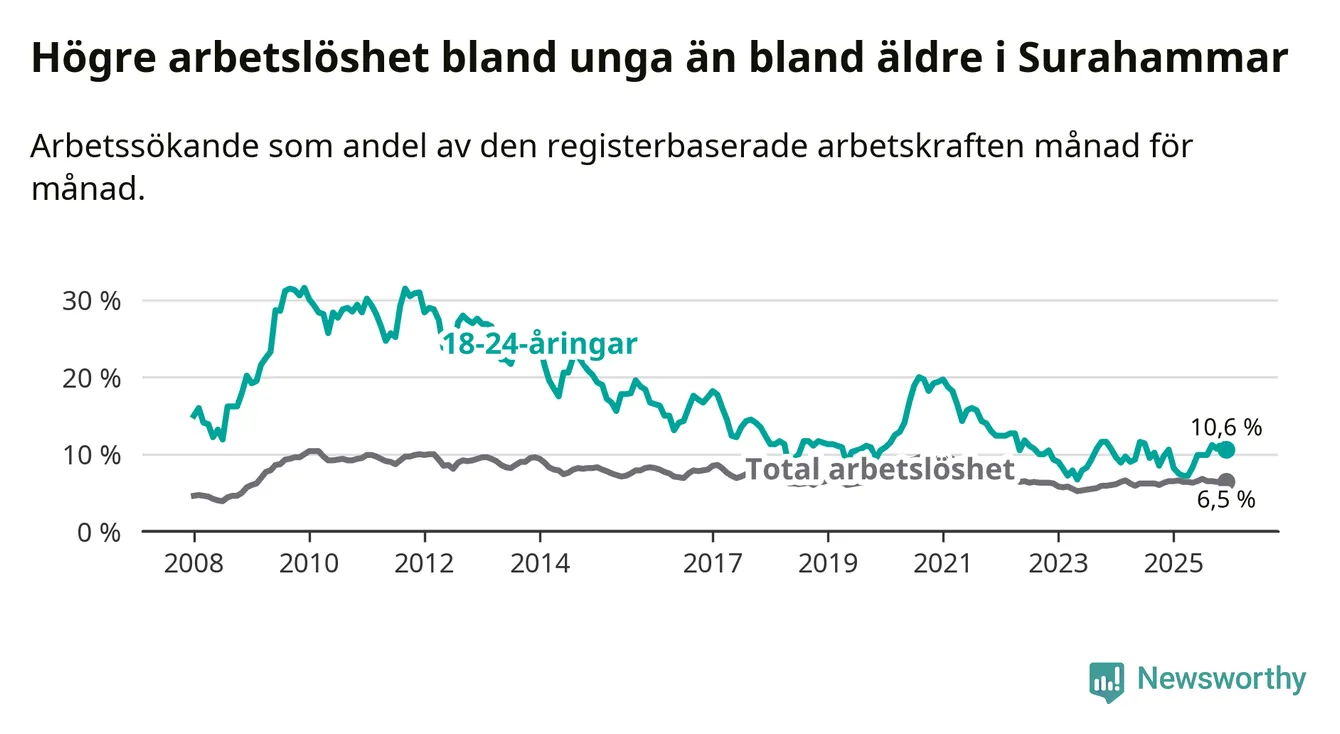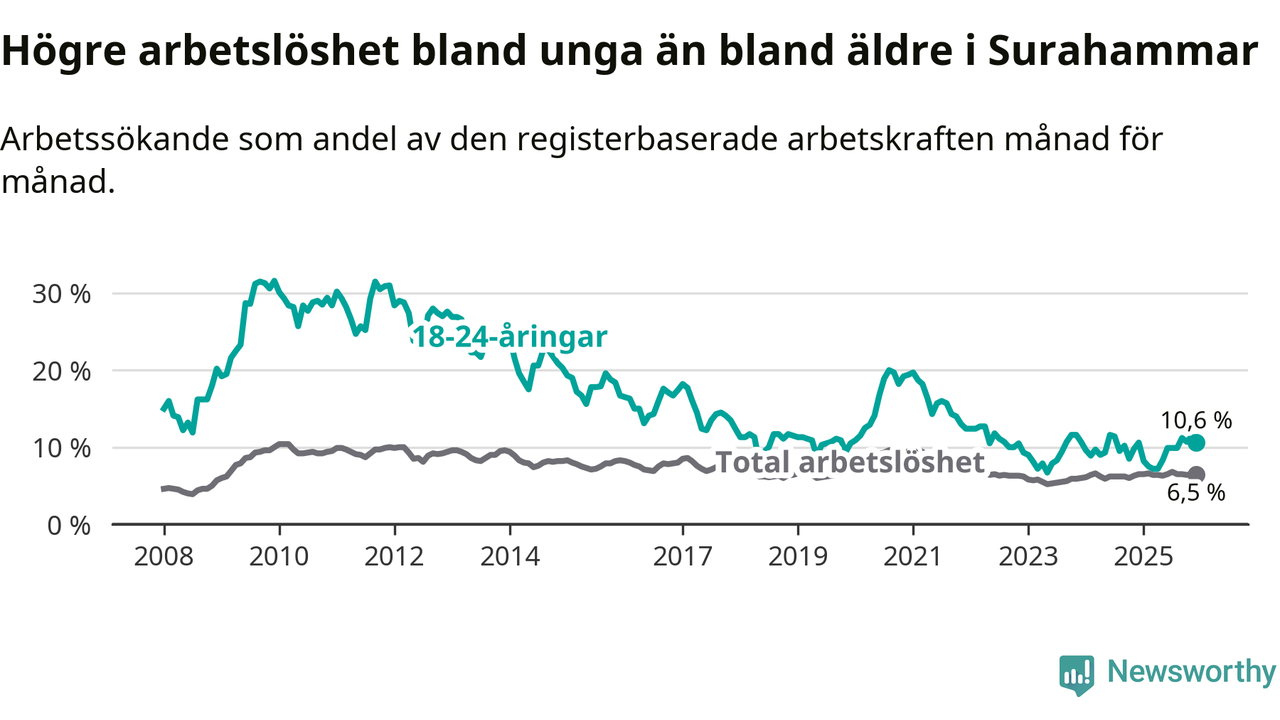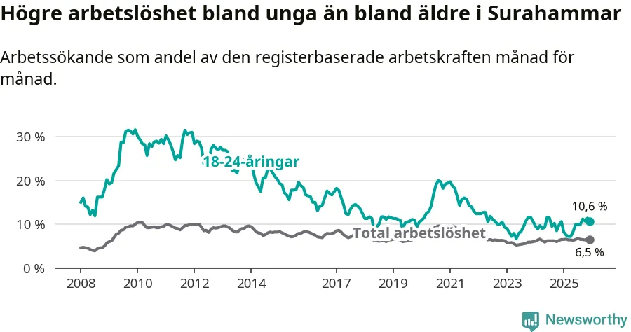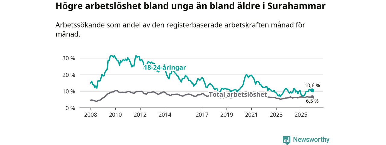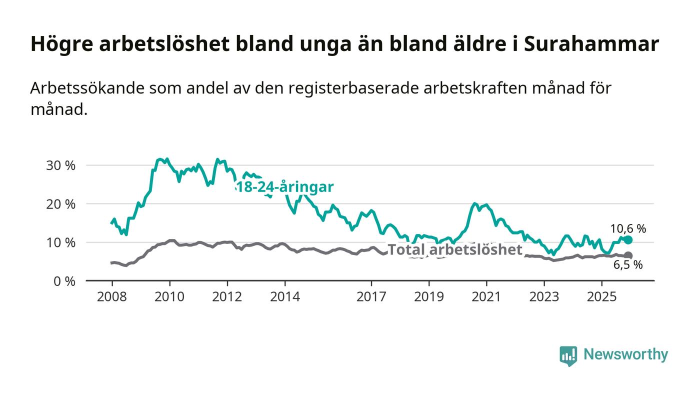 Medan Surahammar har lägre total arbetslöshet än Västmanland, ligger ungdomsarbetslösheten på i stort sett samma nivå.