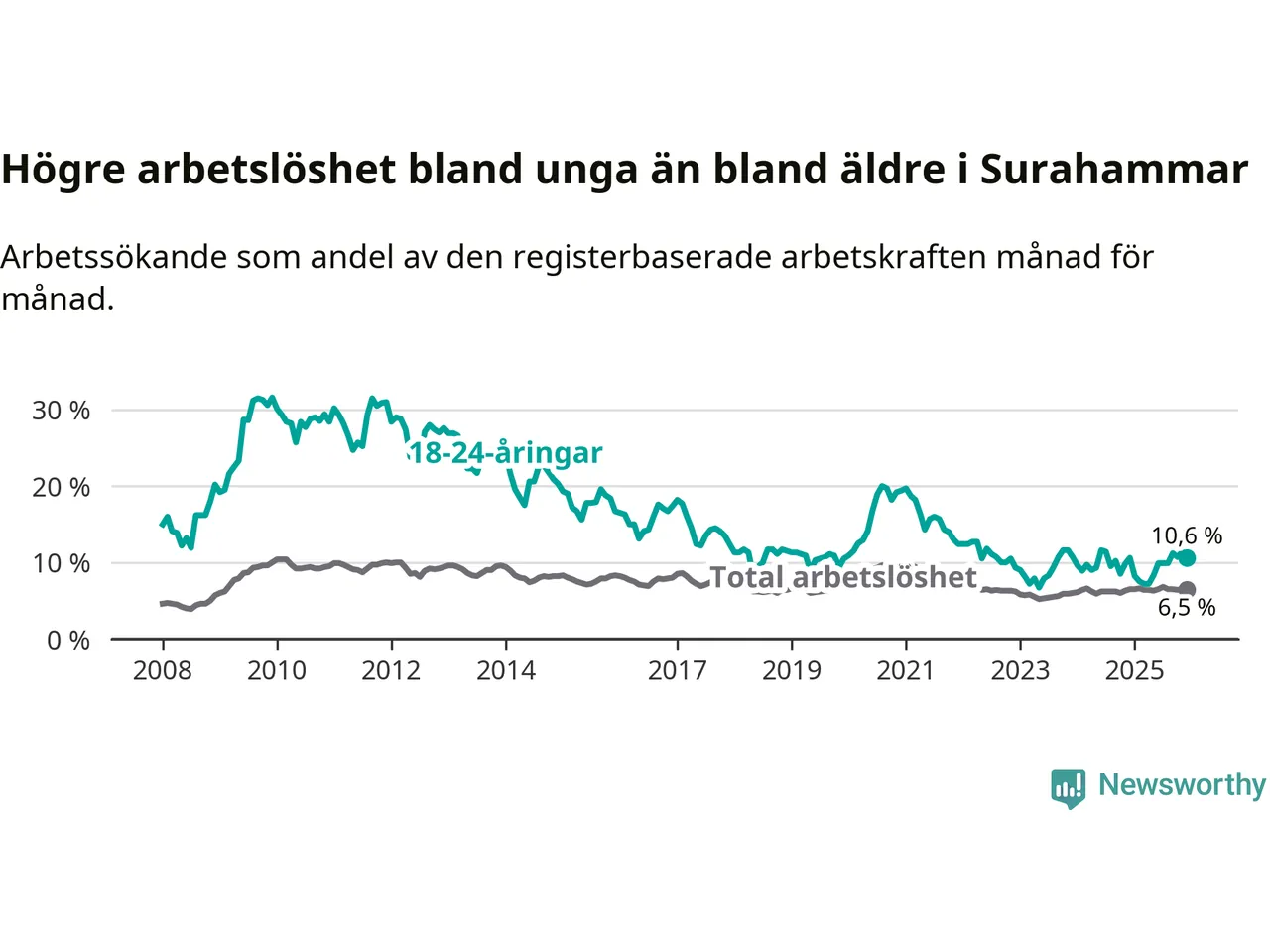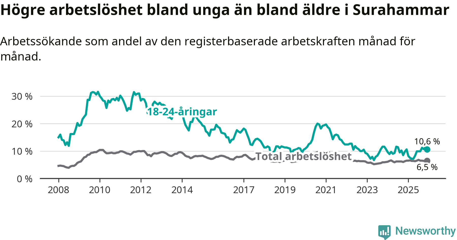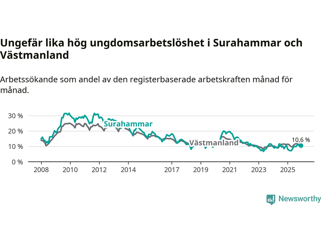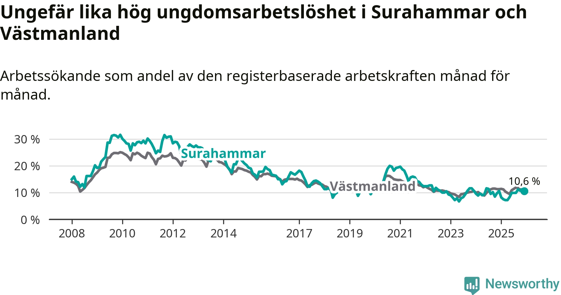 Medan Surahammar har lägre total arbetslöshet än Västmanland, ligger ungdomsarbetslösheten på i stort sett samma nivå.