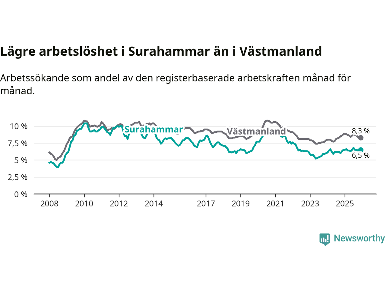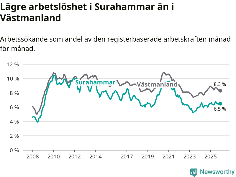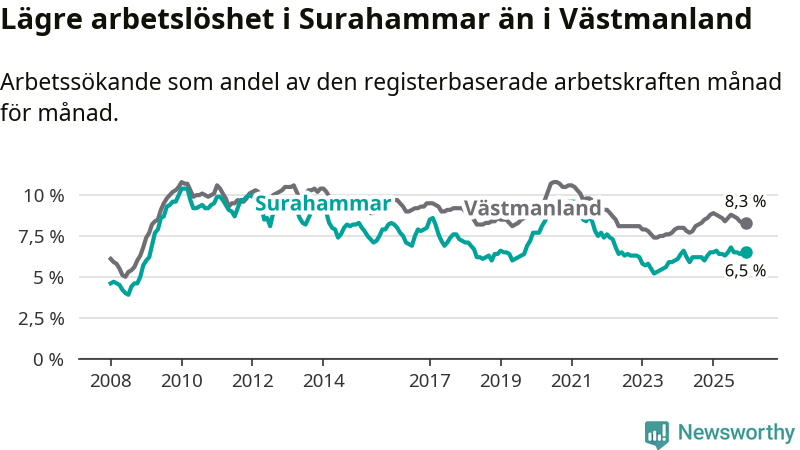 Graf: Arbetslöshet i Surahammars kommun och Västmanlands län