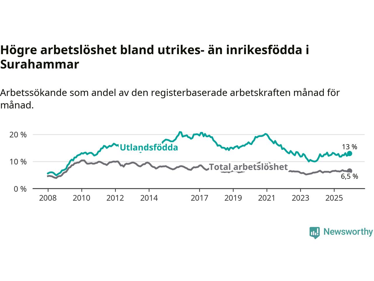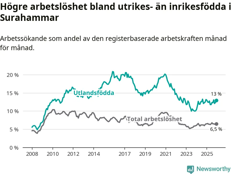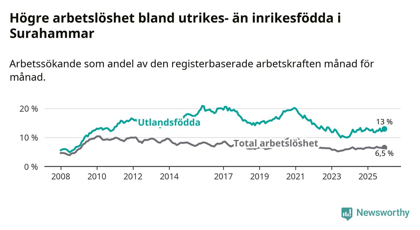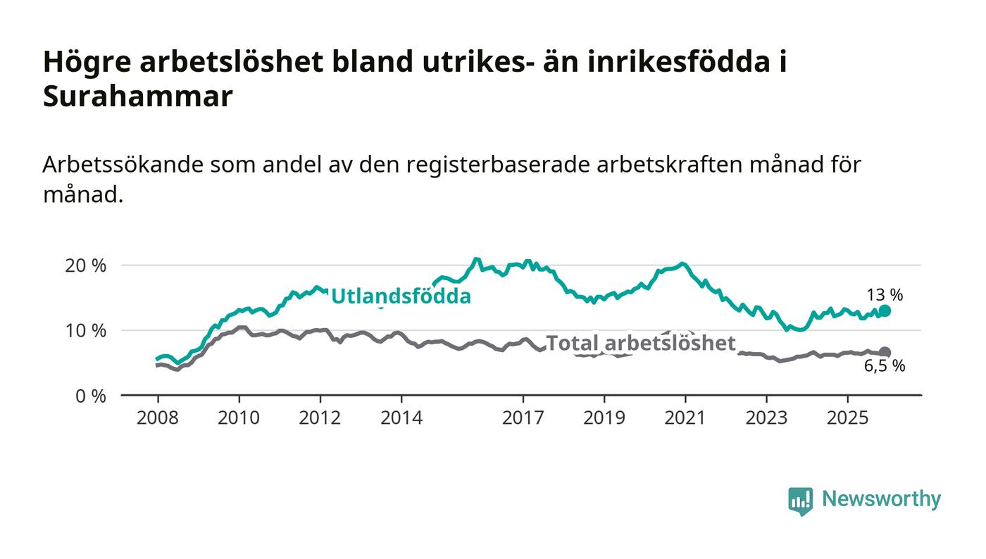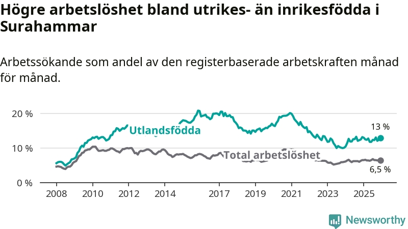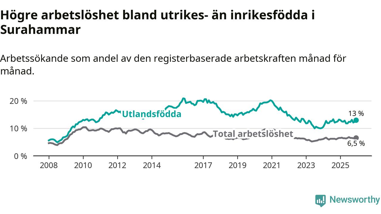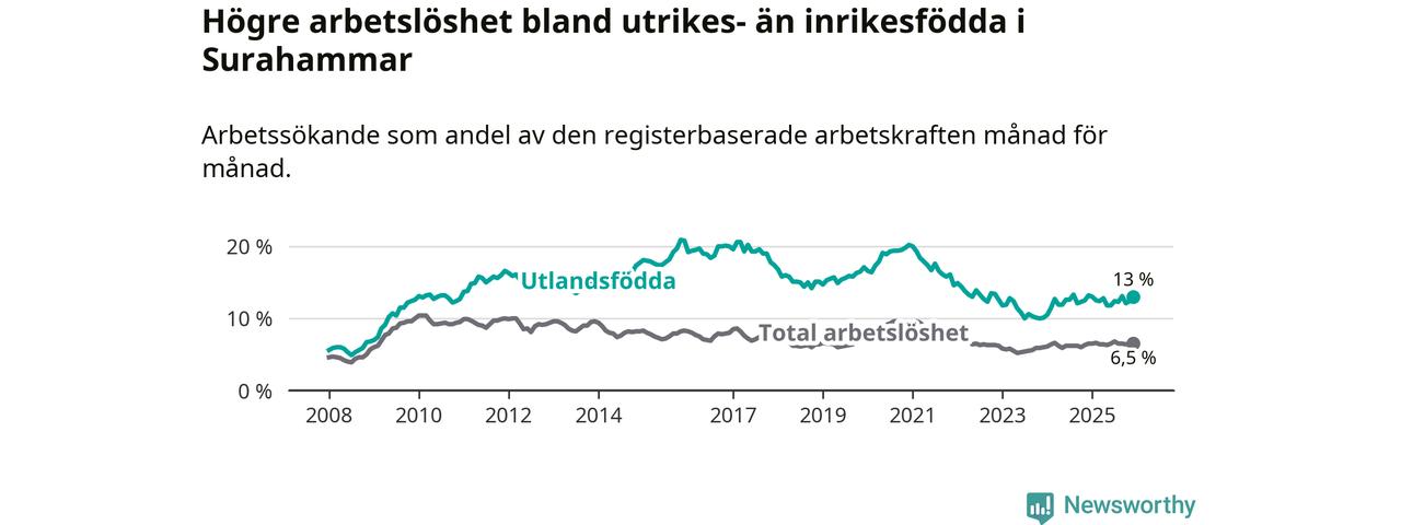 Arbetslösheten bland utlandsfödda var 13,0 procent i Surahammar under december månad, motsvarande 110 av 846 personer. Det är 0,2 procentenheter färre än vid samma tidpunkt i fjol (−2 om man räknar personer).