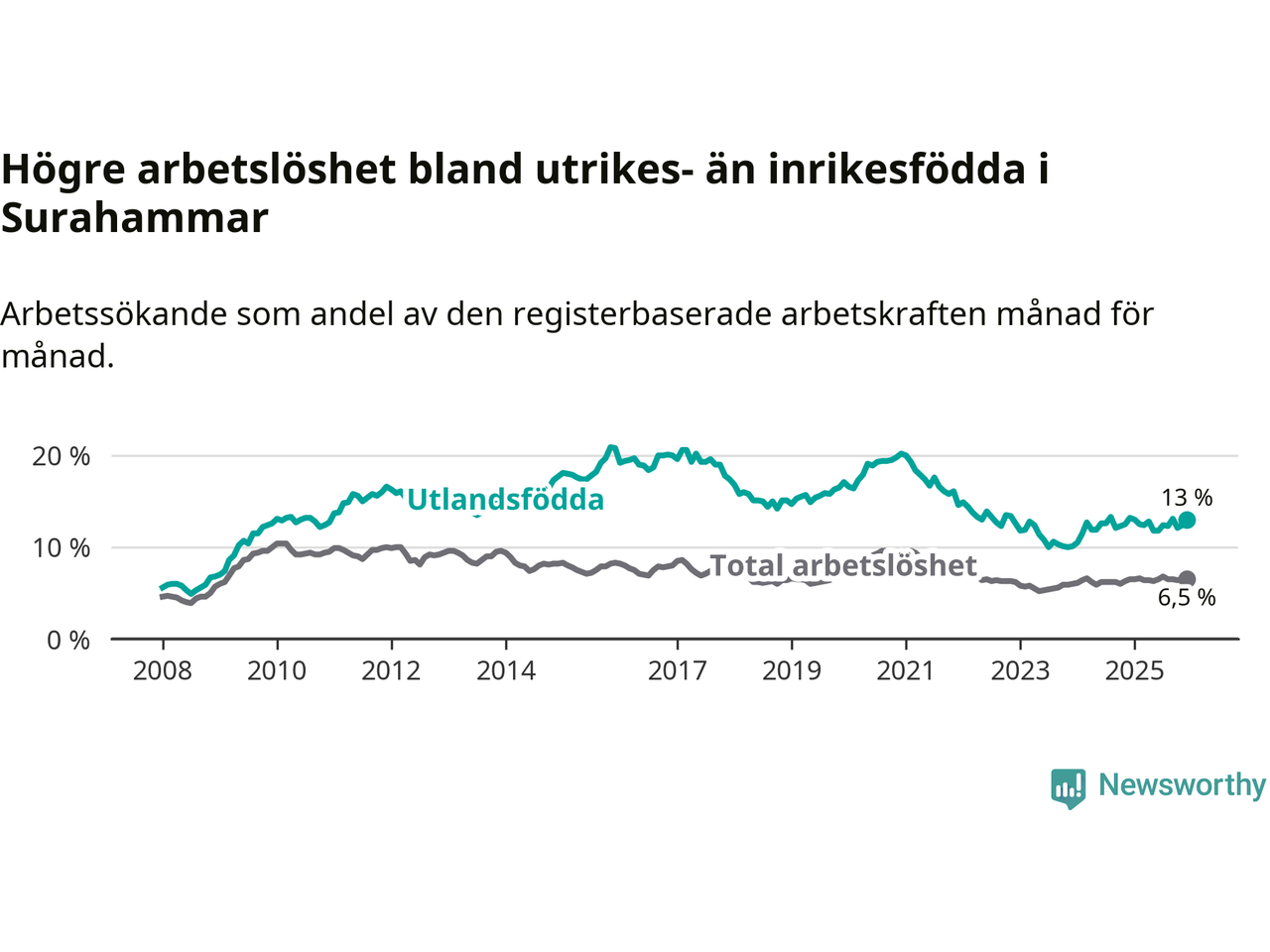 Skillnaden i arbetslöshet mellan utrikesfödda och hela befolkningen är 6,5 procentenheter i Surahammar.