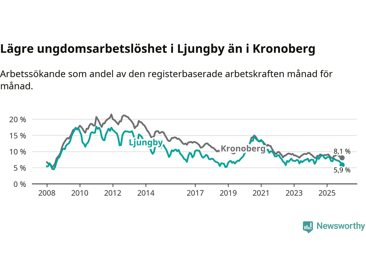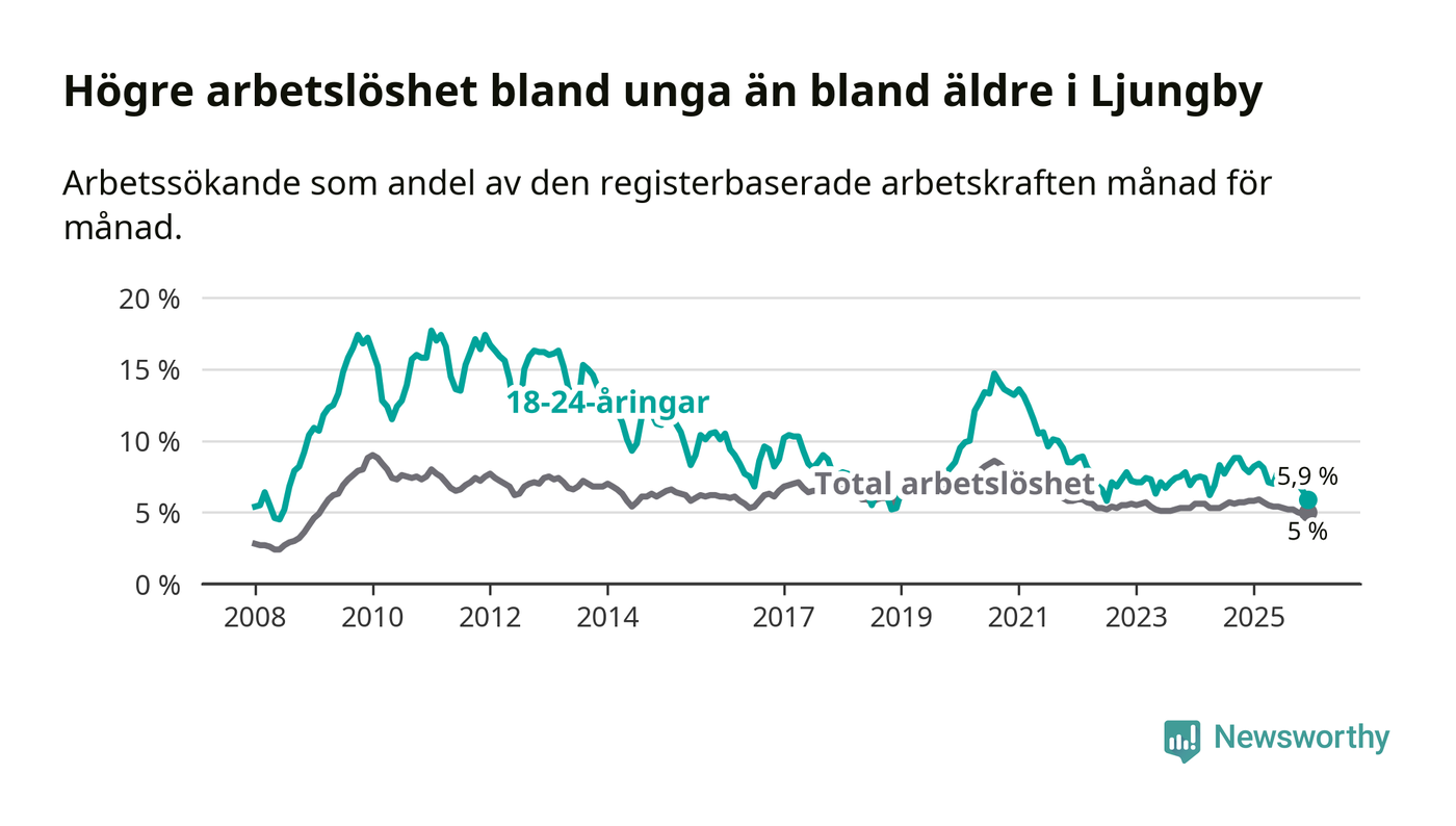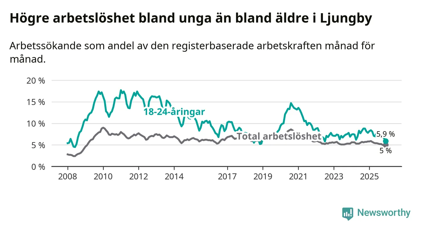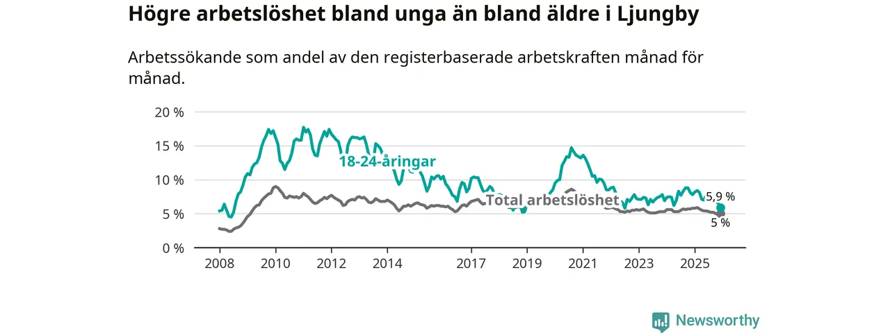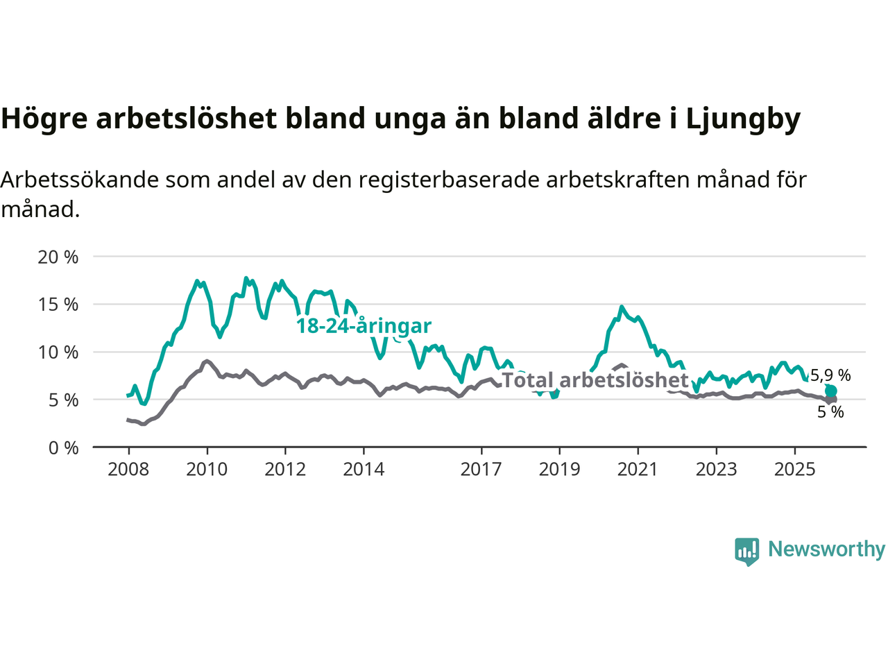 I och med den senaste månadens nedgång har de ungas arbetslöshet i Ljungby sjunkit sju månader i följd (ner från 7,0 procent i maj 2025 till 5,9 procent nu). Den nuvarande arbetslöshetsnivån är den lägsta sedan juli 2022.