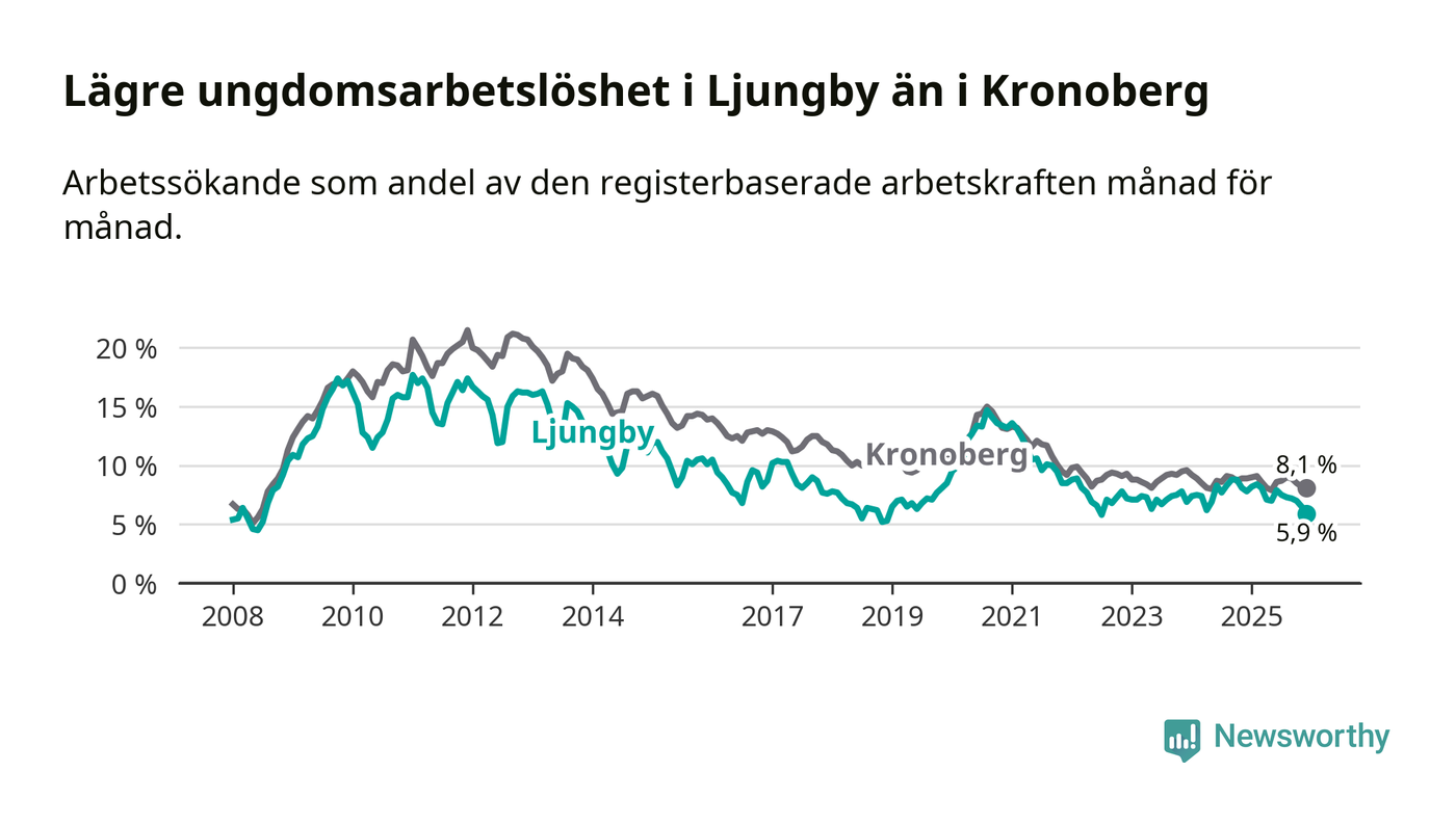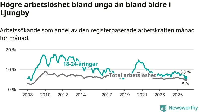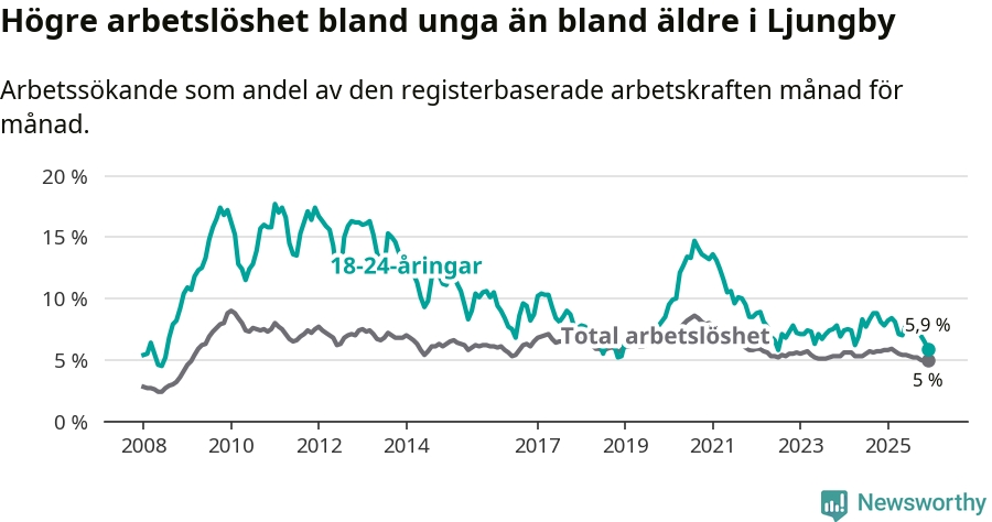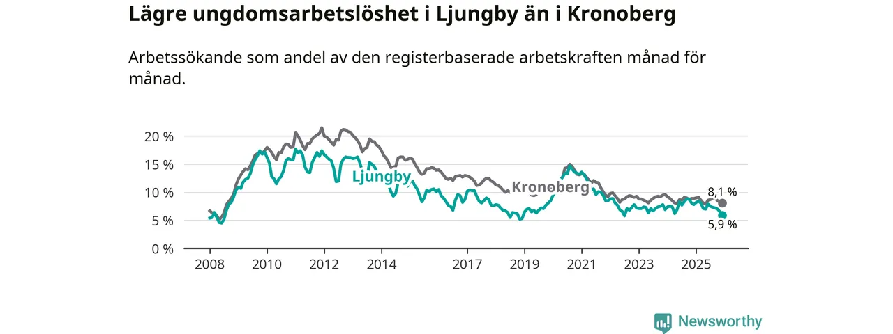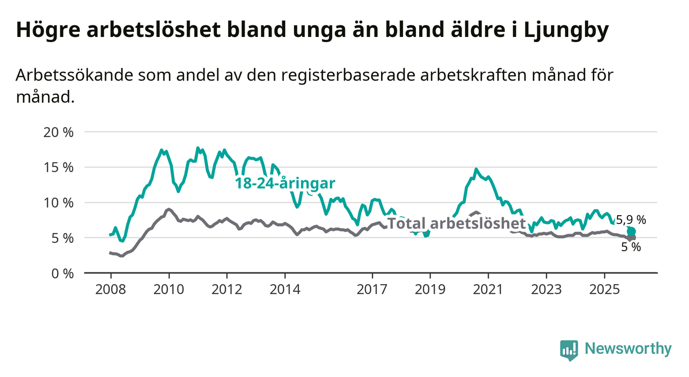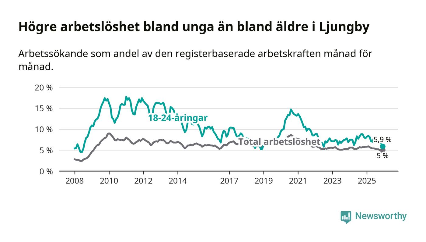 I och med den senaste månadens nedgång har de ungas arbetslöshet i Ljungby sjunkit sju månader i följd (ner från 7,0 procent i maj 2025 till 5,9 procent nu). Den nuvarande arbetslöshetsnivån är den lägsta sedan juli 2022.