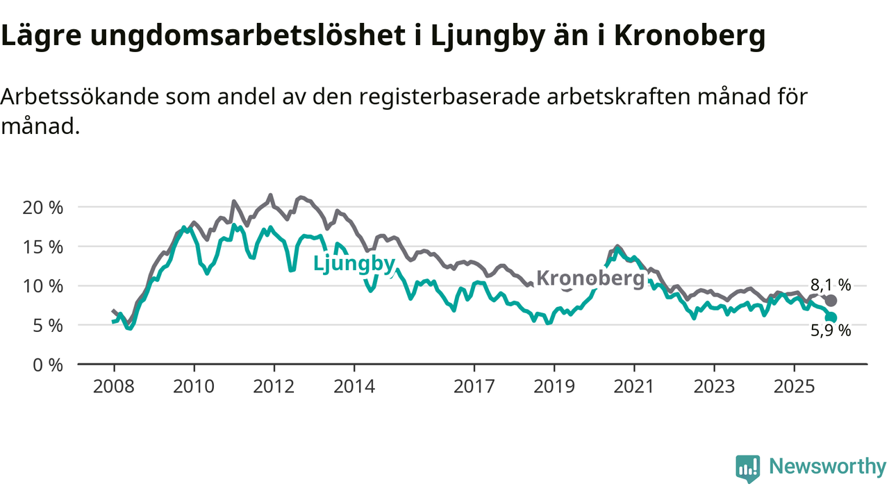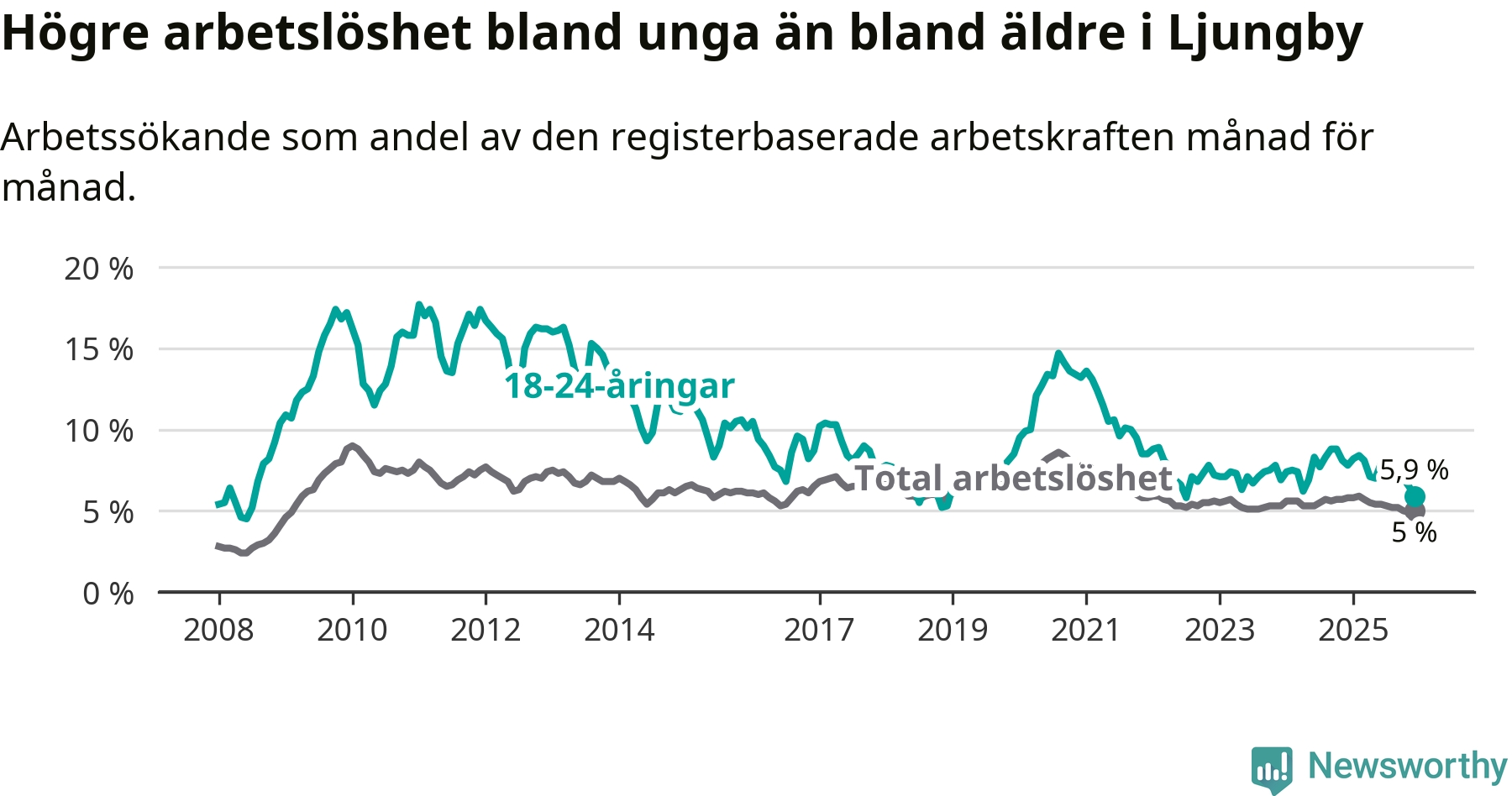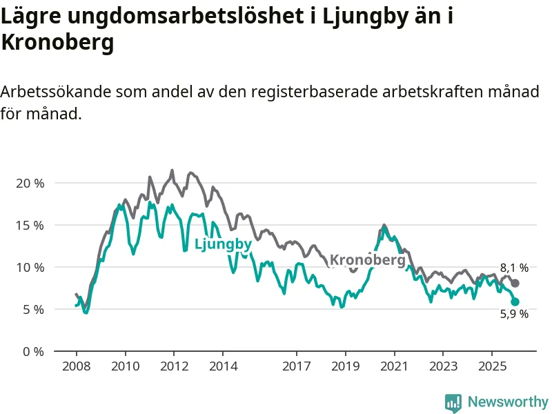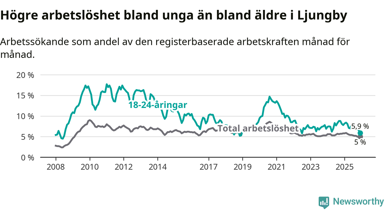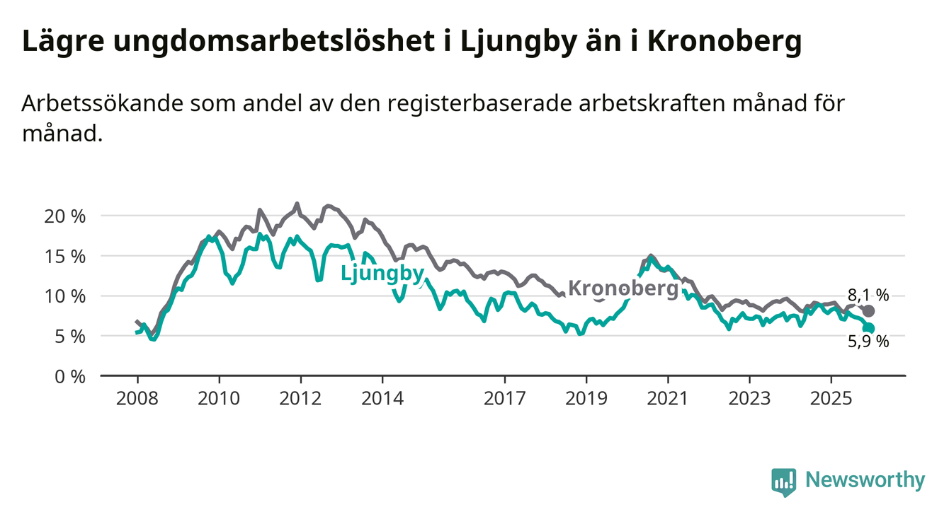 I och med den senaste månadens nedgång har de ungas arbetslöshet i Ljungby sjunkit sju månader i följd (ner från 7,0 procent i maj 2025 till 5,9 procent nu). Den nuvarande arbetslöshetsnivån är den lägsta sedan juli 2022.