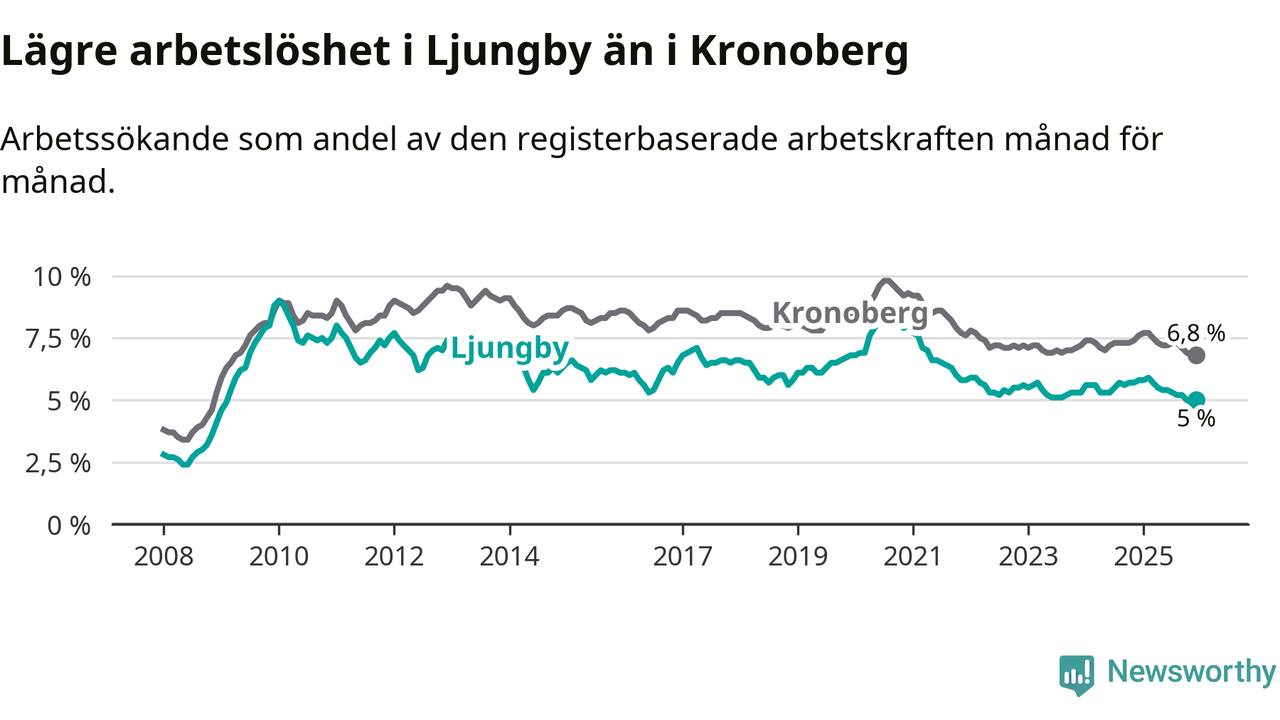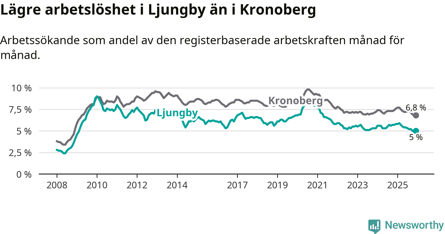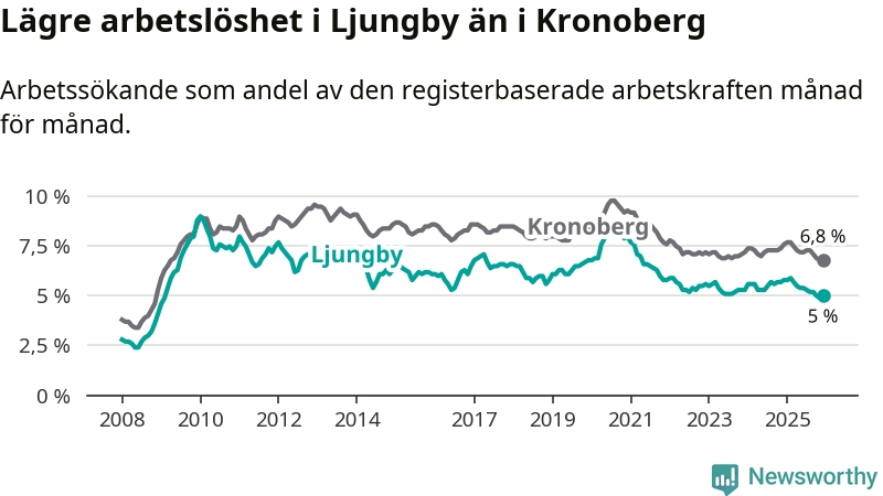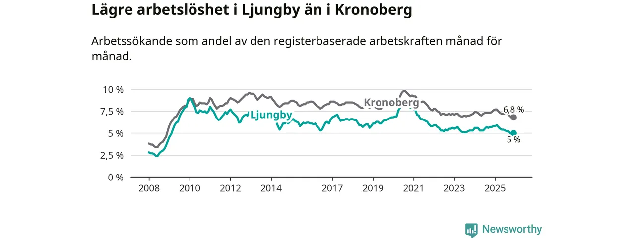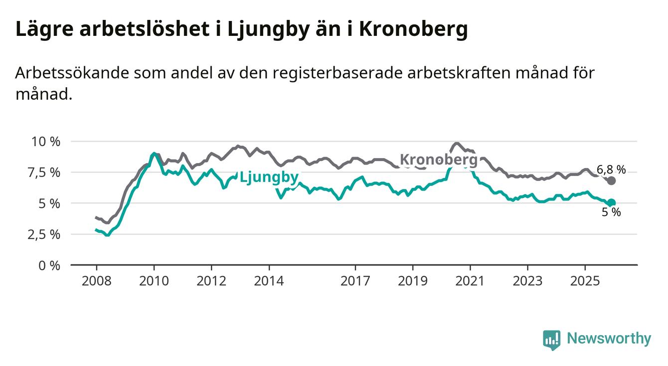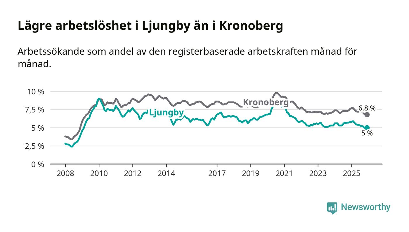 Ljungby hade redan tidigare lägre arbetslöshet än snittet i hela Kronobergs län och nu växer klyftan (5,0 procent i kommunen, jämfört med 6,8 procent i hela länet). Ljungby har därmed även den lägsta arbetslöshetsnivån i länet. Lessebo har den högsta (9,6 procent).