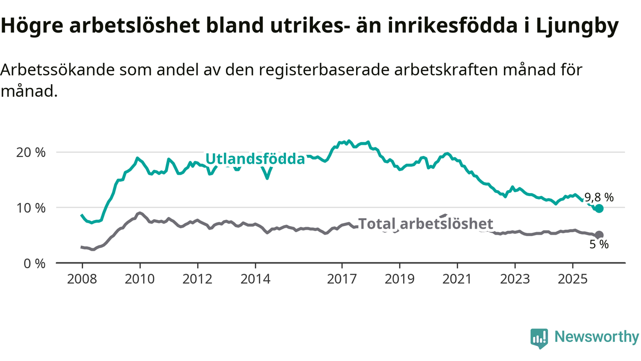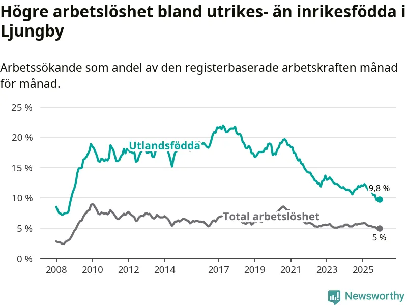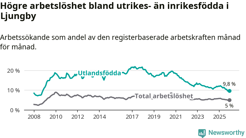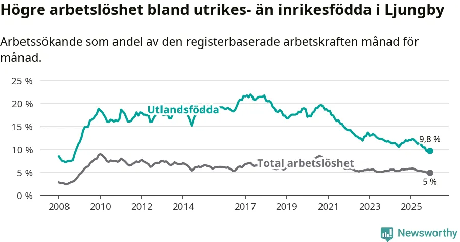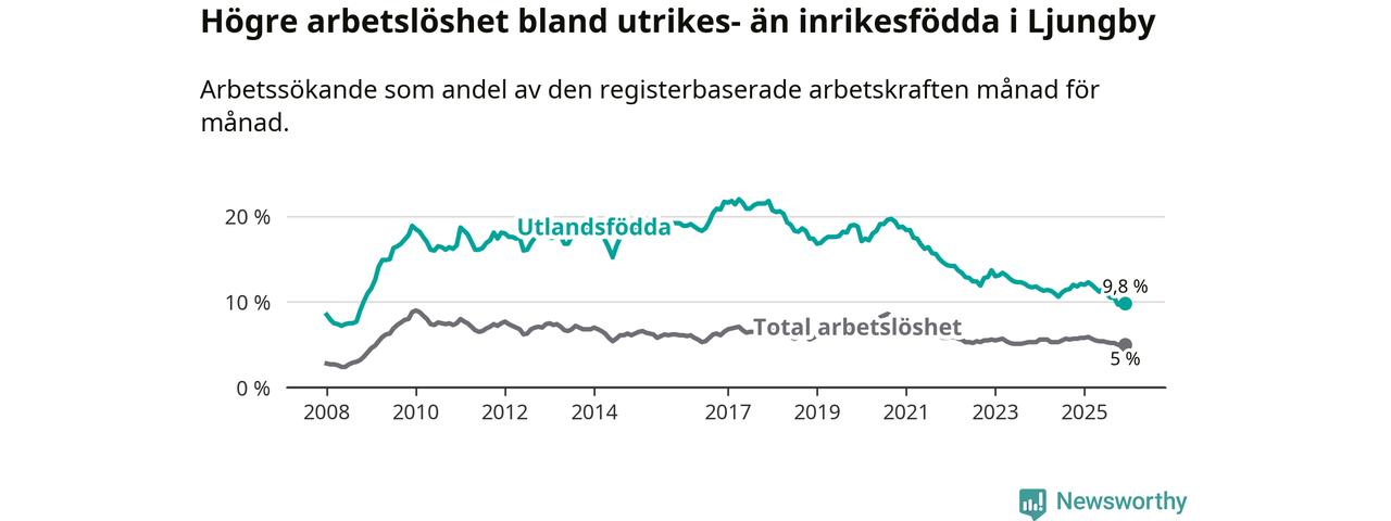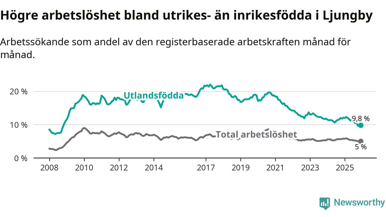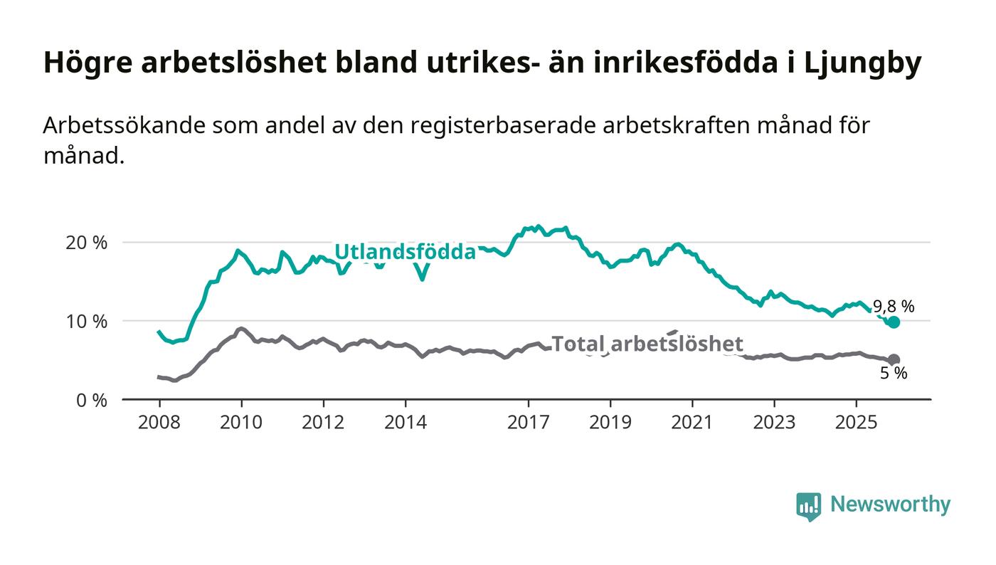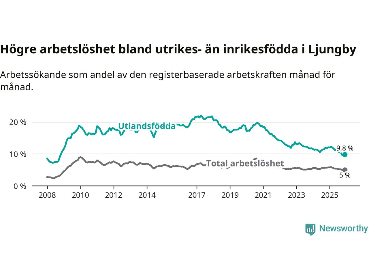Arbetslösheten bland utlandsfödda var 9,8 procent i Ljungby under december månad, motsvarande 333 av 3 398 personer. Det är 2,3 procentenheter färre än vid samma tidpunkt i fjol (−76 om man räknar personer). Därmed är de utlandsföddas arbetslöshet lägre än vid samma tidpunkt i fjol för sjätte månaden i följd. Sedan juni 2025 har arbetslösheten bland utlandsfödda minskat från 11,5 till 9,8 procent.