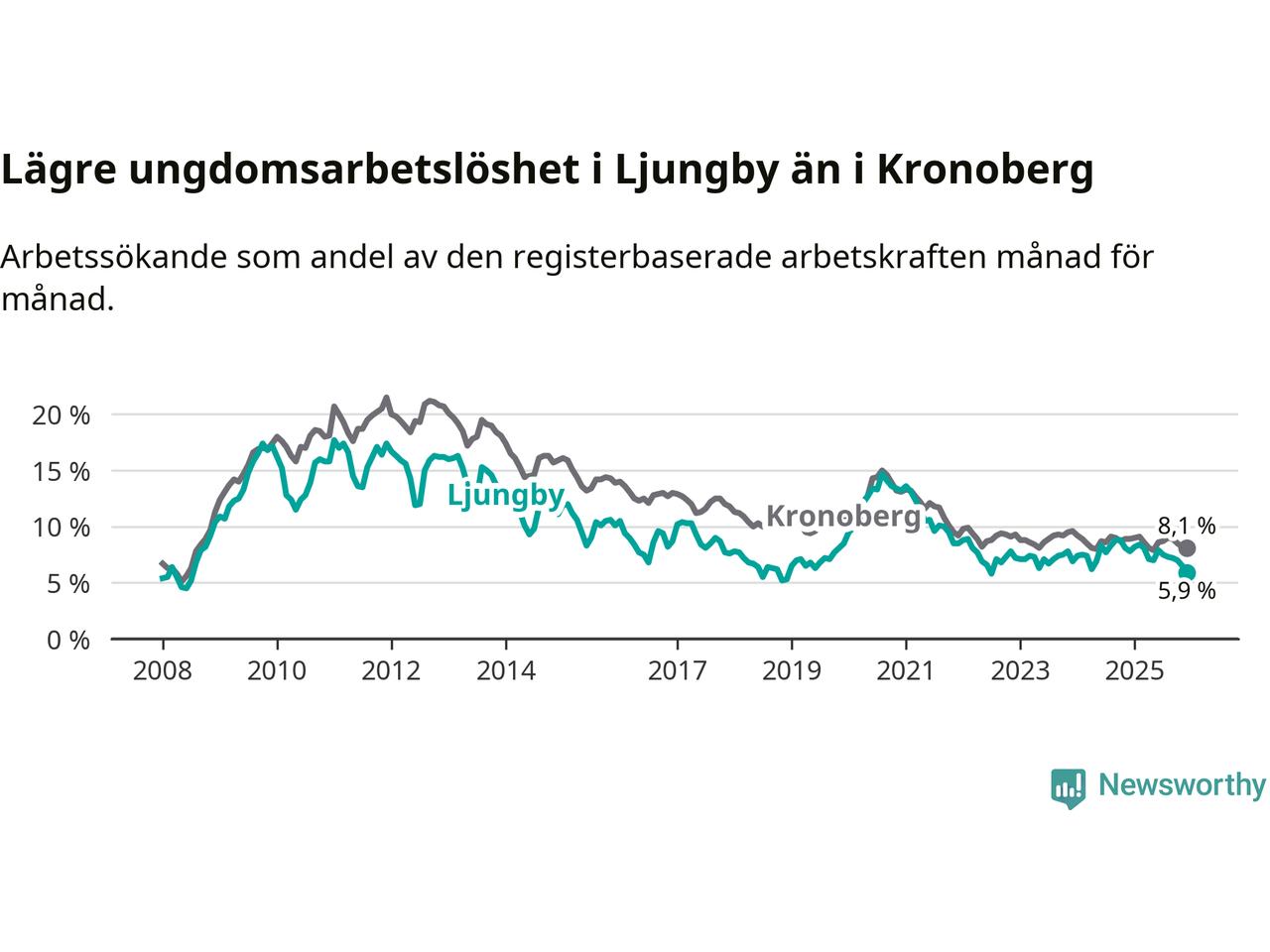 Precis som den totala arbetslösheten ligger ungdomsarbetslösheten i Ljungby lägre än i Kronoberg som helhet. Skillnaden mellan kommunen och länet är 2,2 procentenheter.