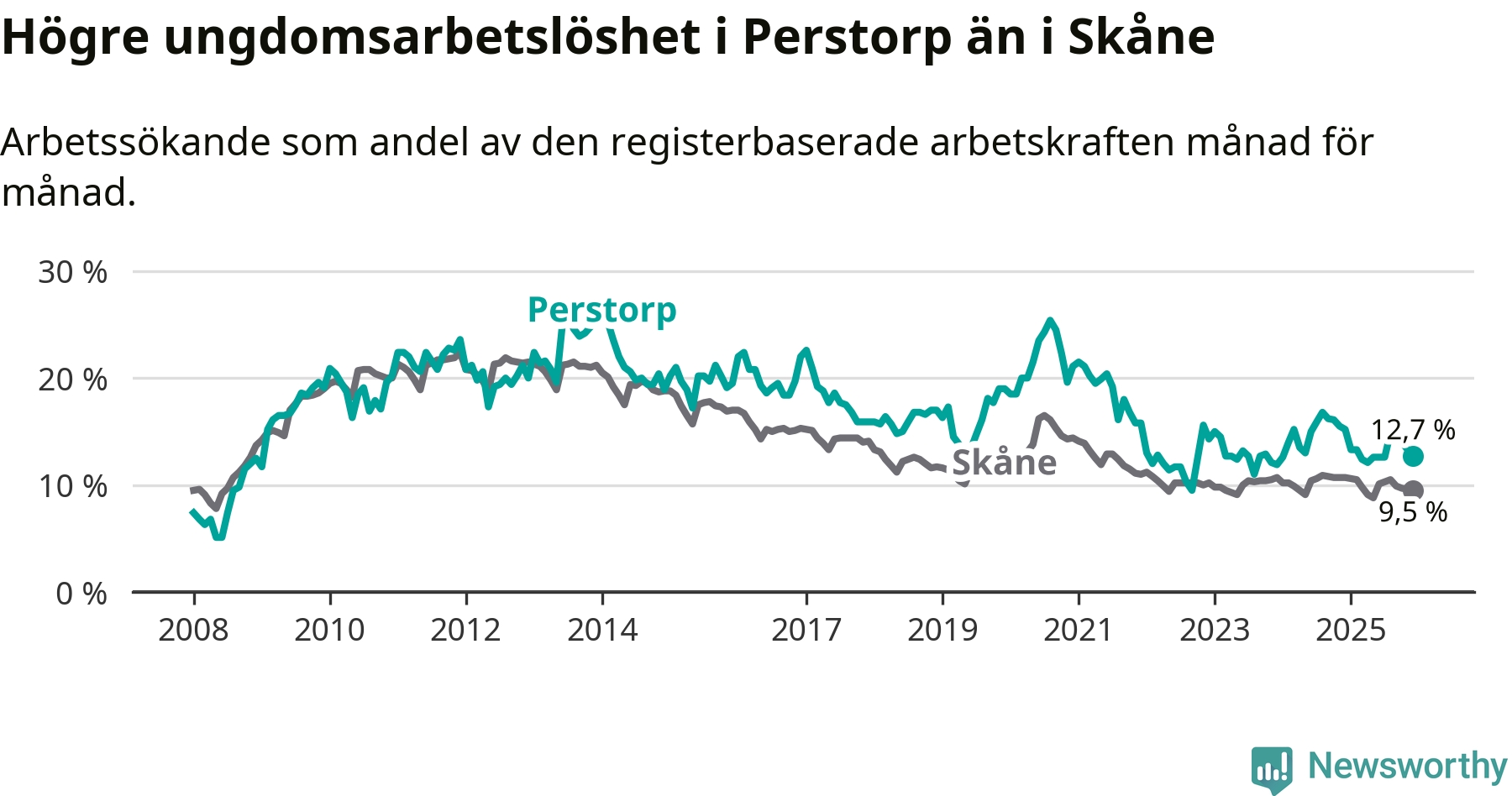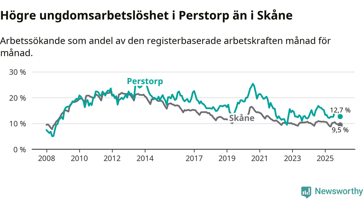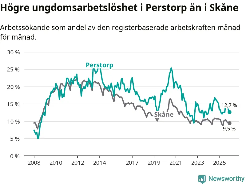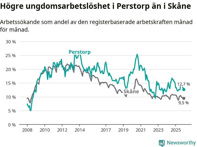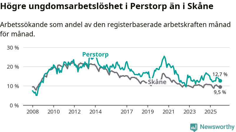 Precis som den totala arbetslösheten ligger ungdomsarbetslösheten i Perstorp högre än i Skåne som helhet. Skillnaden mellan kommunen och länet är 3,2 procentenheter.