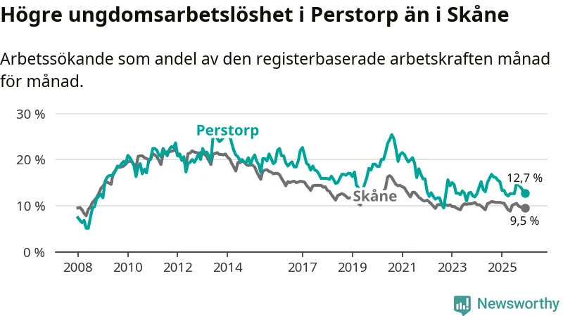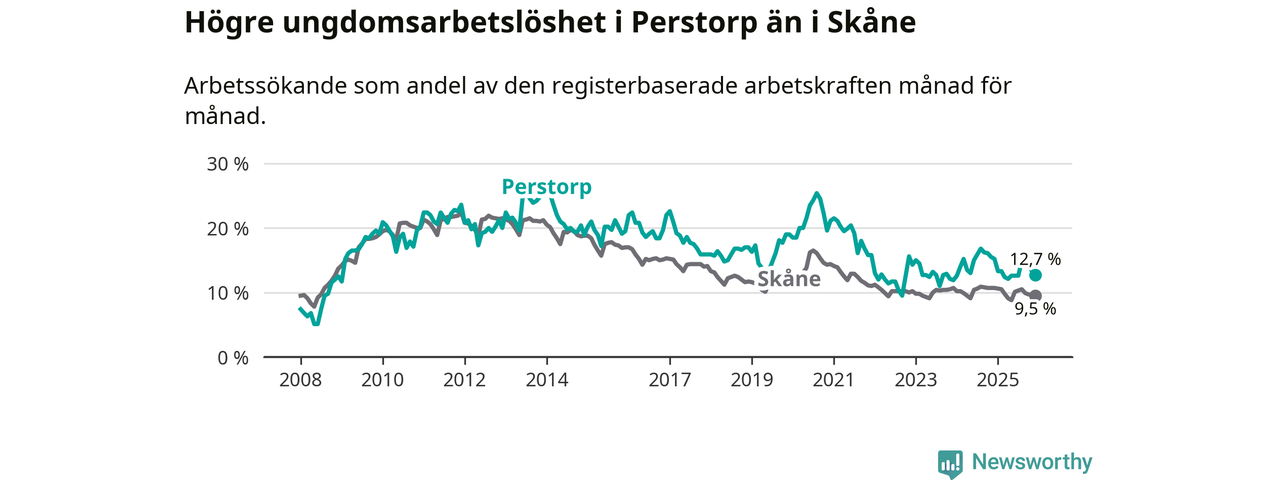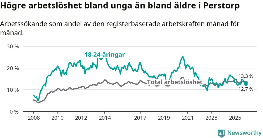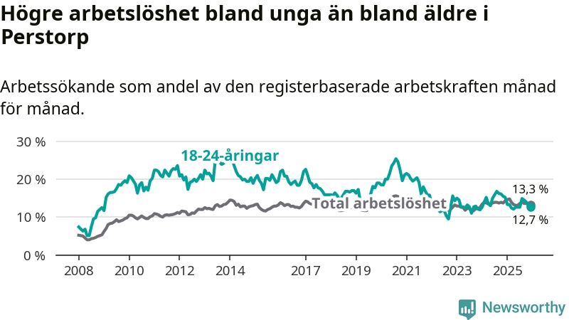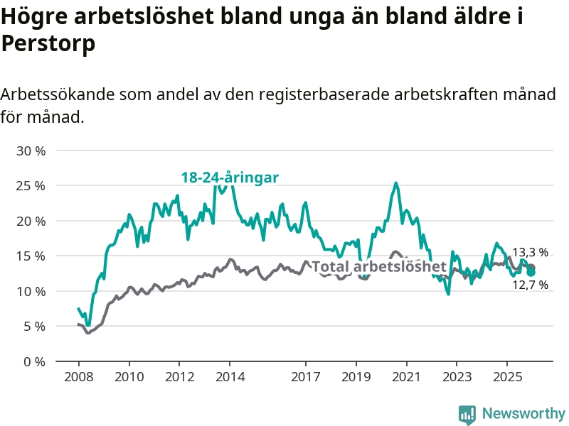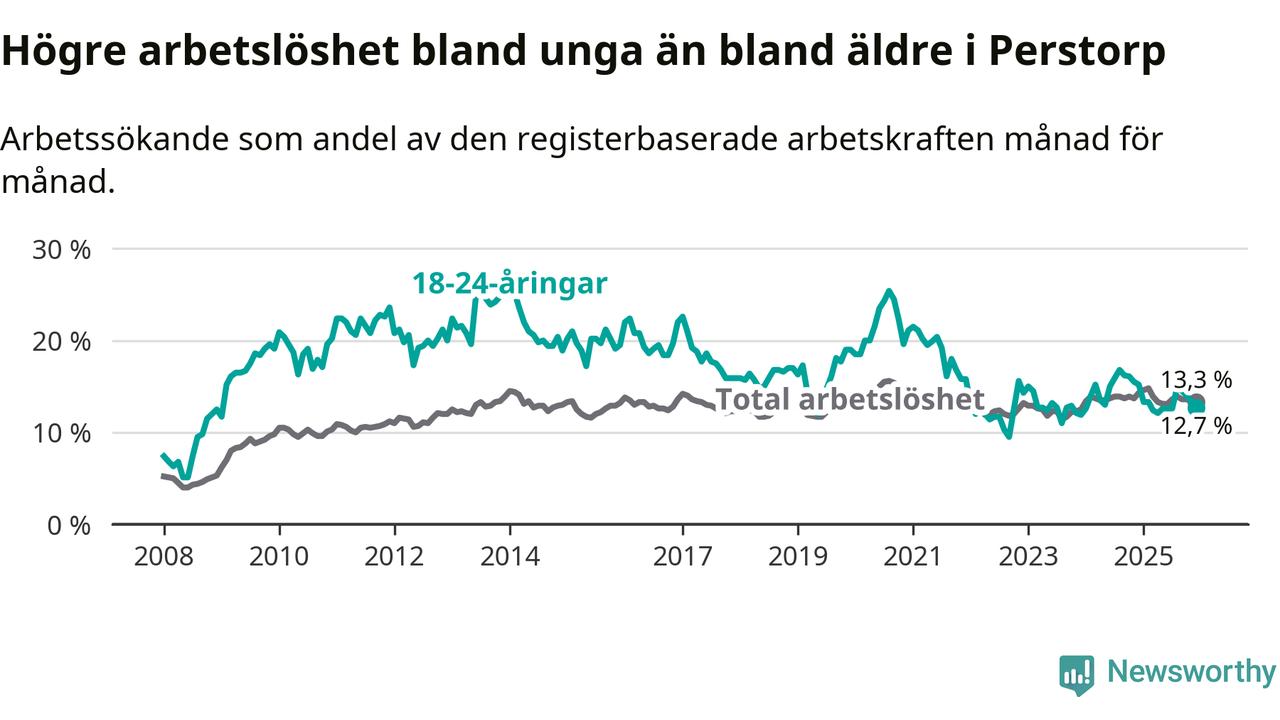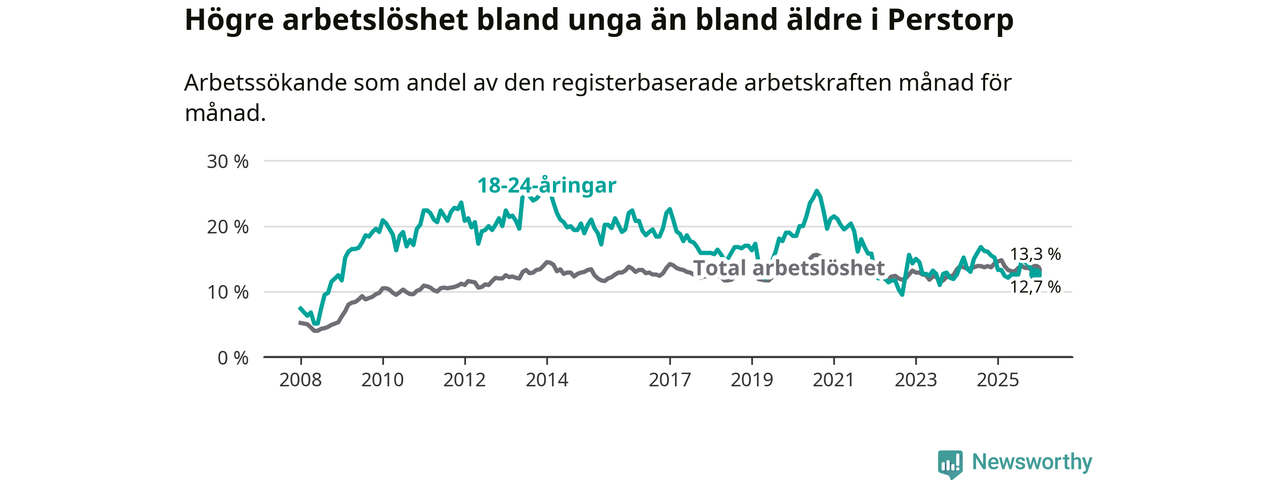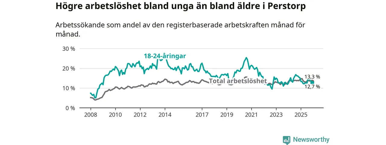I och med den senaste månadens nedgång har de ungas arbetslöshet i Perstorp sjunkit elva månader i följd (ner från 13,3 procent i januari 2025 till 12,7 procent nu).