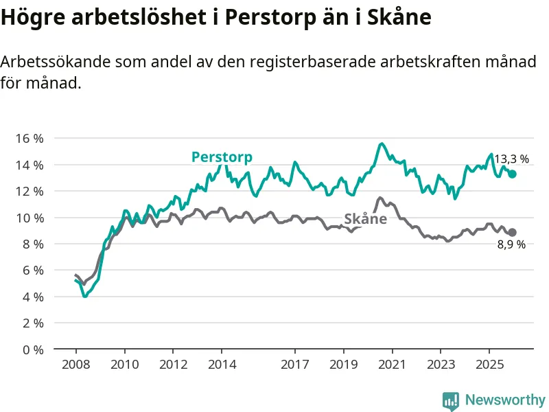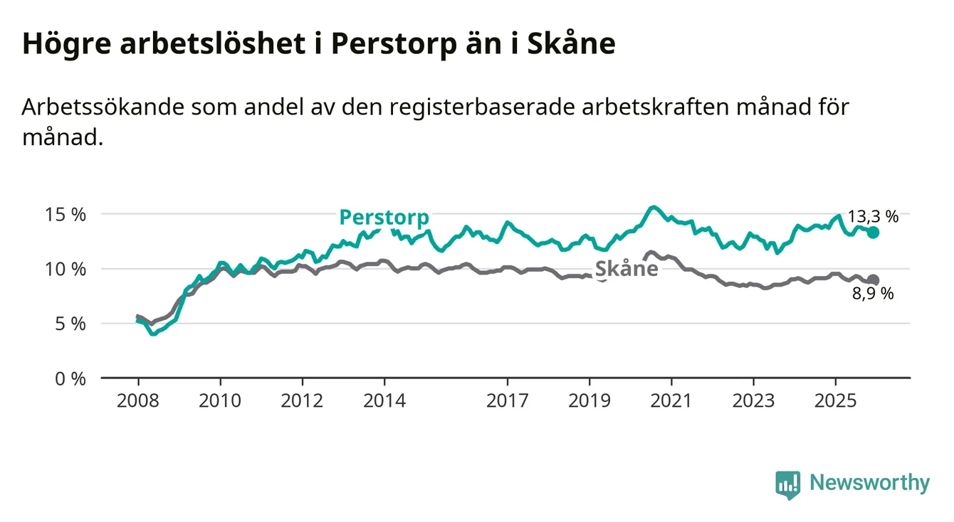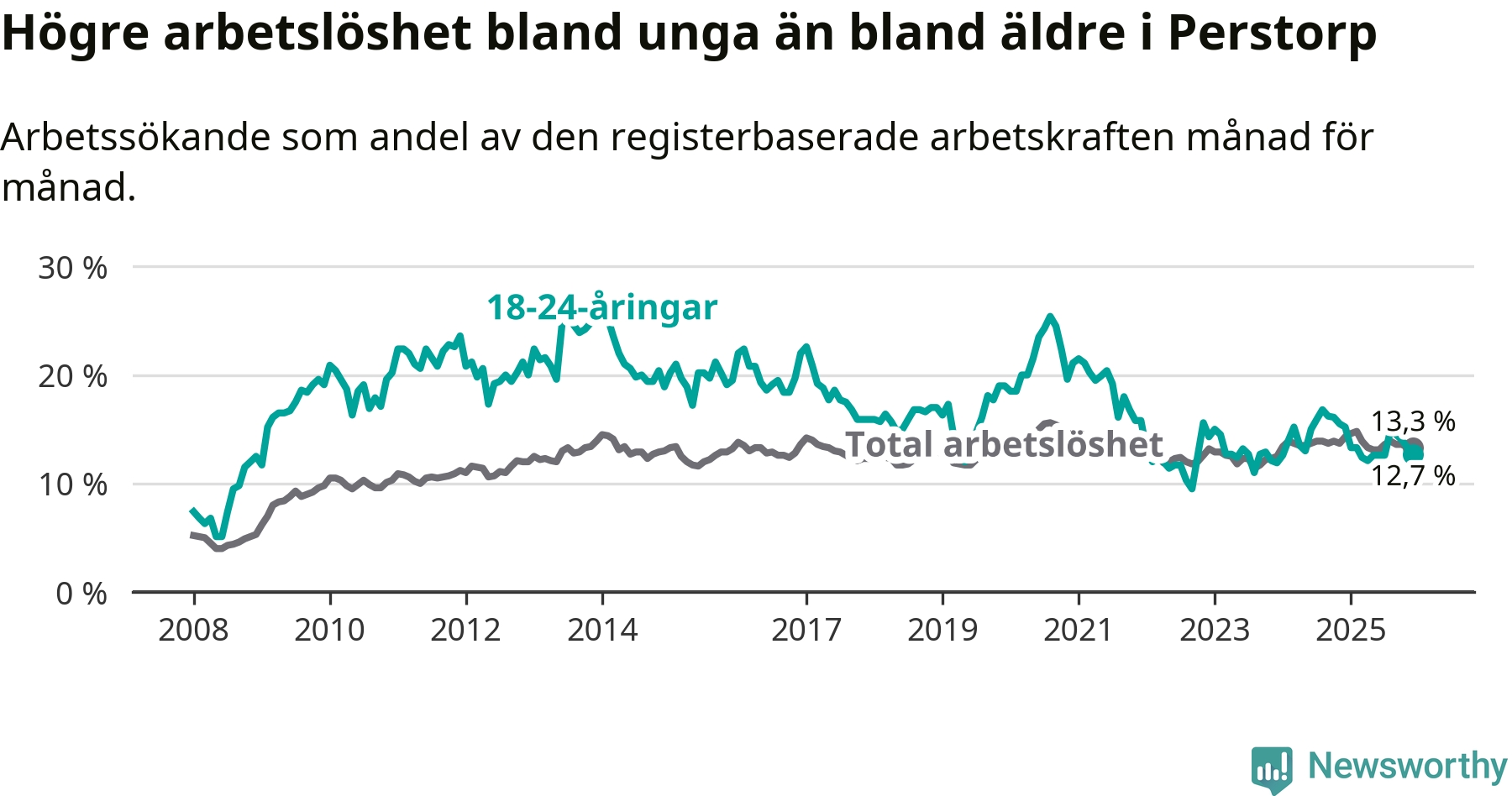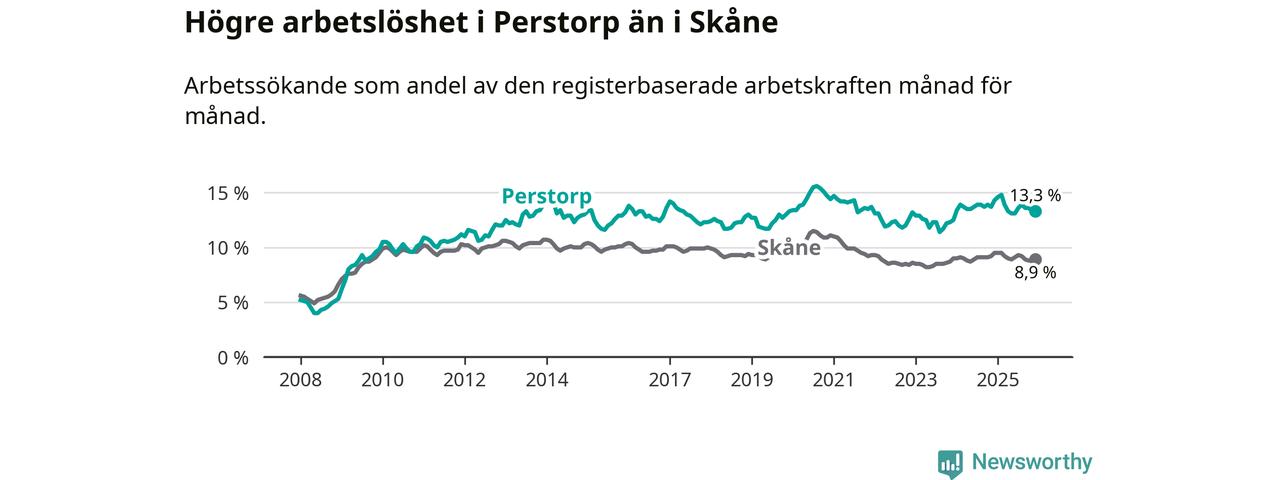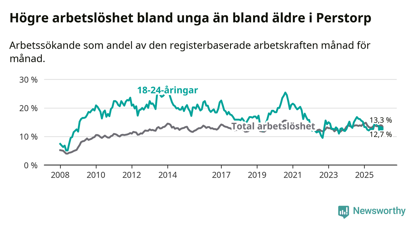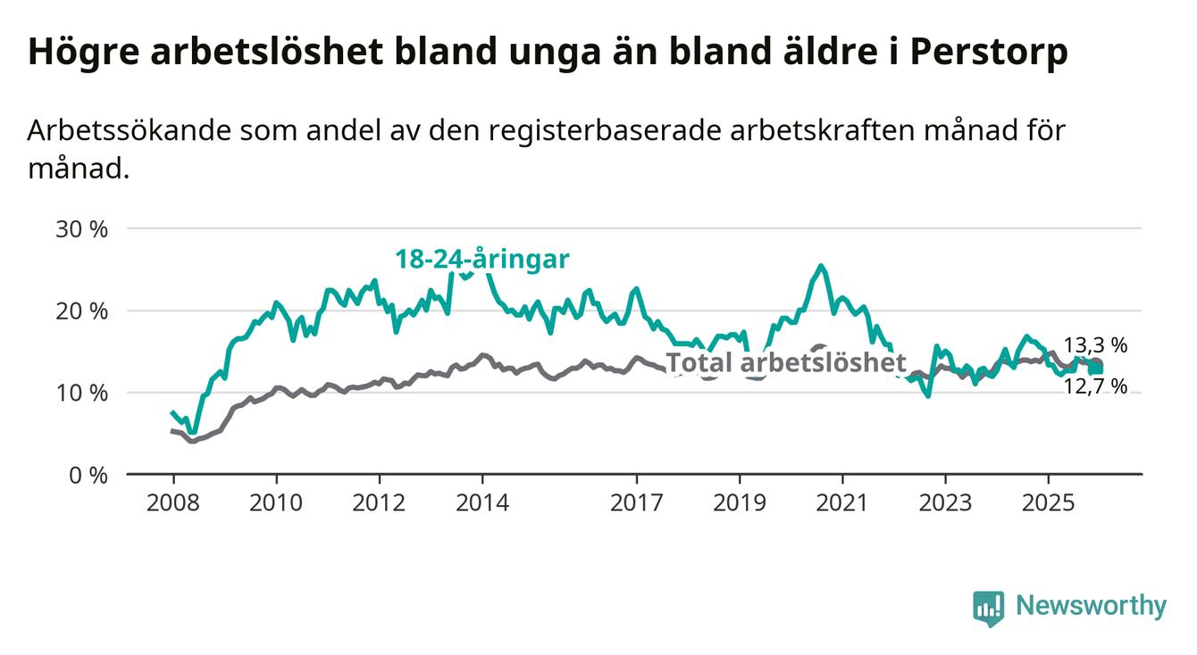 I och med den senaste månadens nedgång har de ungas arbetslöshet i Perstorp sjunkit elva månader i följd (ner från 13,3 procent i januari 2025 till 12,7 procent nu).
