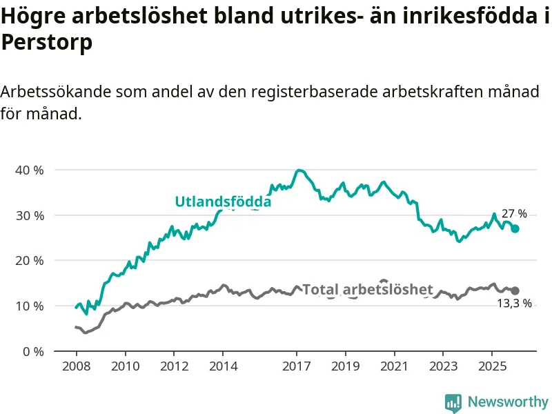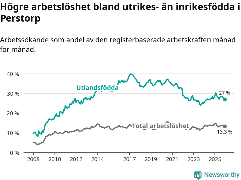 Arbetslösheten bland utlandsfödda var 27,0 procent i Perstorp under december månad, motsvarande 273 av 1 011 personer. Det är 1,0 procentenheter färre än vid samma tidpunkt i fjol (−5 om man räknar personer). Den senaste månadens nedgång innebär ett trendbrott. Under de ett föregående månaderna hade arbetslösheten bland utlandsfödda varit högre än motsvarande tidpunkt året innan.