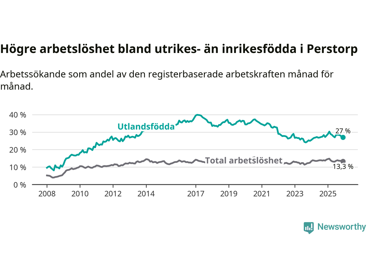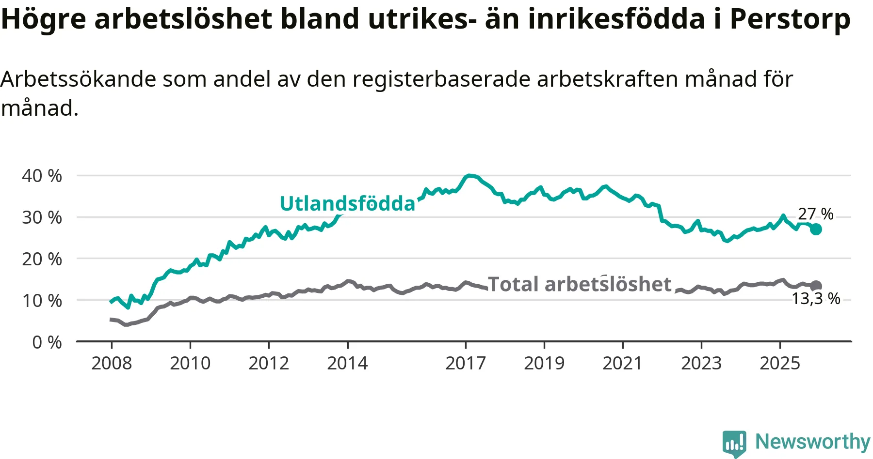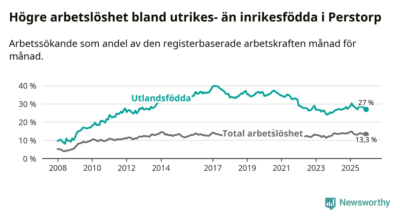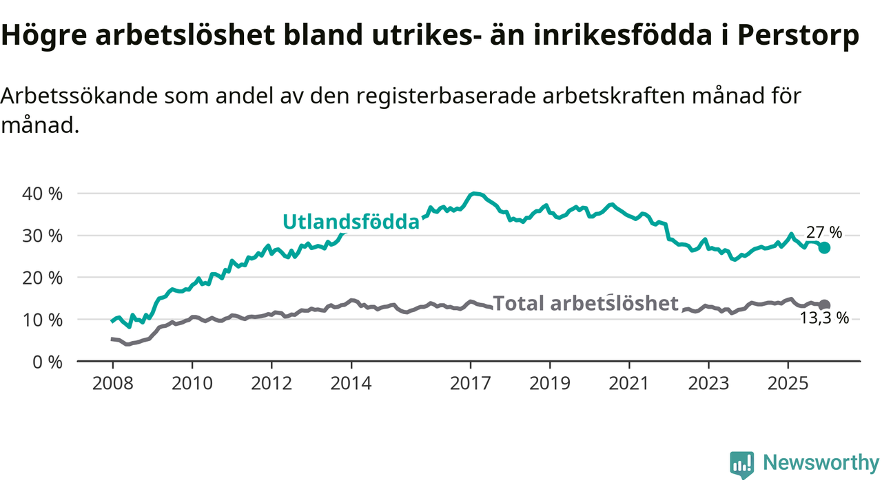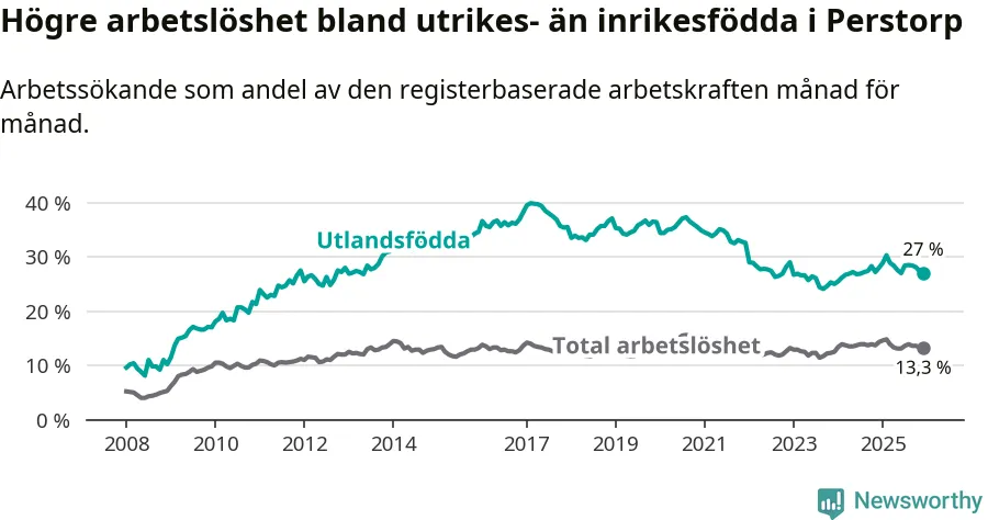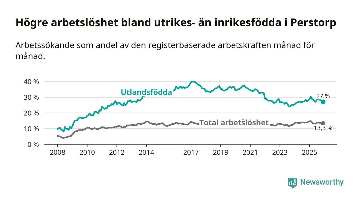 Skillnaden i arbetslöshet mellan utrikesfödda och hela befolkningen är 13,7 procentenheter i Perstorp. Det är ungefär samma skillnad som för ett år sedan.