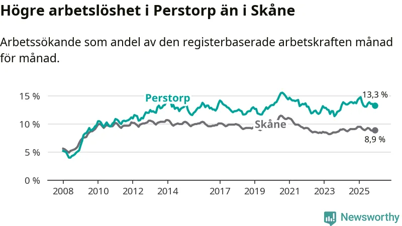 Under december månad rapporterade Perstorps kommun en total arbetslöshet på 13,3 procent. Det är en minskning jämfört med samma tidpunkt i fjol (−1,0 procentenheter). Även i Skåne län sjunker arbetslösheten .