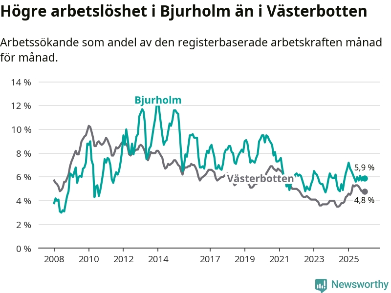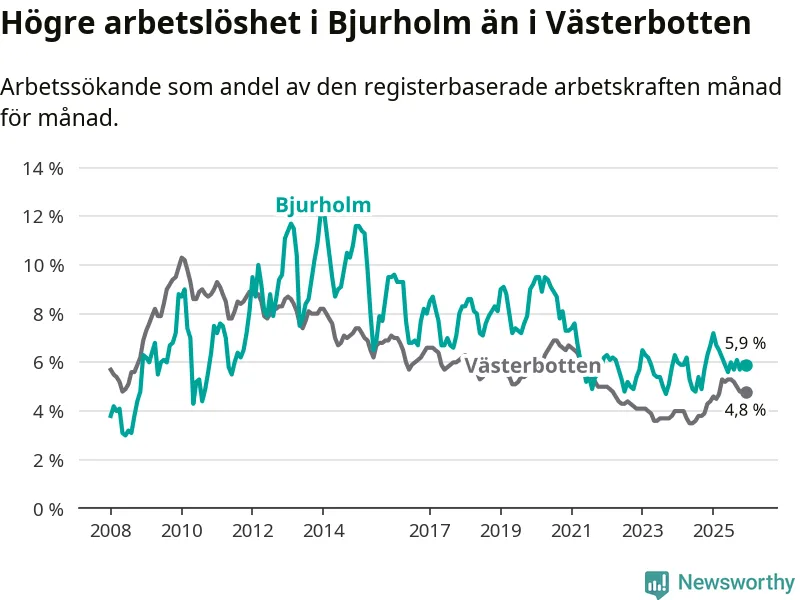 Under december månad rapporterade Bjurholms kommun en total arbetslöshet på 5,9 procent. Det är en minskning jämfört med samma tidpunkt i fjol (−0,8 procentenheter). I Västerbottens län däremot stiger arbetslösheten .