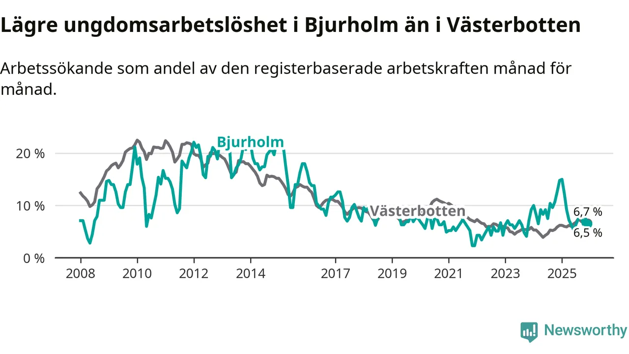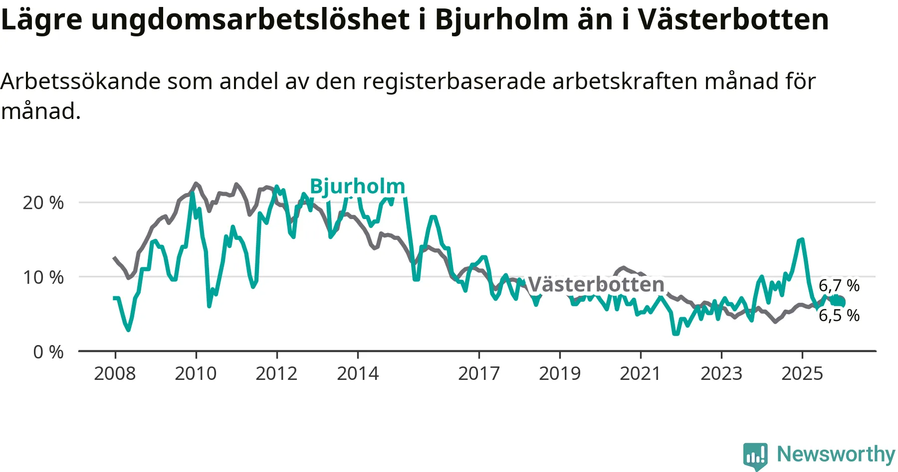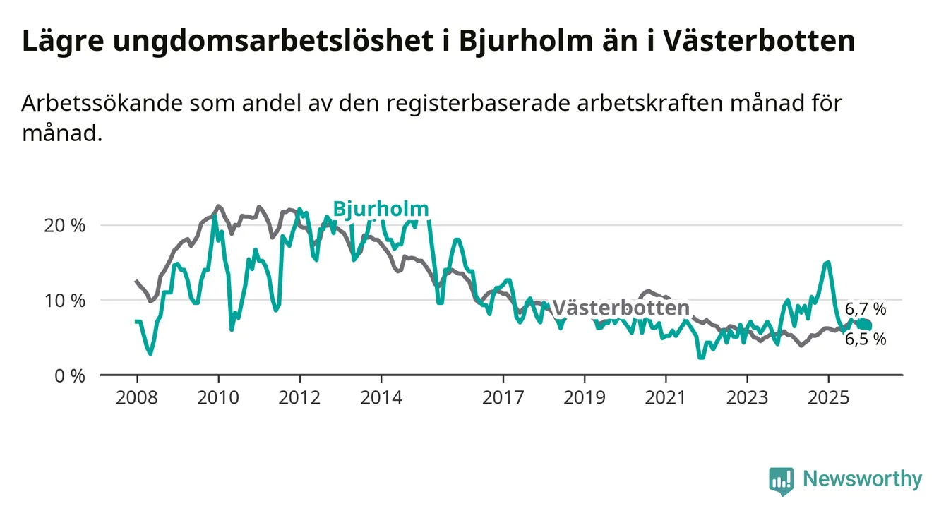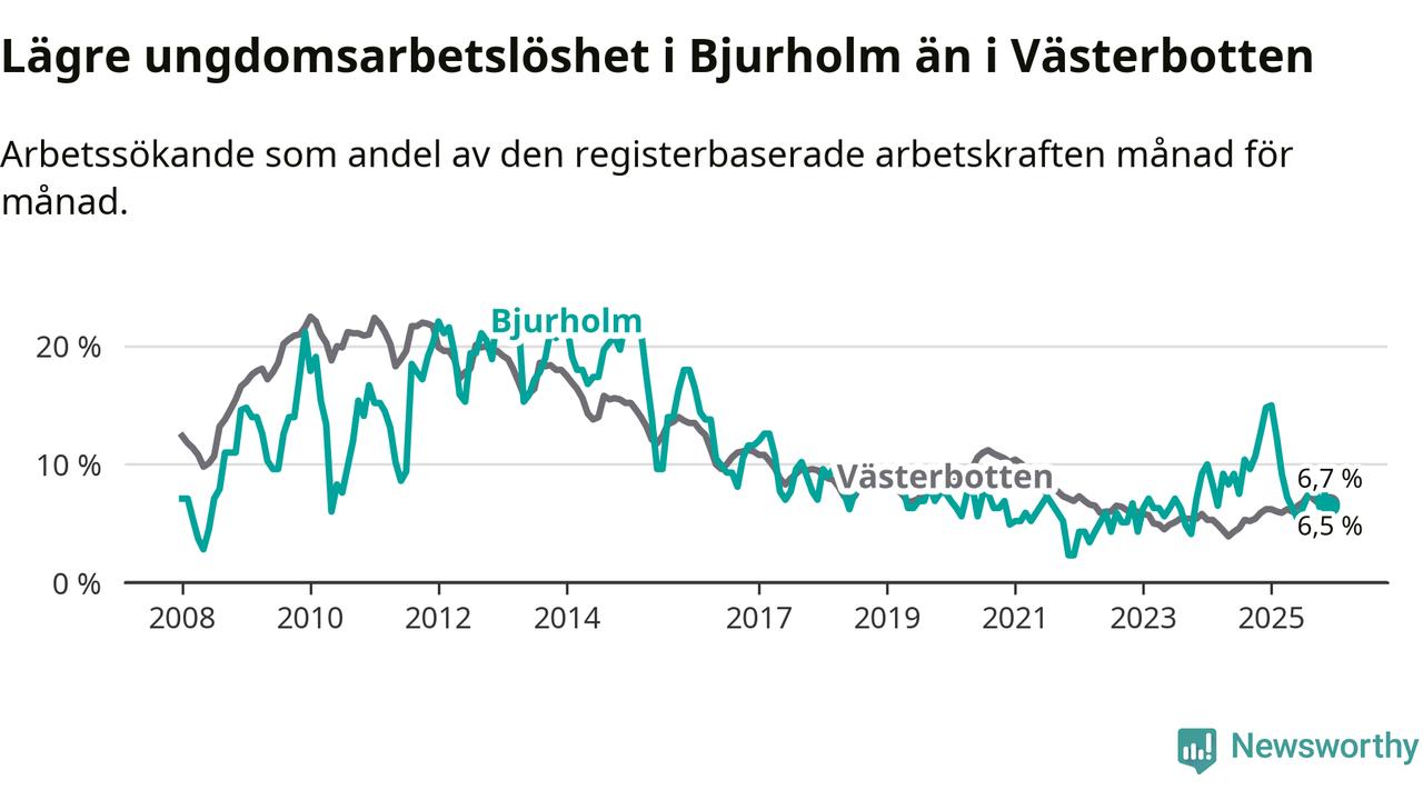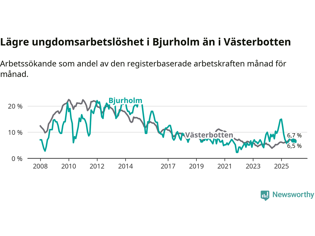 Medan Bjurholm har högre total arbetslöshet än Västerbotten, ligger ungdomsarbetslösheten 0,2 procentenheter lägre i Bjurholm.