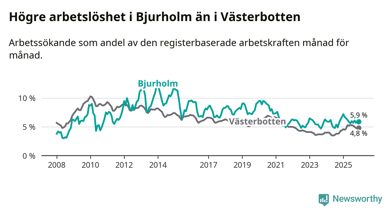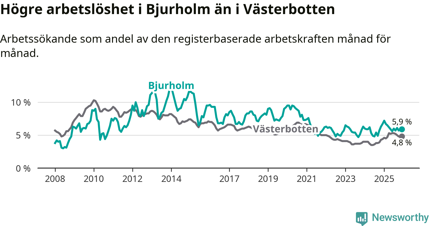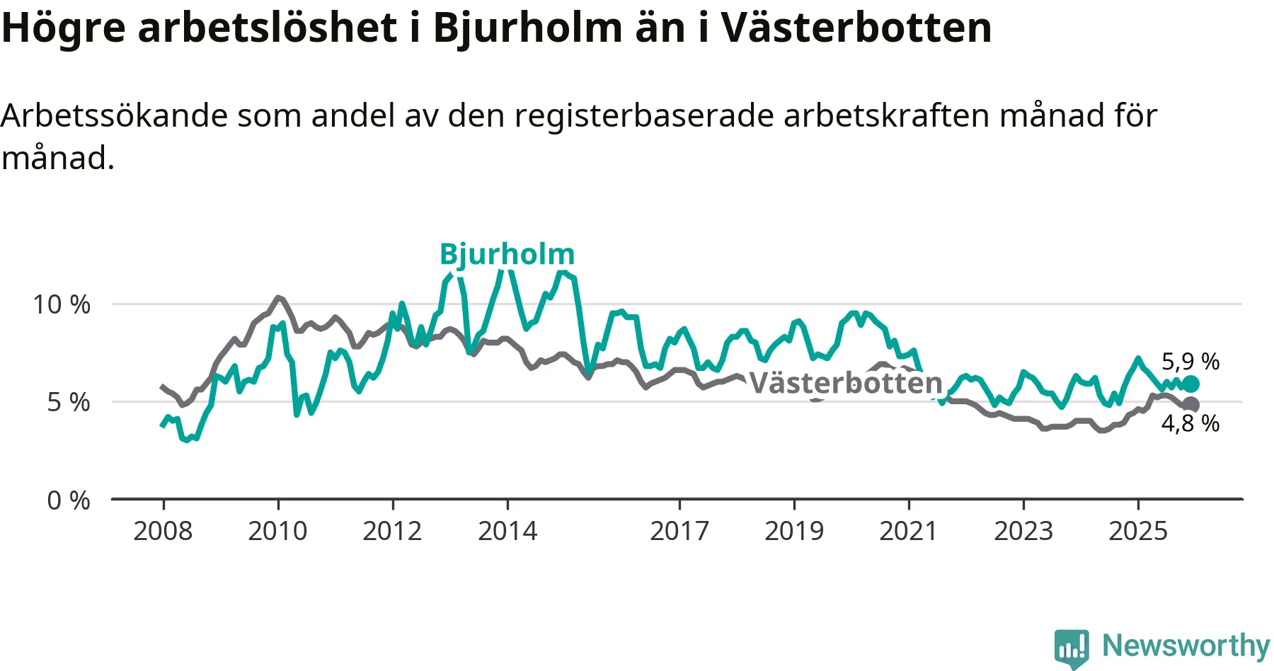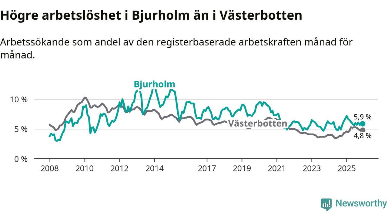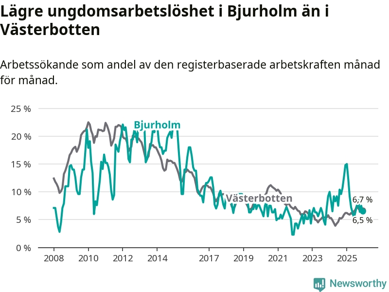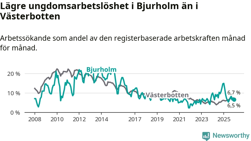 Medan Bjurholm har högre total arbetslöshet än Västerbotten, ligger ungdomsarbetslösheten 0,2 procentenheter lägre i Bjurholm.