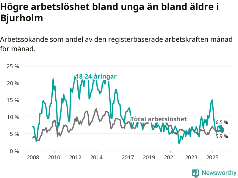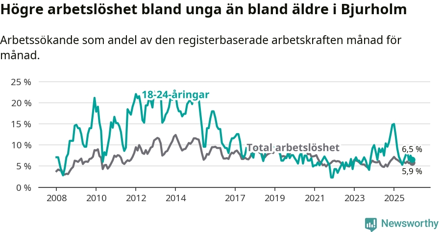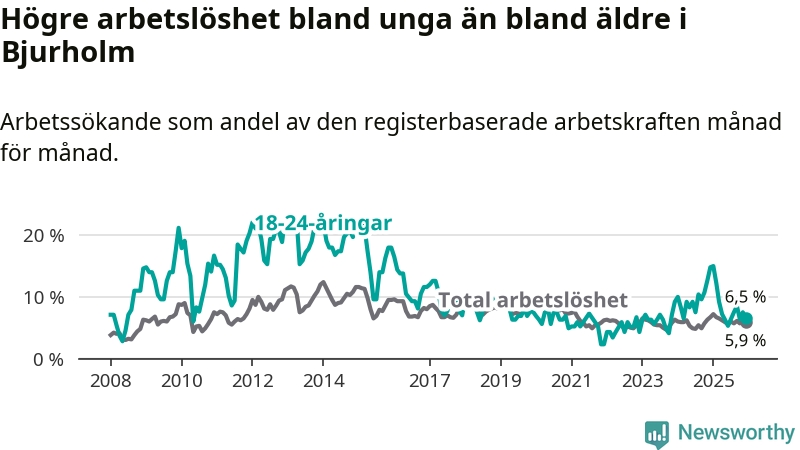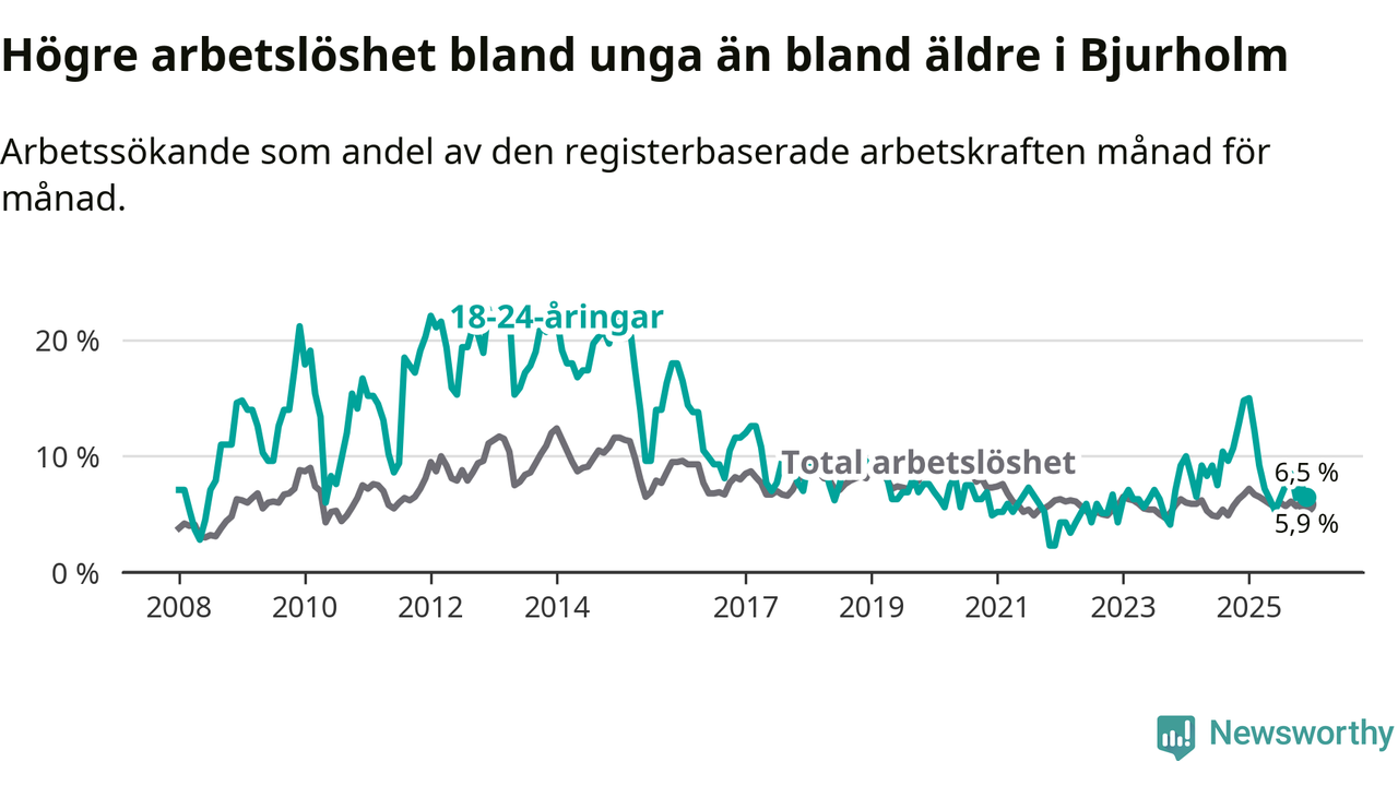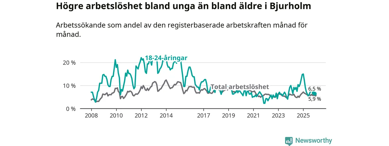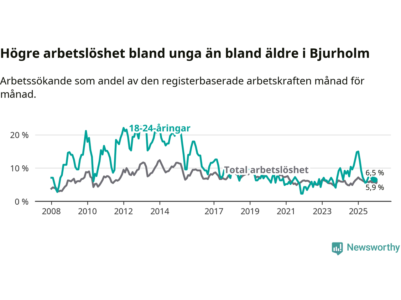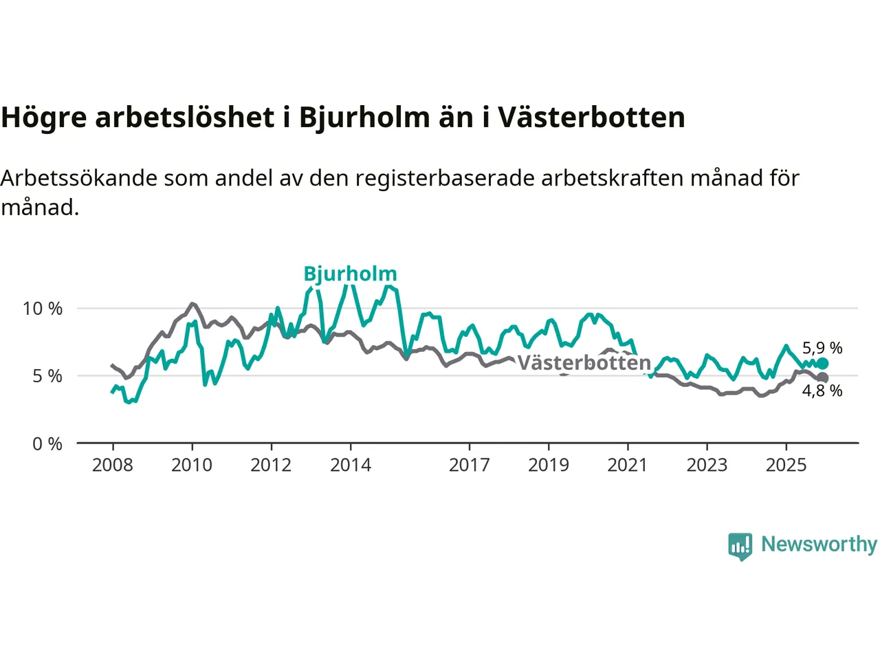Medan Bjurholm har högre total arbetslöshet än Västerbotten, ligger ungdomsarbetslösheten 0,2 procentenheter lägre i Bjurholm.