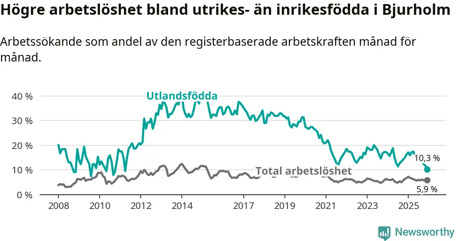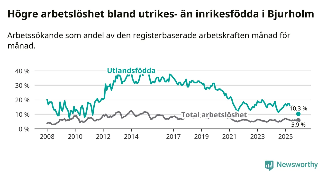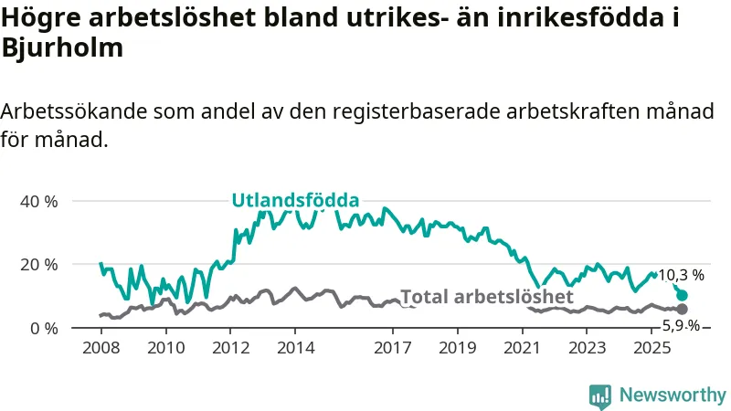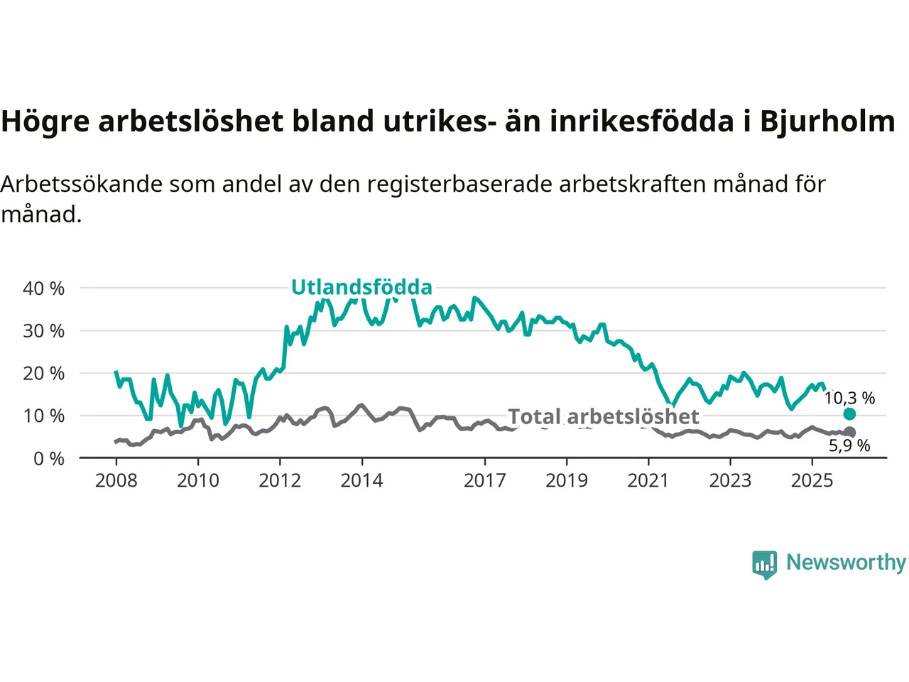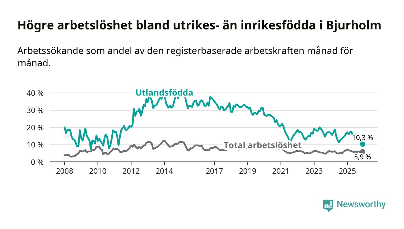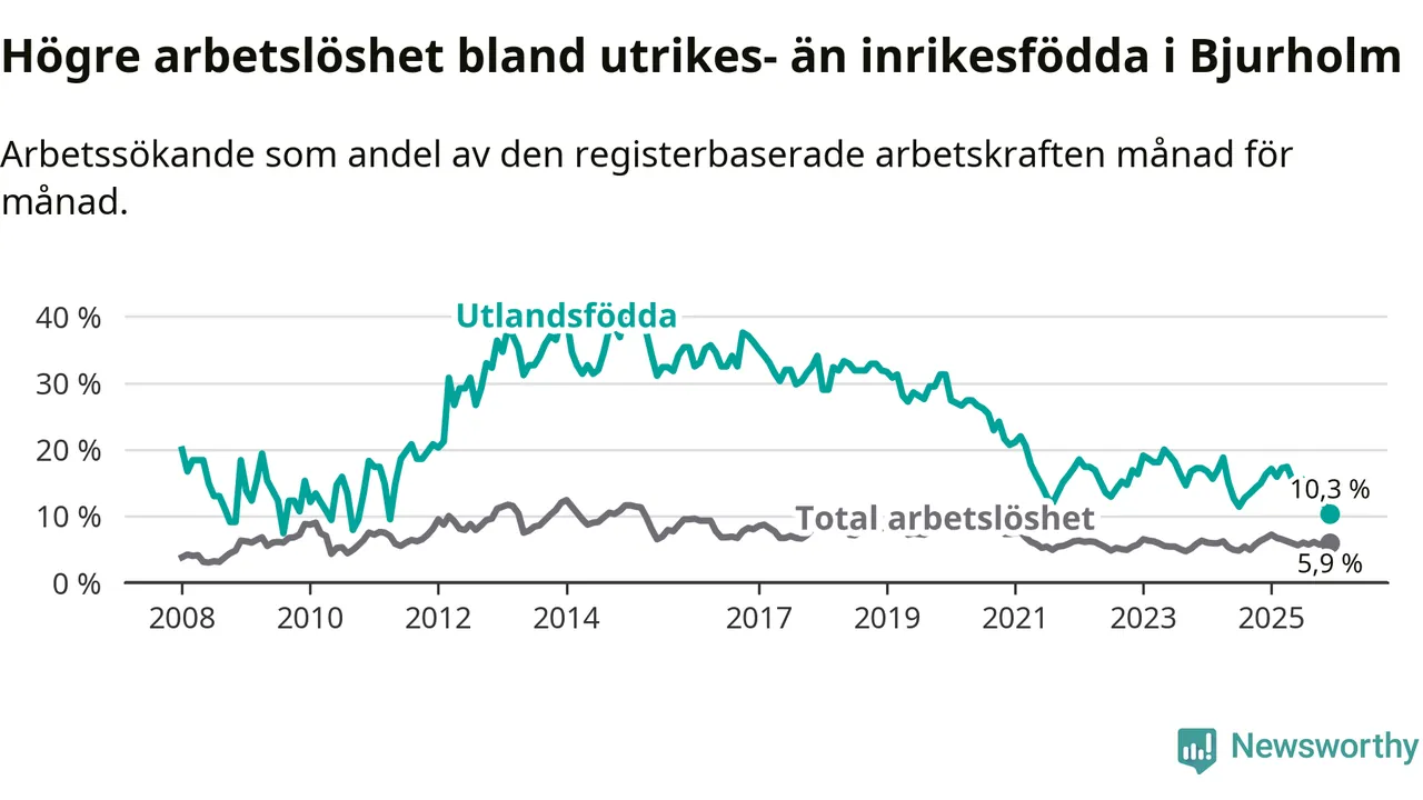 Skillnaden i arbetslöshet mellan utrikesfödda och hela befolkningen är 4,4 procentenheter i Bjurholm. Det är en betydligt mindre skillnad än för ett år sedan (−5,2 procentenheter).