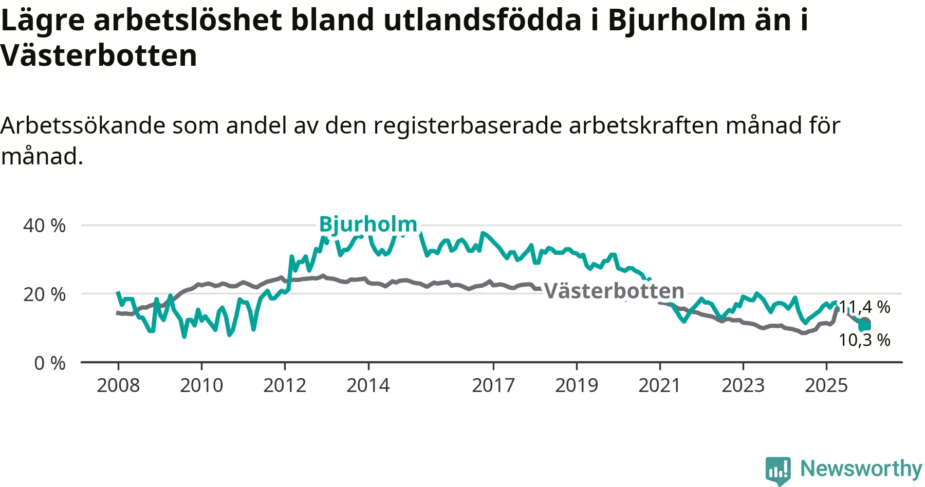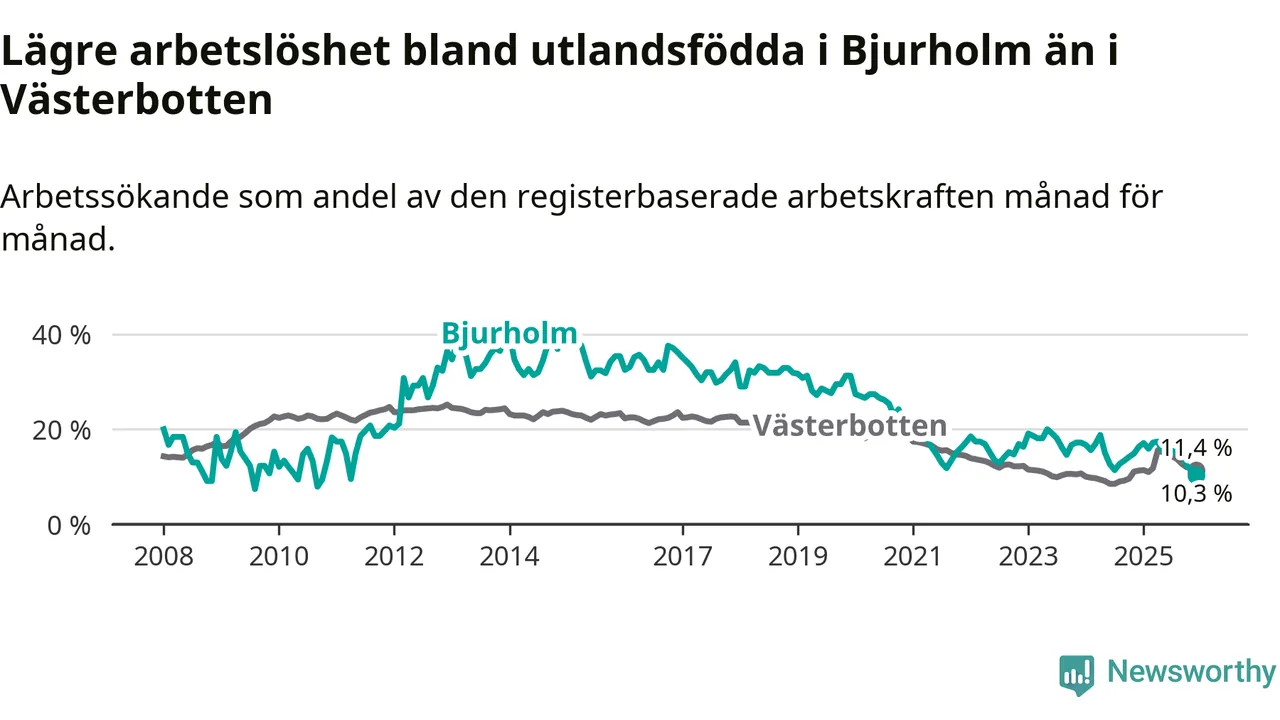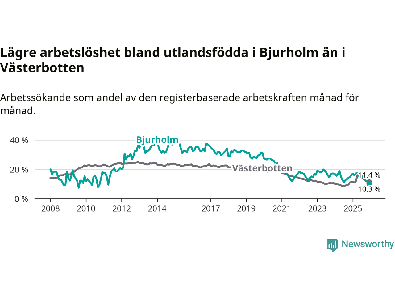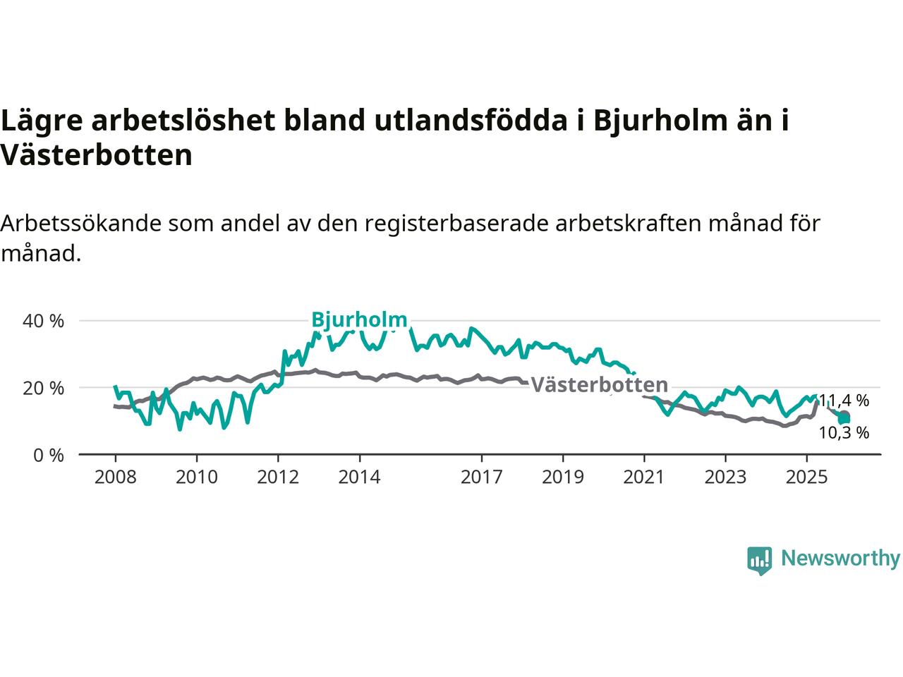 Medan arbetslösheten bland utlandsfödda alltså minskar i Bjurholm så ökar den i Västerbotten. Jämfört med december förra året har andelen arbetslösa utlandsfödda i länet ökat med 0,1 procentenheter (till 11,4 procent).
