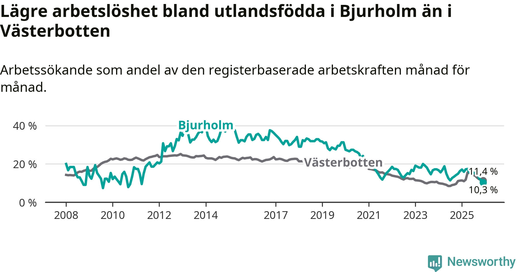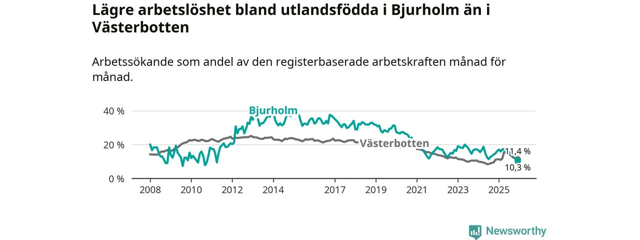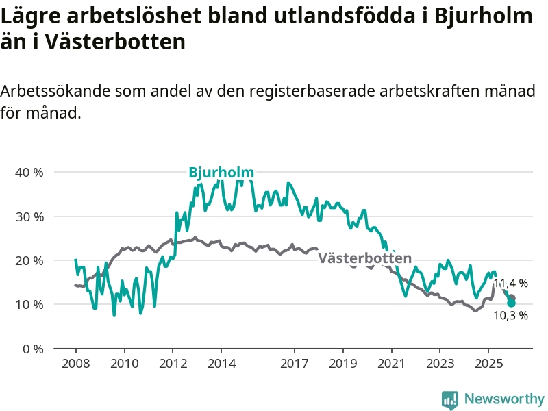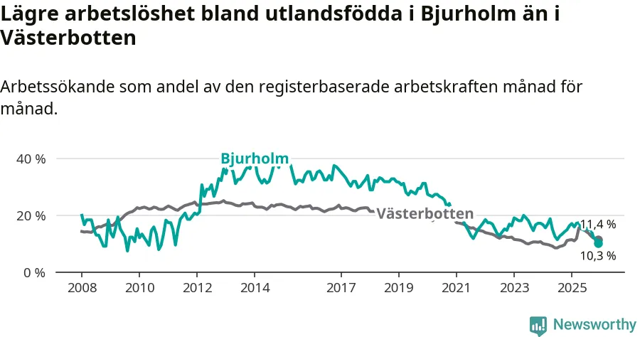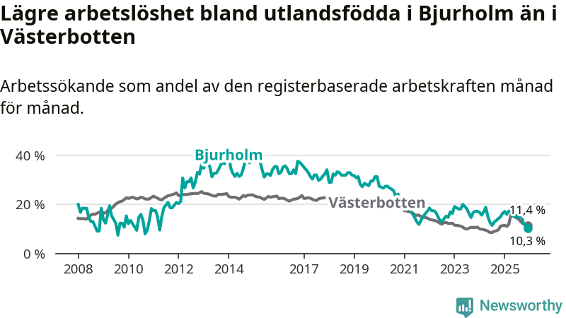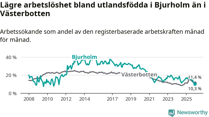 Medan arbetslösheten bland utlandsfödda alltså minskar i Bjurholm så ökar den i Västerbotten. Jämfört med december förra året har andelen arbetslösa utlandsfödda i länet ökat med 0,1 procentenheter (till 11,4 procent).