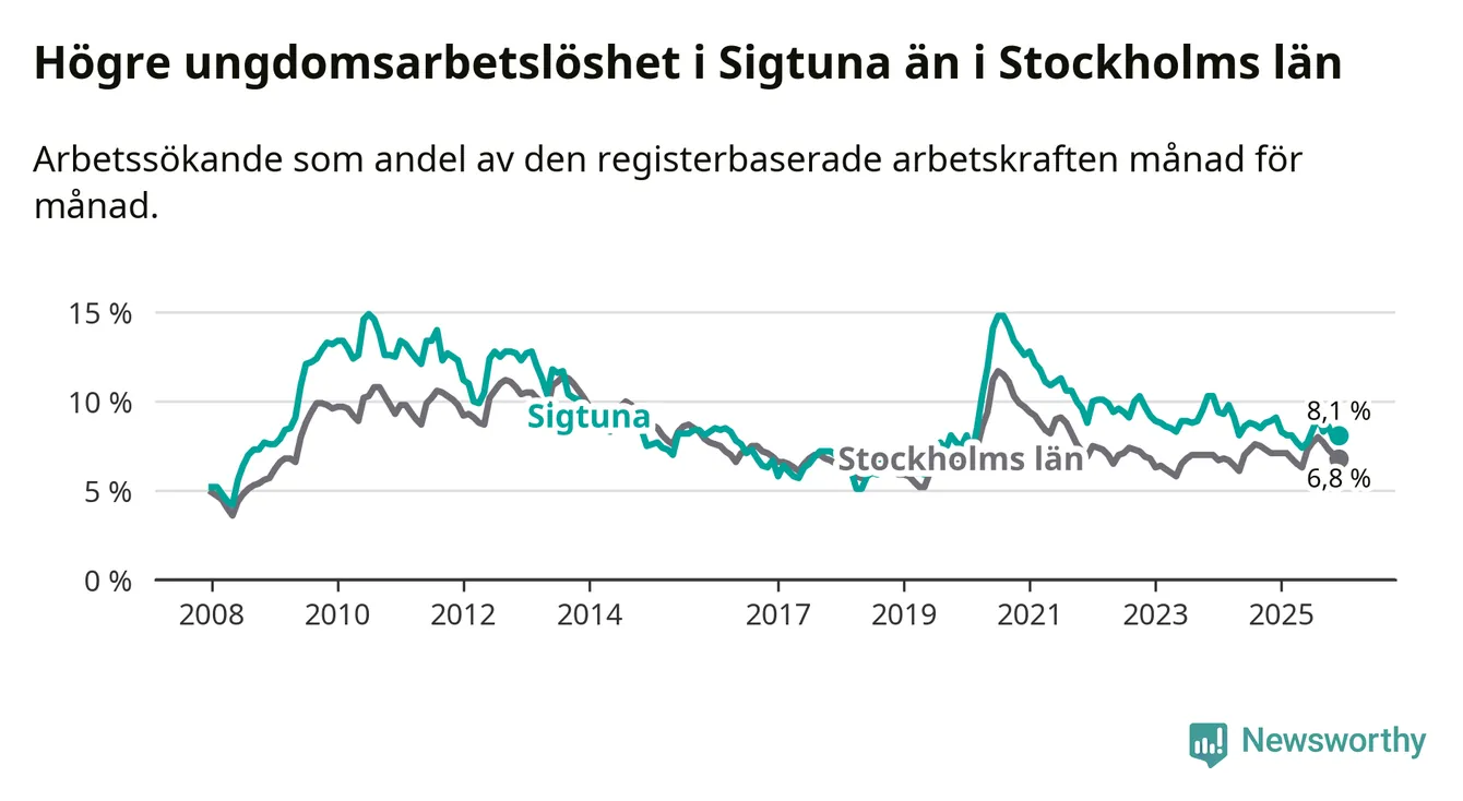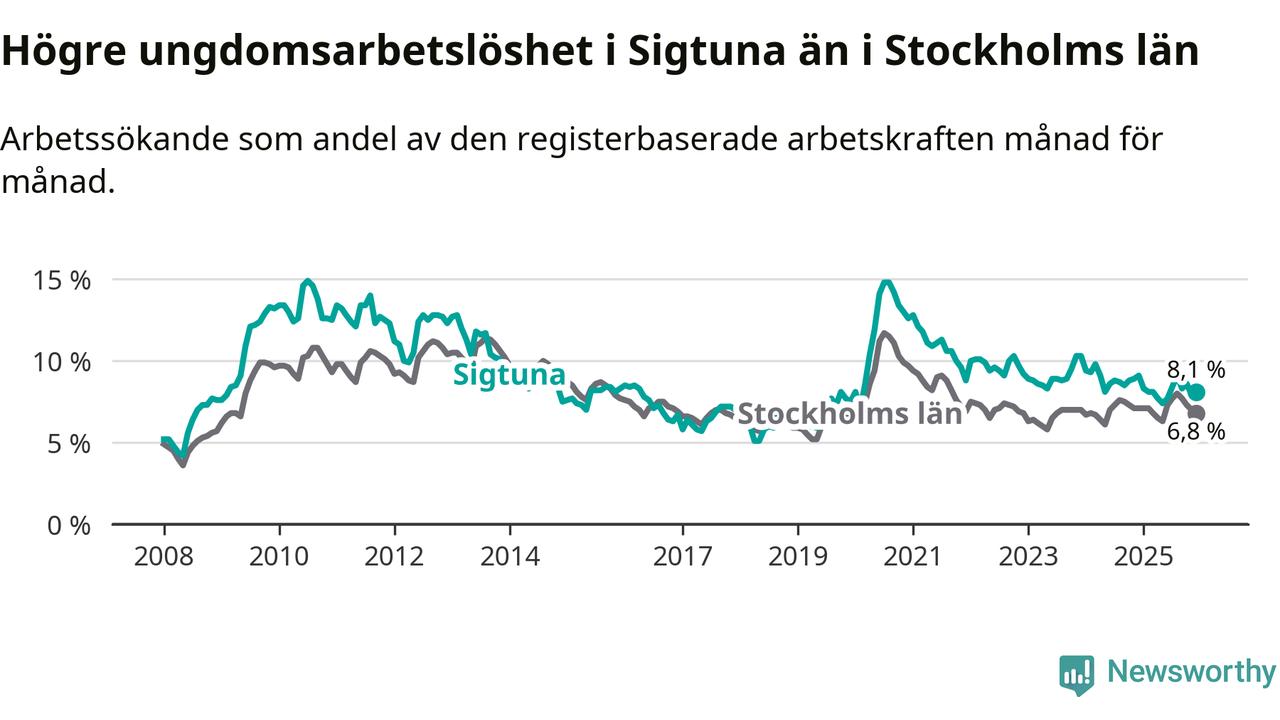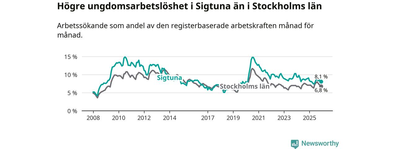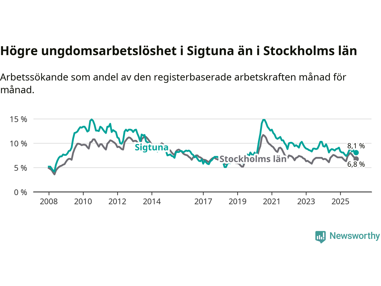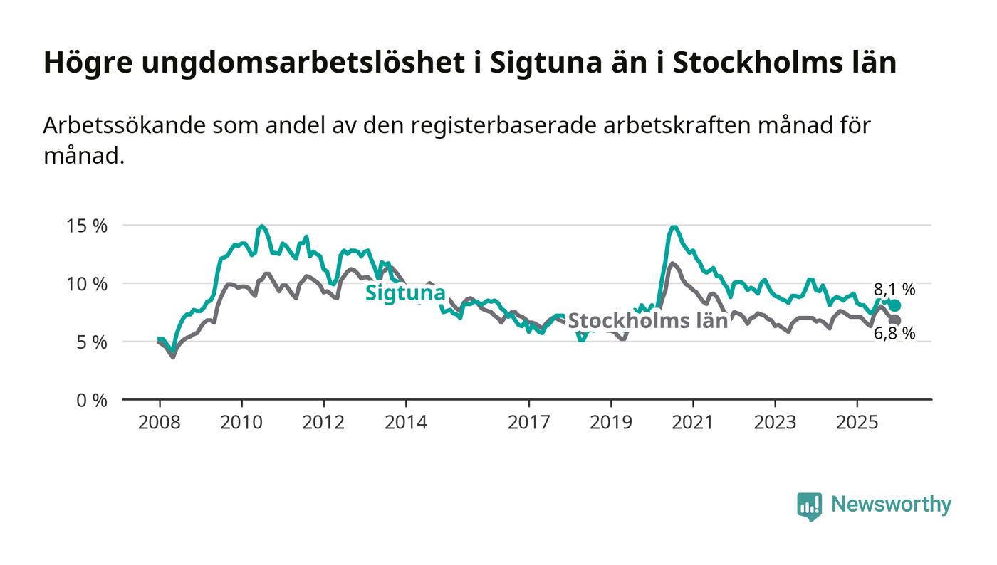 Precis som den totala arbetslösheten ligger ungdomsarbetslösheten i Sigtuna högre än i Stockholms län som helhet. Skillnaden mellan kommunen och länet är 1,3 procentenheter.