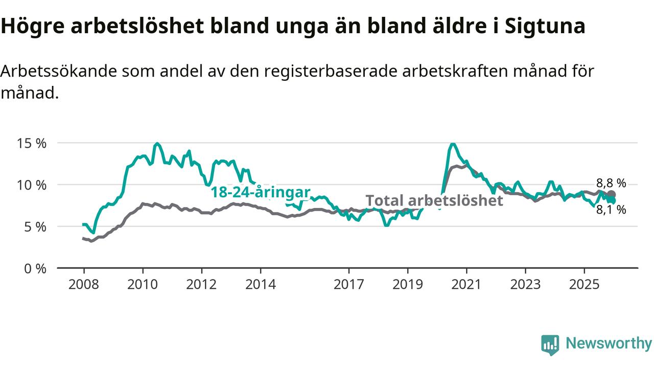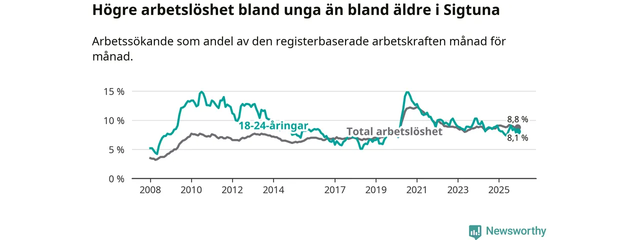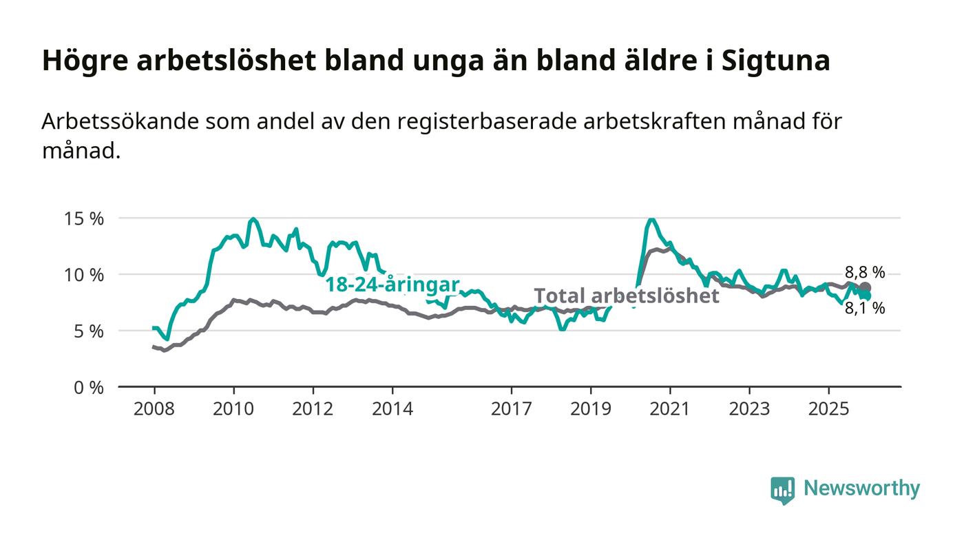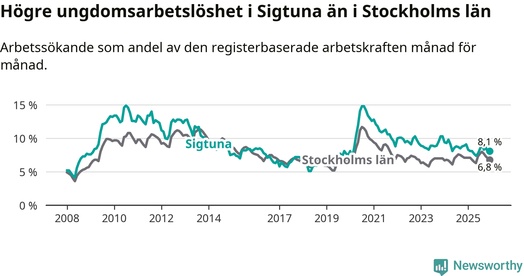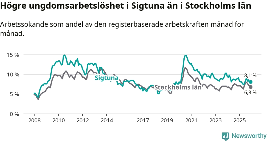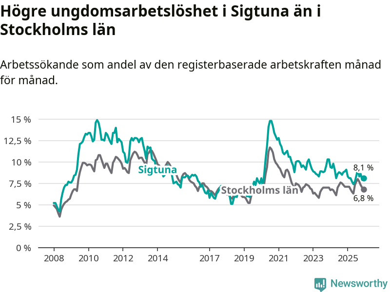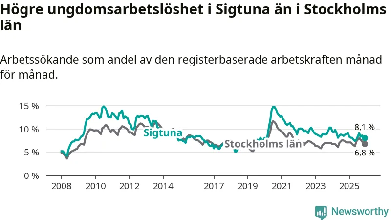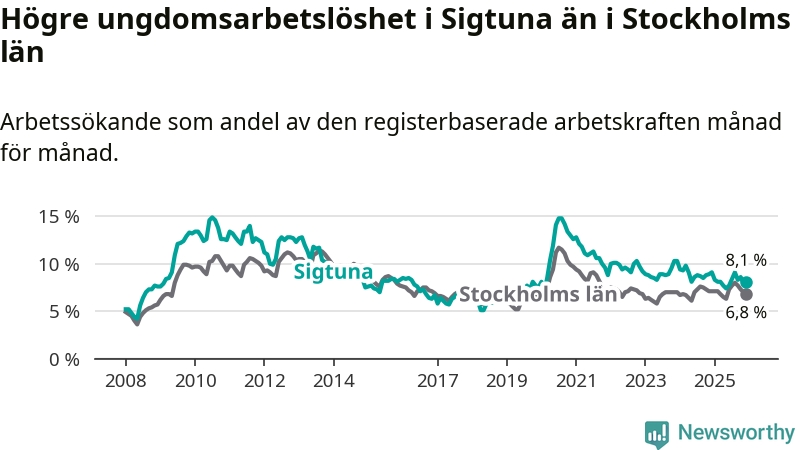 Precis som den totala arbetslösheten ligger ungdomsarbetslösheten i Sigtuna högre än i Stockholms län som helhet. Skillnaden mellan kommunen och länet är 1,3 procentenheter.