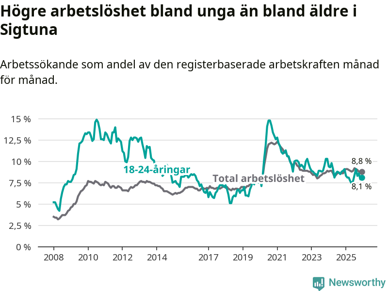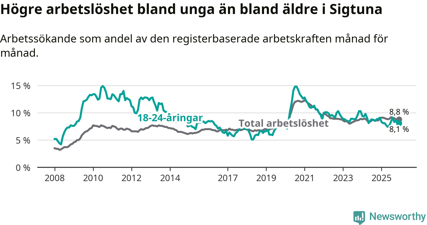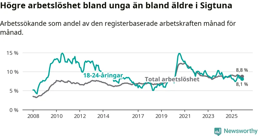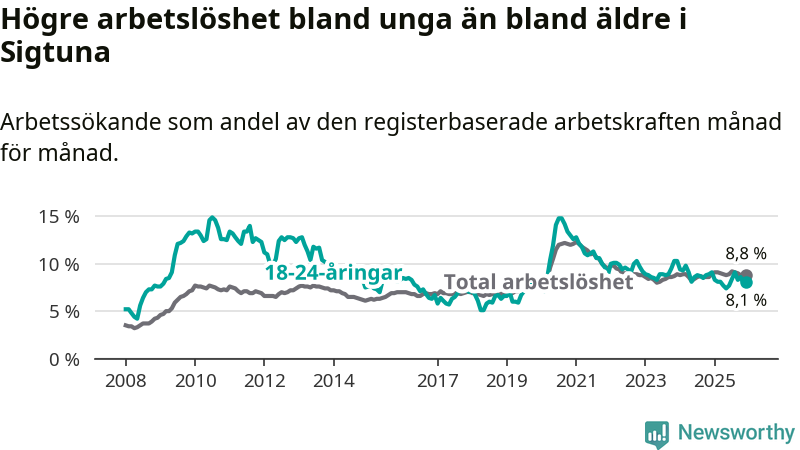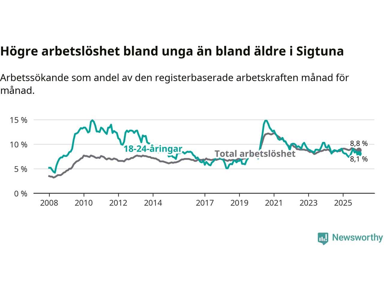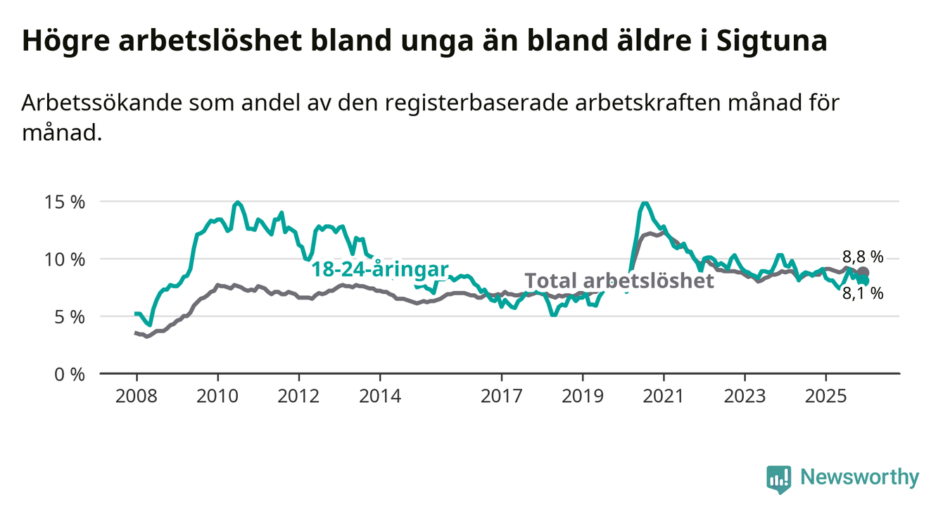 Precis som den totala arbetslösheten ligger ungdomsarbetslösheten i Sigtuna högre än i Stockholms län som helhet. Skillnaden mellan kommunen och länet är 1,3 procentenheter.