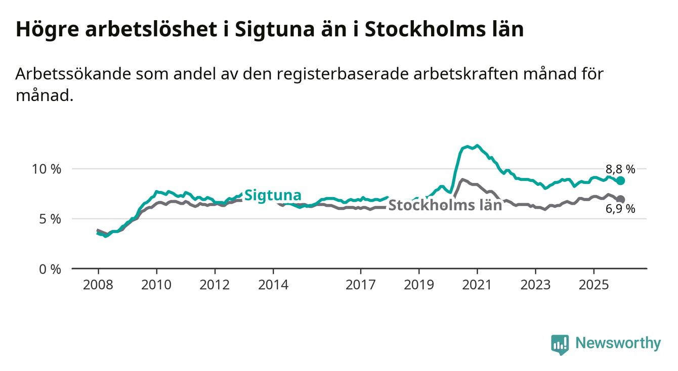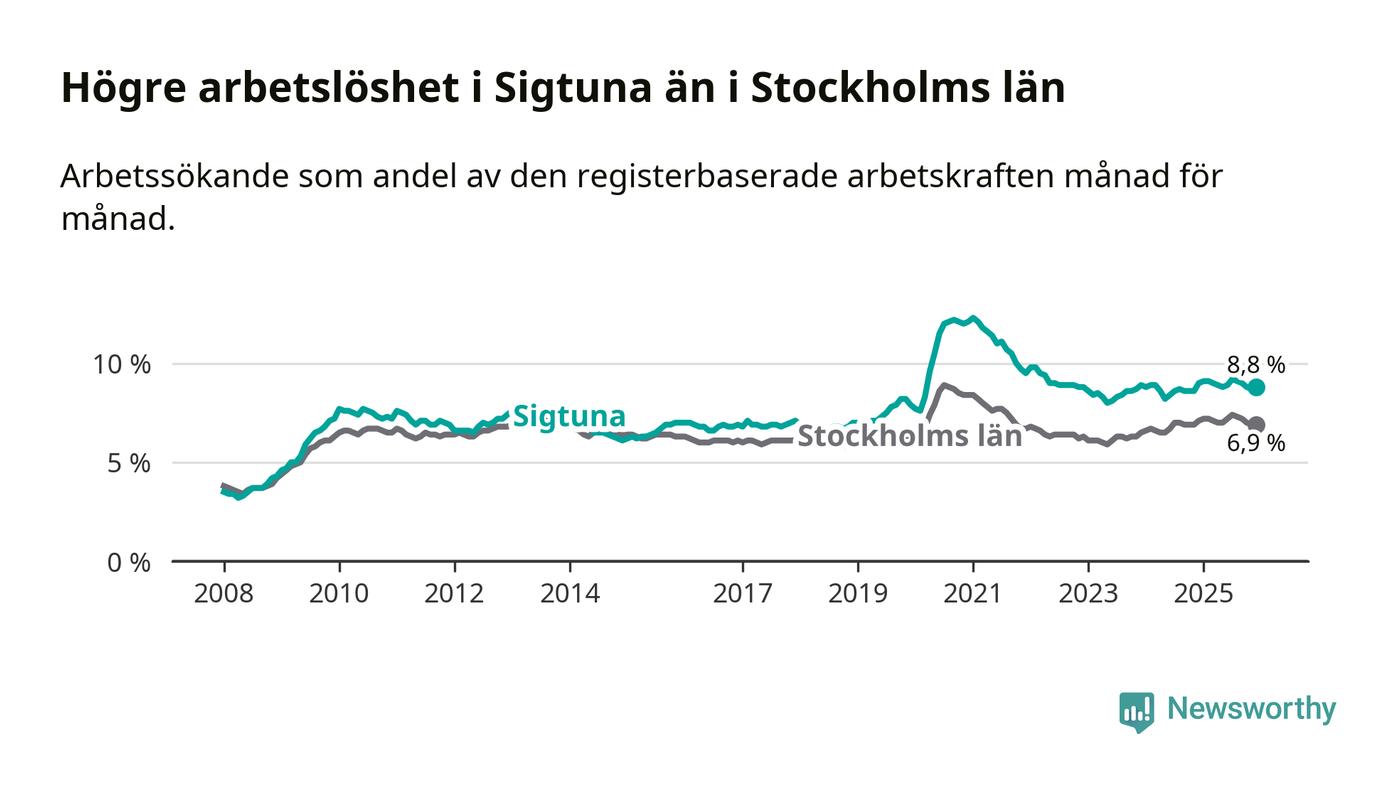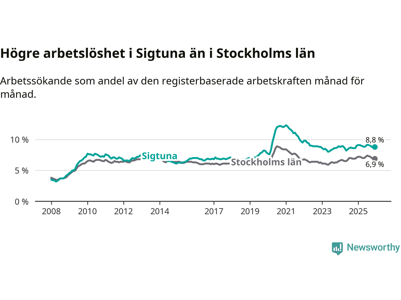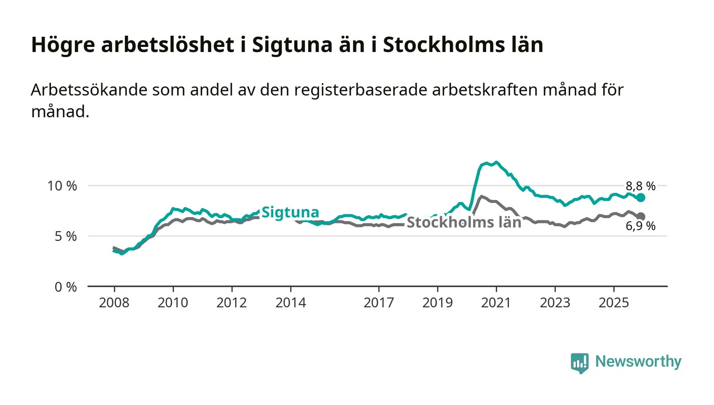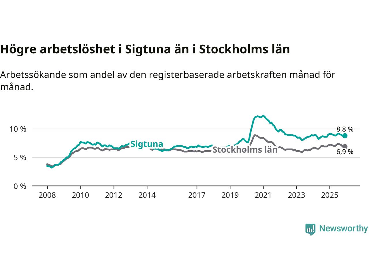 Även om arbetslösheten i Sigtuna alltså minskar, så ligger den fortfarande över snittet i hela Stockholms län (8,8 procent i kommunen, jämfört med 6,9 procent i hela länet). Ekerö har den lägsta arbetslösheten i länet (3,8 procent), medan Södertälje har den högsta (11,0 procent). För att Sigtuna skulle komma ner i samma arbetslöshetsnivå som Ekerö skulle 1 342 personer behöva sysselsättas.