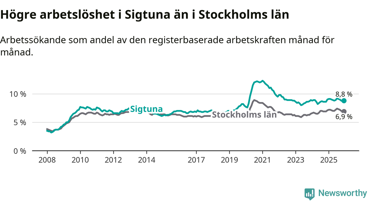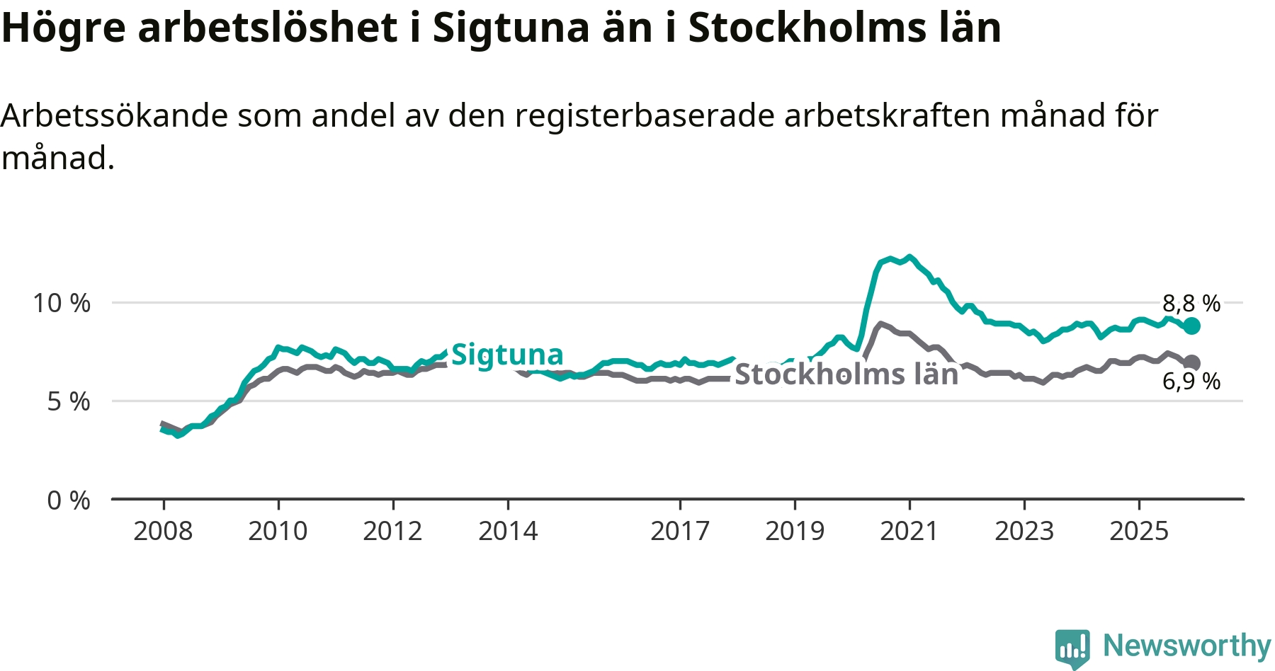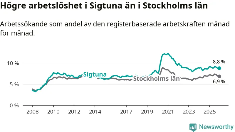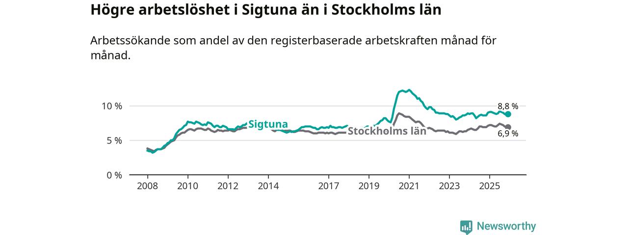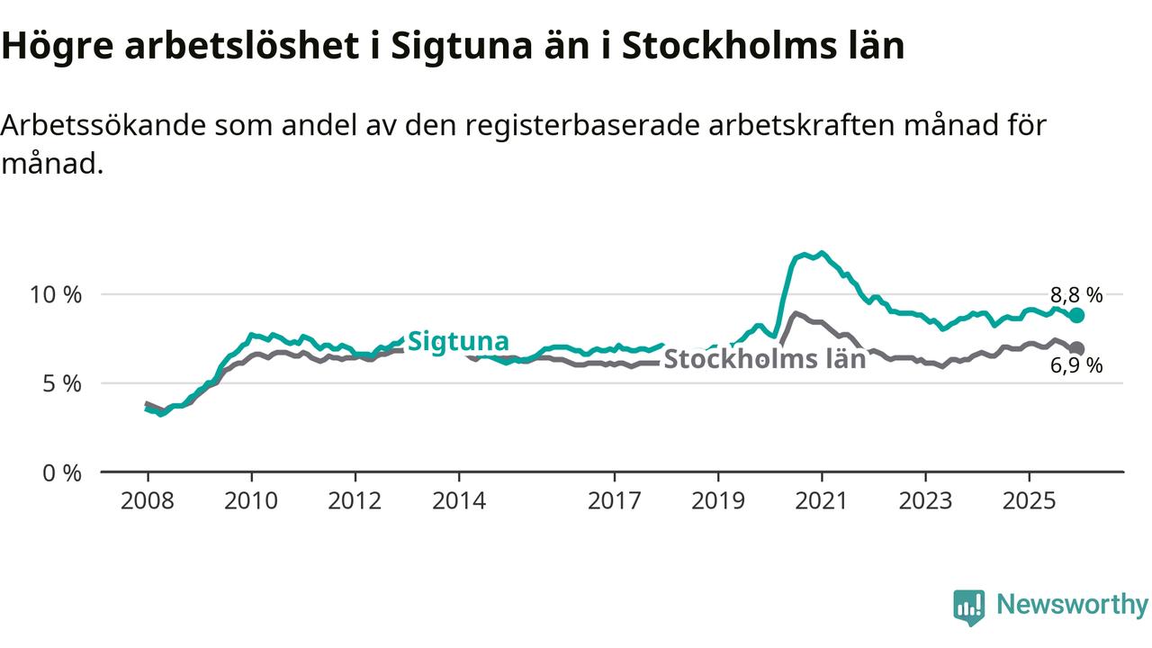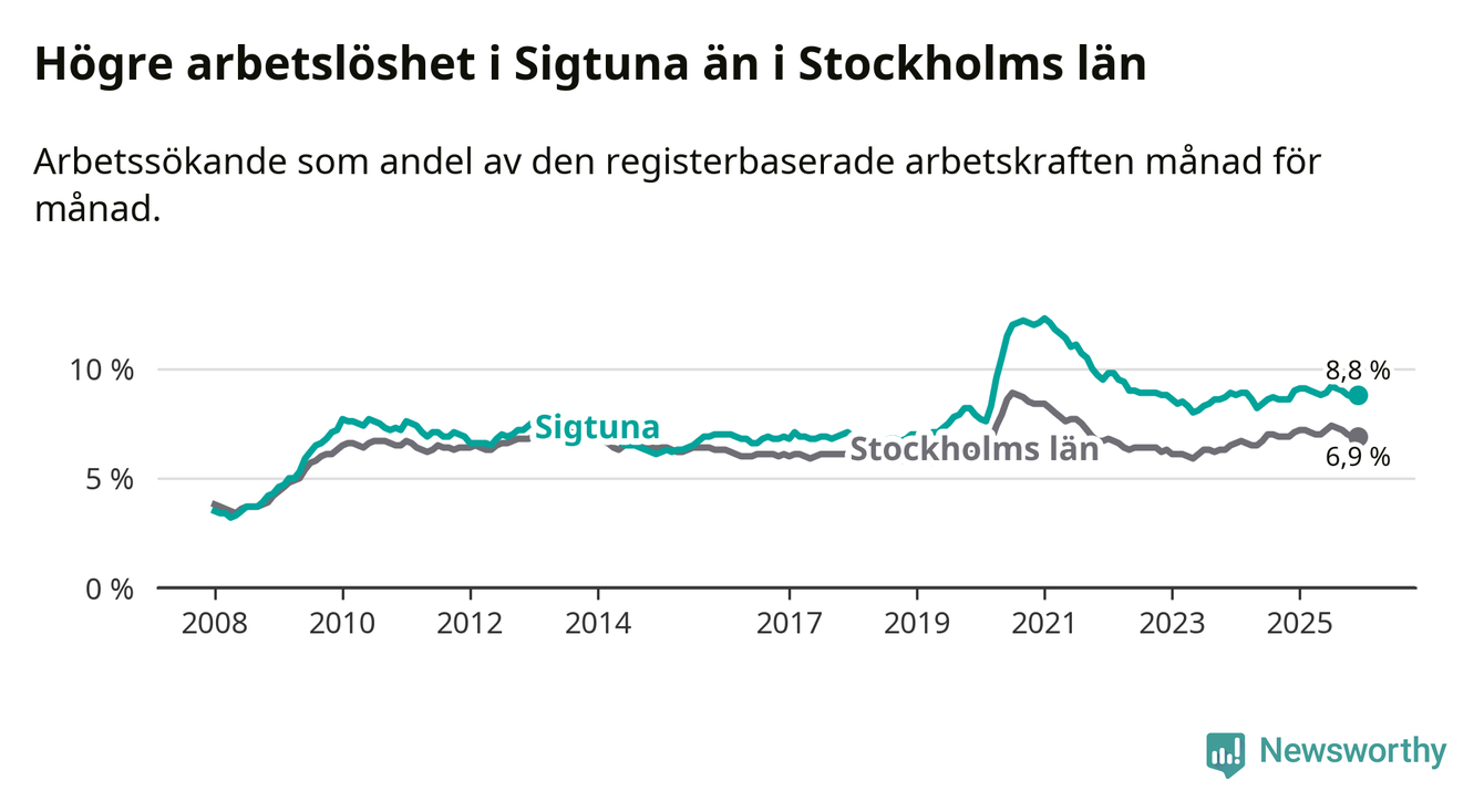 Även om arbetslösheten i Sigtuna alltså minskar, så ligger den fortfarande över snittet i hela Stockholms län (8,8 procent i kommunen, jämfört med 6,9 procent i hela länet). Ekerö har den lägsta arbetslösheten i länet (3,8 procent), medan Södertälje har den högsta (11,0 procent). För att Sigtuna skulle komma ner i samma arbetslöshetsnivå som Ekerö skulle 1 342 personer behöva sysselsättas.