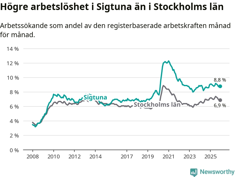 Under december månad rapporterade Sigtuna kommun en total arbetslöshet på 8,8 procent. Det är en minskning jämfört med samma tidpunkt i fjol (−0,2 procentenheter). Även i Stockholms län sjunker arbetslösheten något.