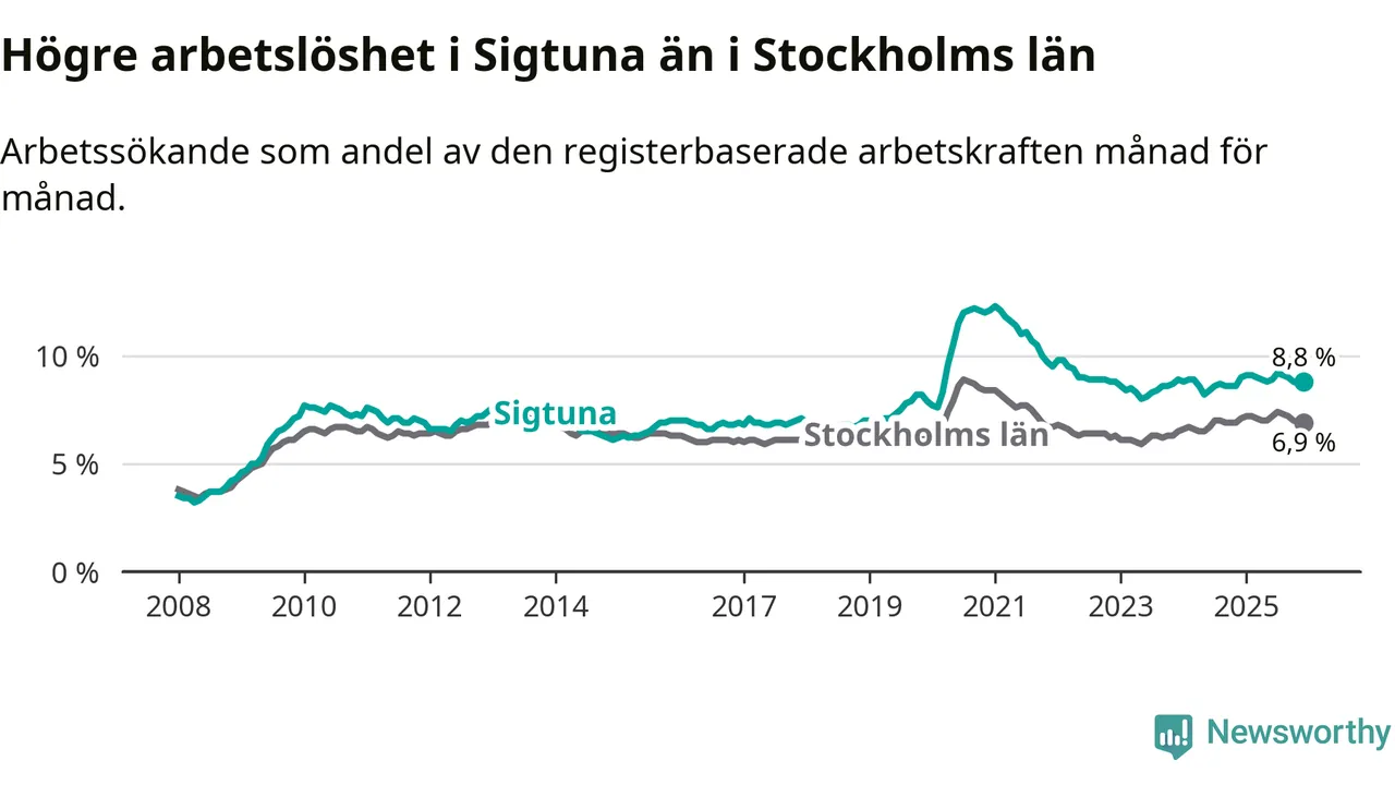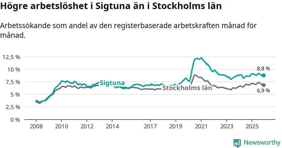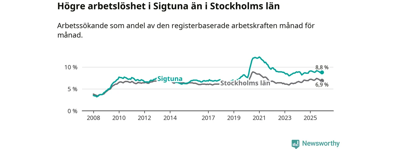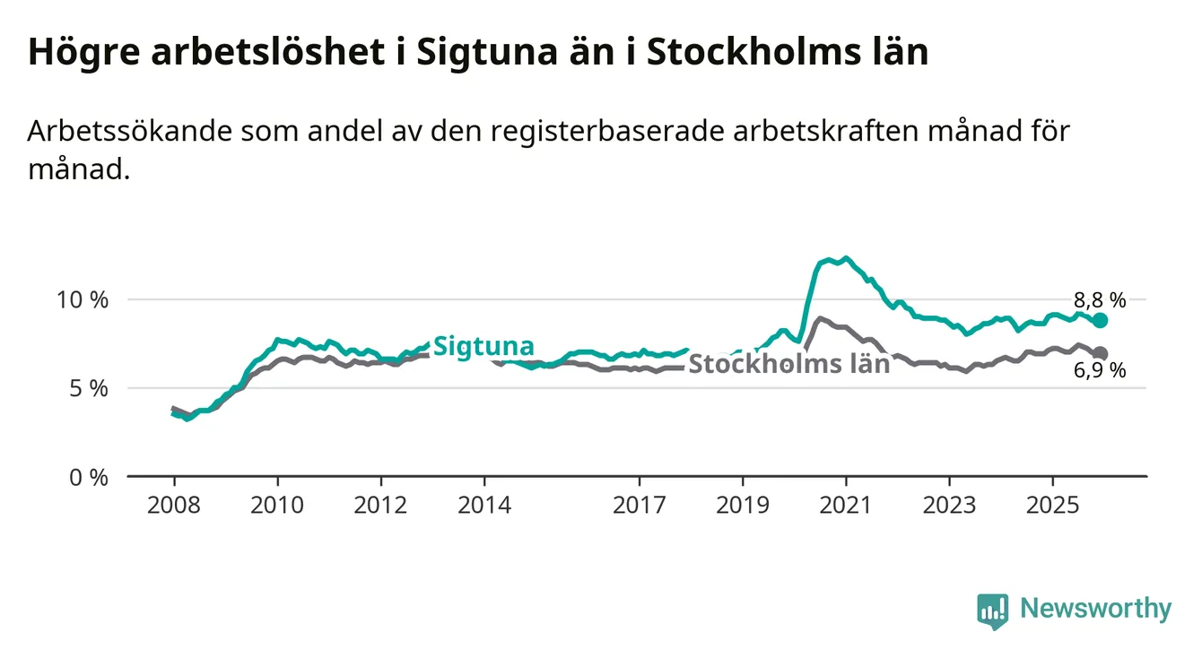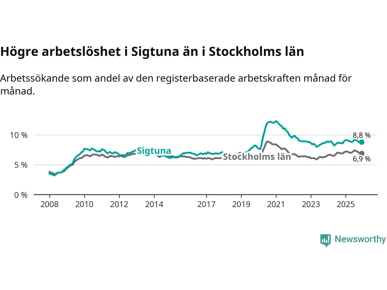 Sedan november 2024 har arbetslösheten i Sigtuna kommun ökat, men i december vände utvecklingen då andelen arbetslösa sjönk jämfört med året innan.