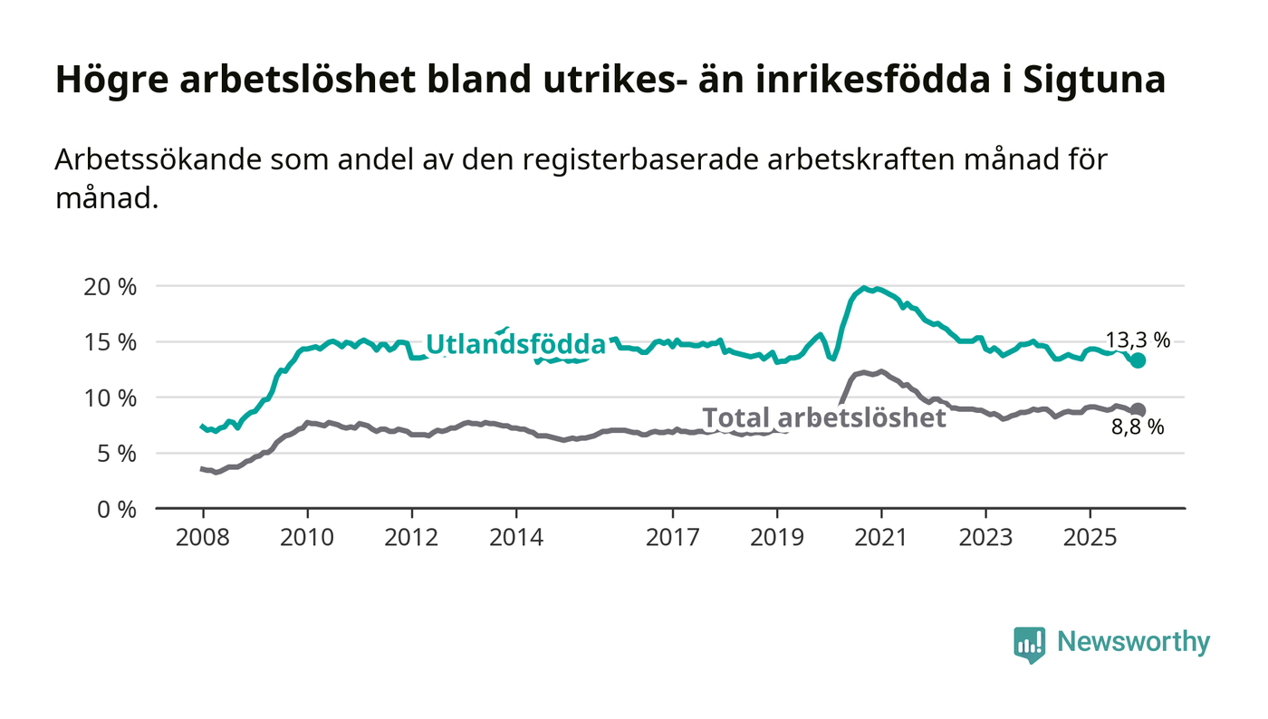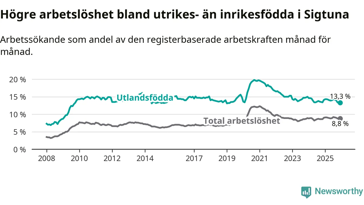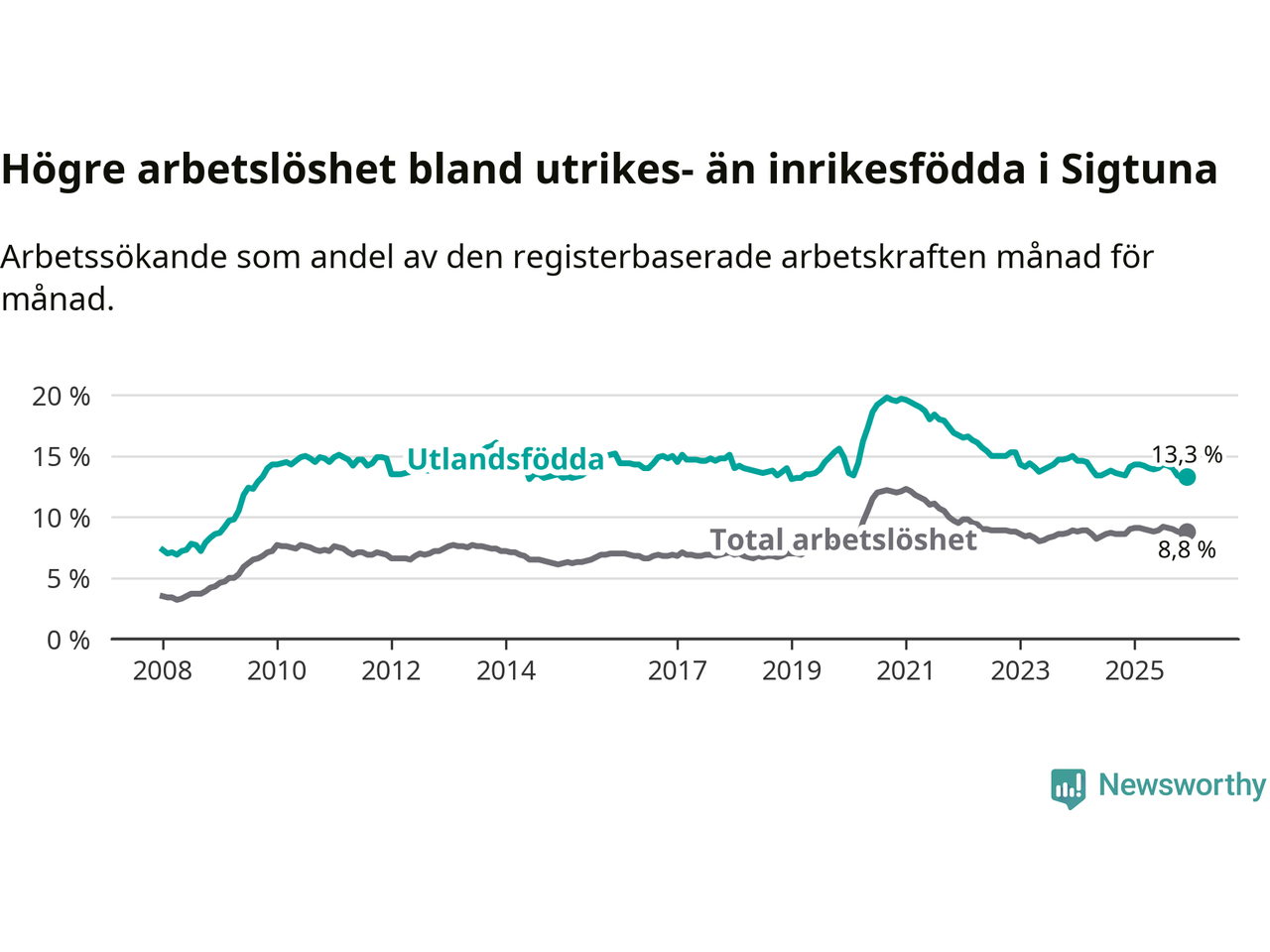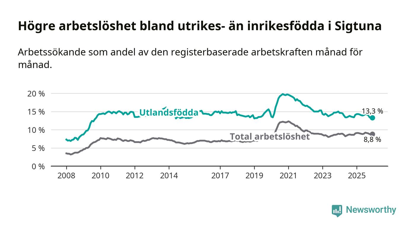 Arbetslösheten bland utlandsfödda var 13,3 procent i Sigtuna under december månad, motsvarande 1 686 av 12 677 personer. Det är 0,8 procentenheter färre än vid samma tidpunkt i fjol (−87 om man räknar personer).