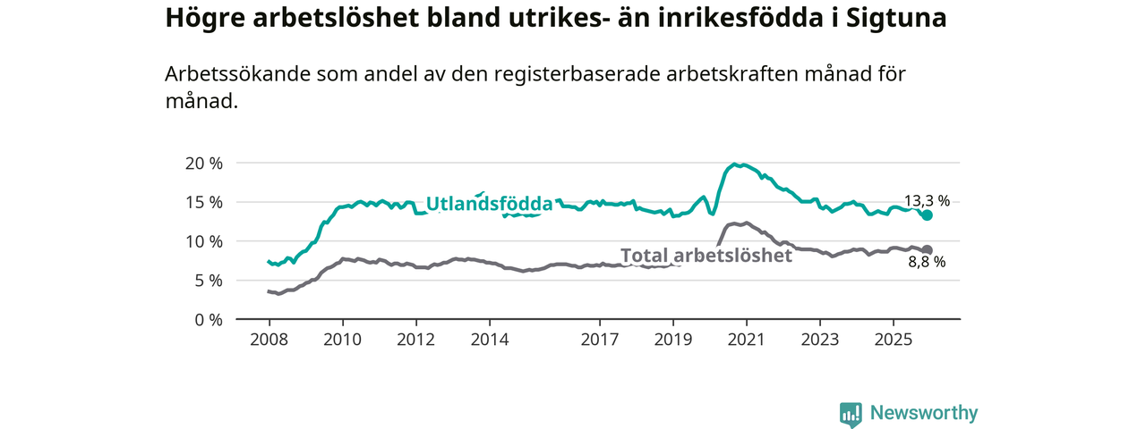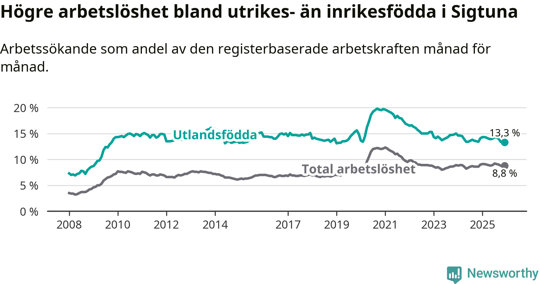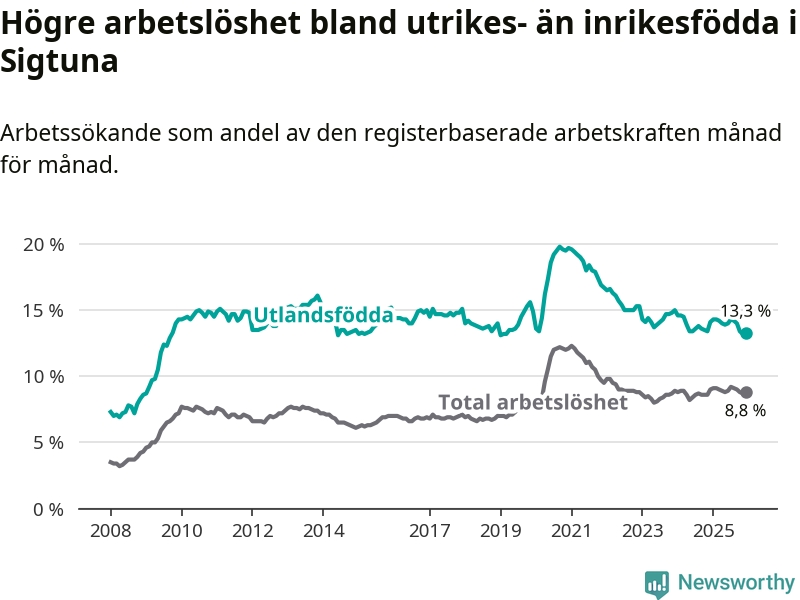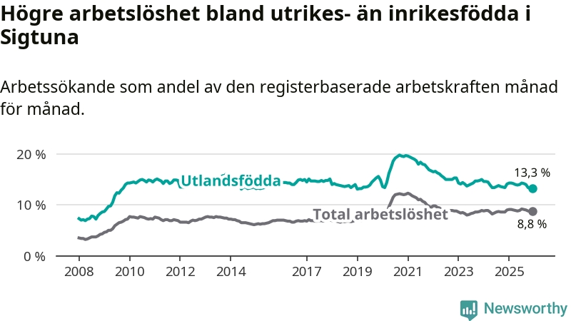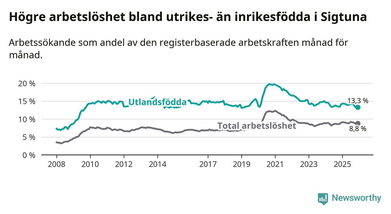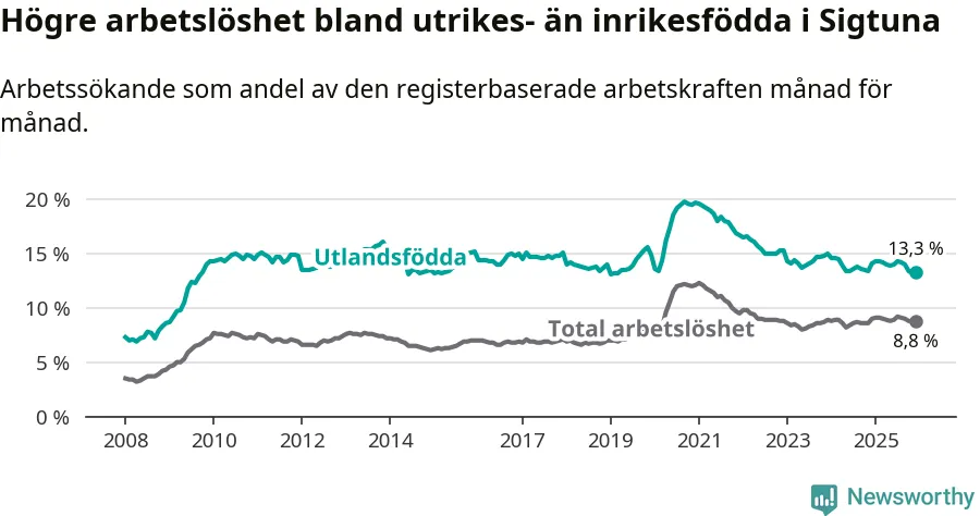 Arbetslösheten bland utlandsfödda var 13,3 procent i Sigtuna under december månad, motsvarande 1 686 av 12 677 personer. Det är 0,8 procentenheter färre än vid samma tidpunkt i fjol (−87 om man räknar personer).