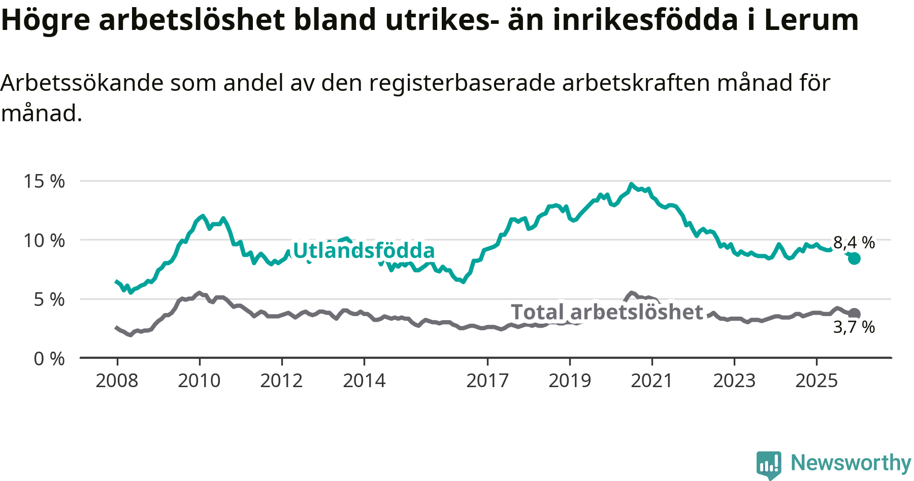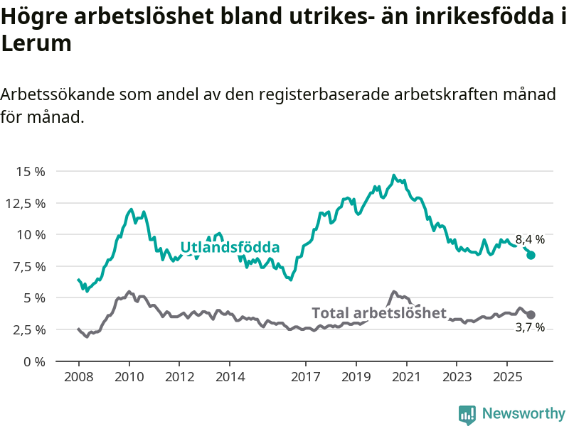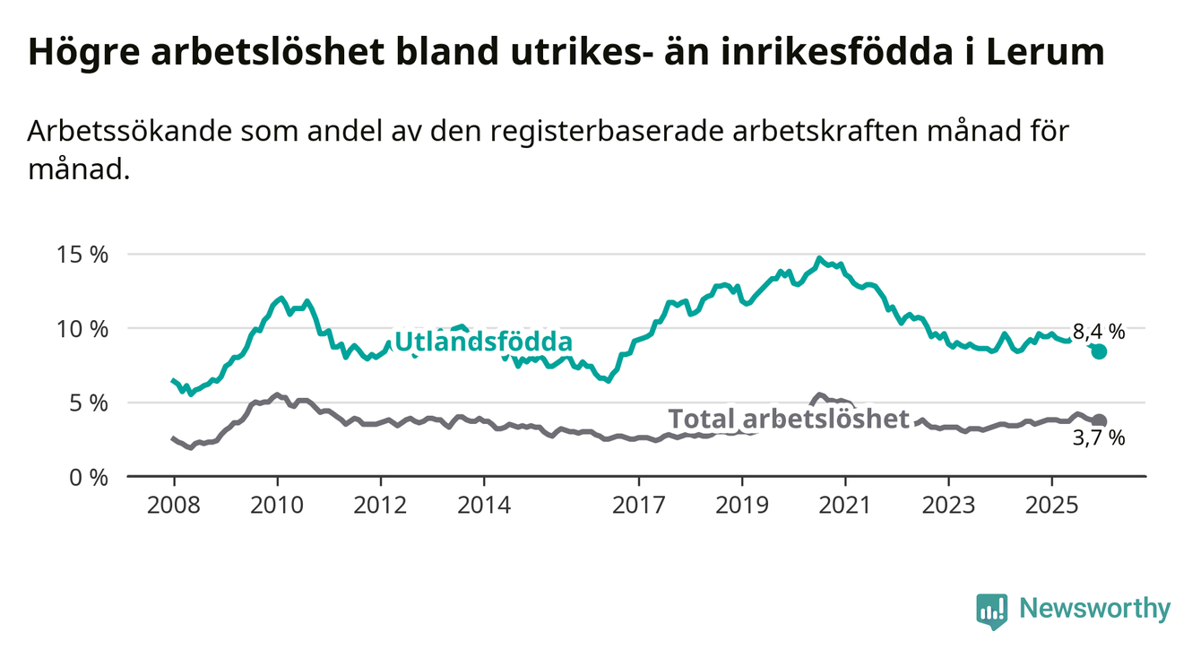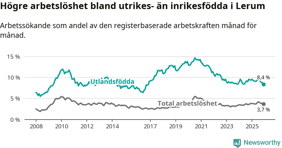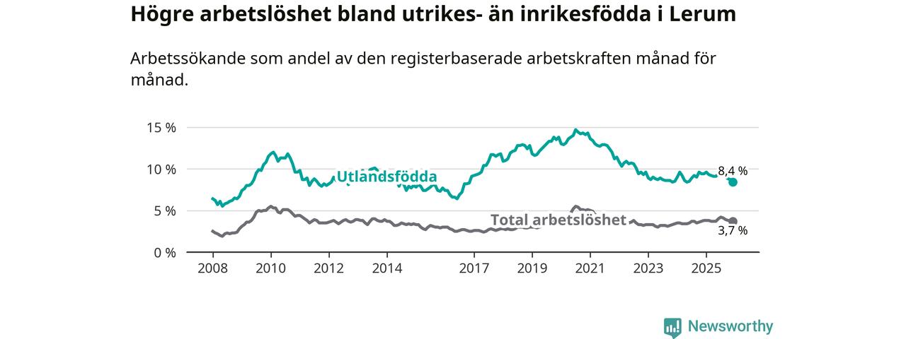Skillnaden i arbetslöshet mellan utrikesfödda och hela befolkningen är 4,7 procentenheter i Lerum. Det är en mindre skillnad än för ett år sedan (−0,9 procentenheter).