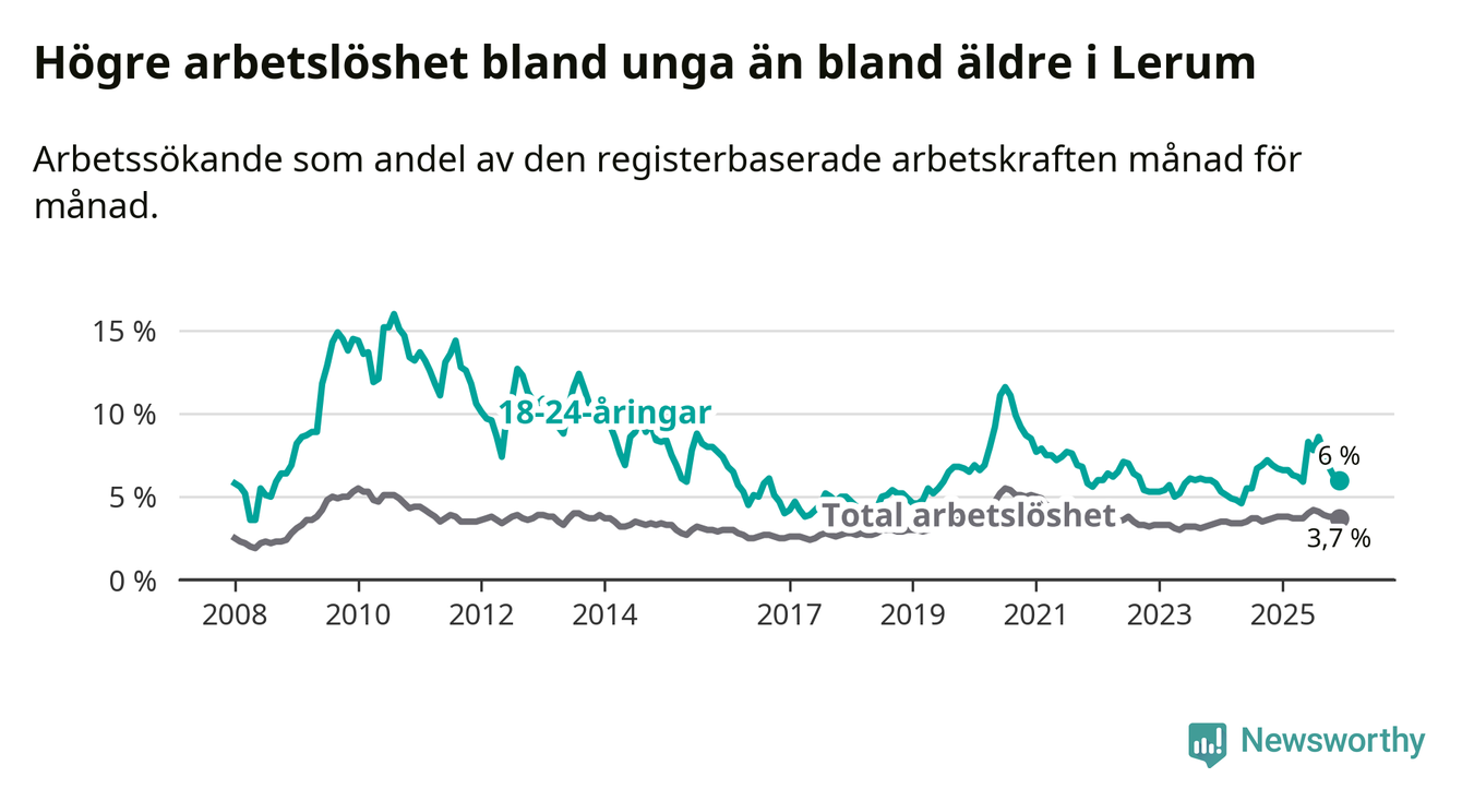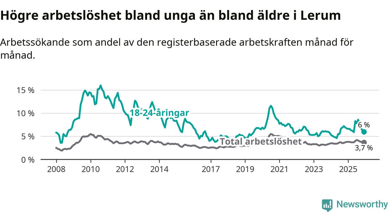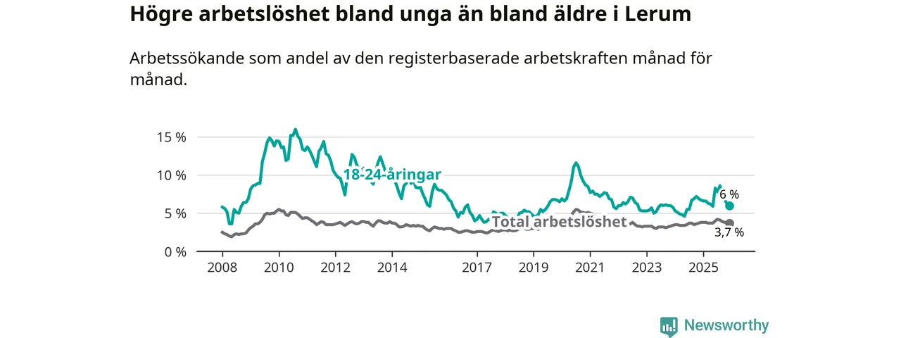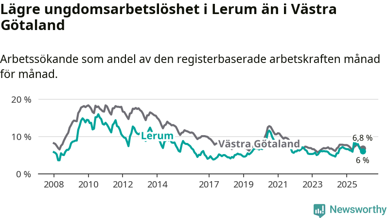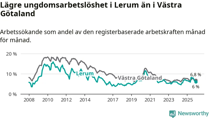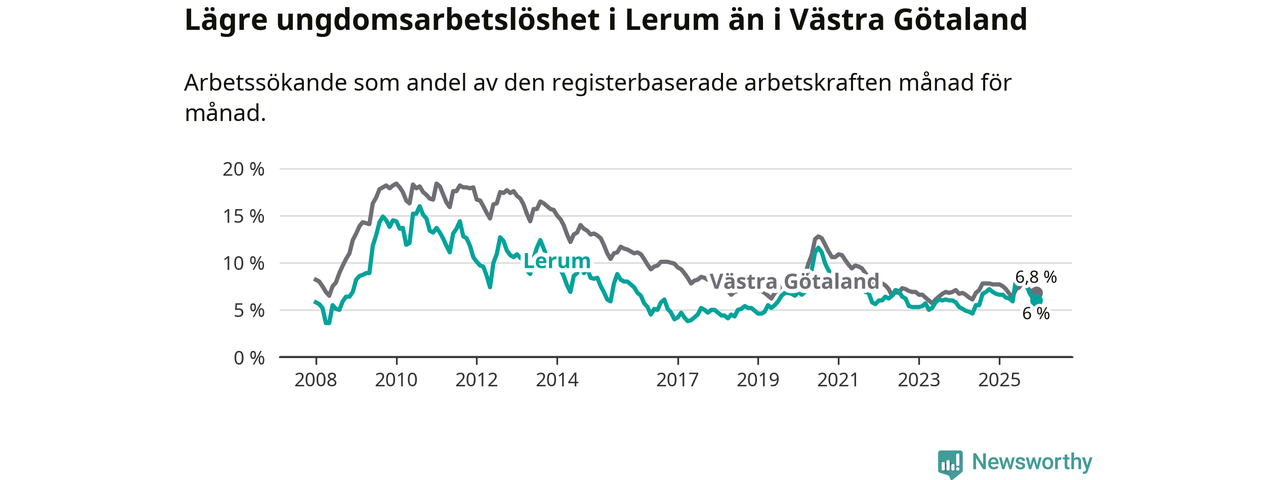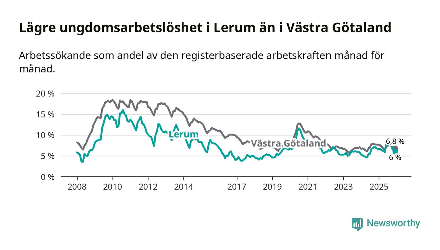 Precis som den totala arbetslösheten ligger ungdomsarbetslösheten i Lerum lägre än i Västra Götaland som helhet. Skillnaden mellan kommunen och länet är 0,8 procentenheter.