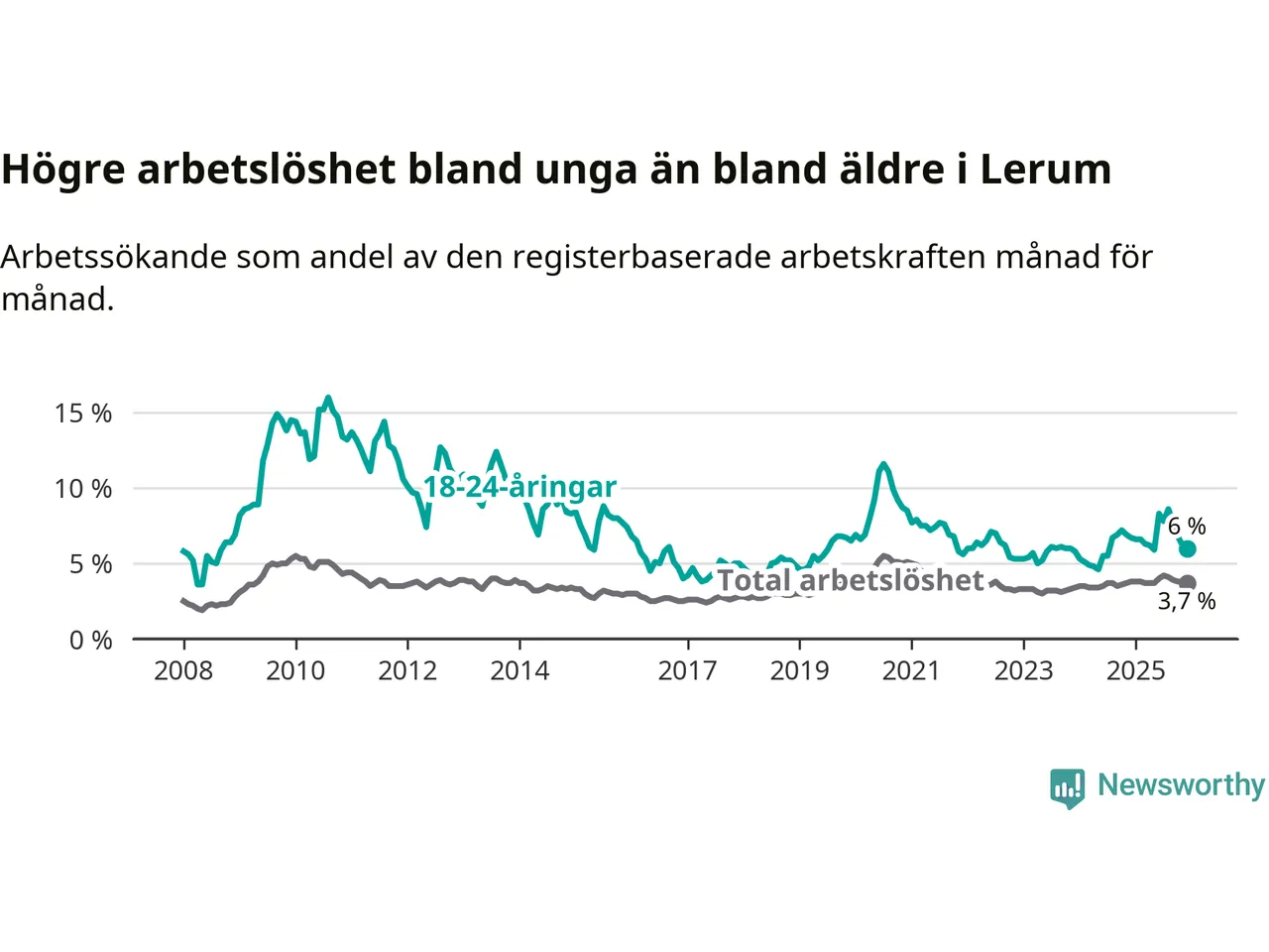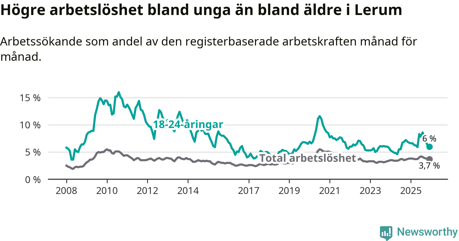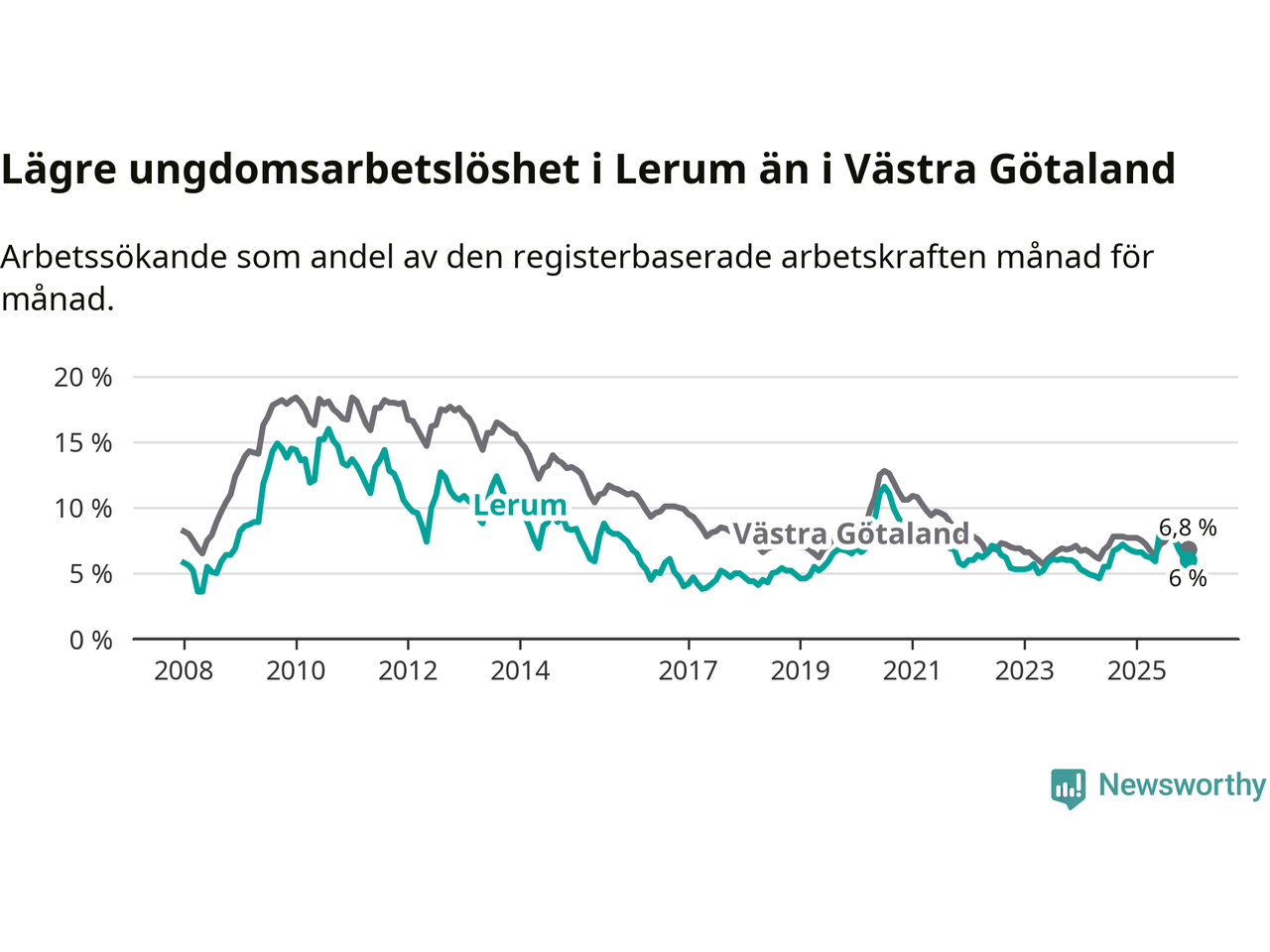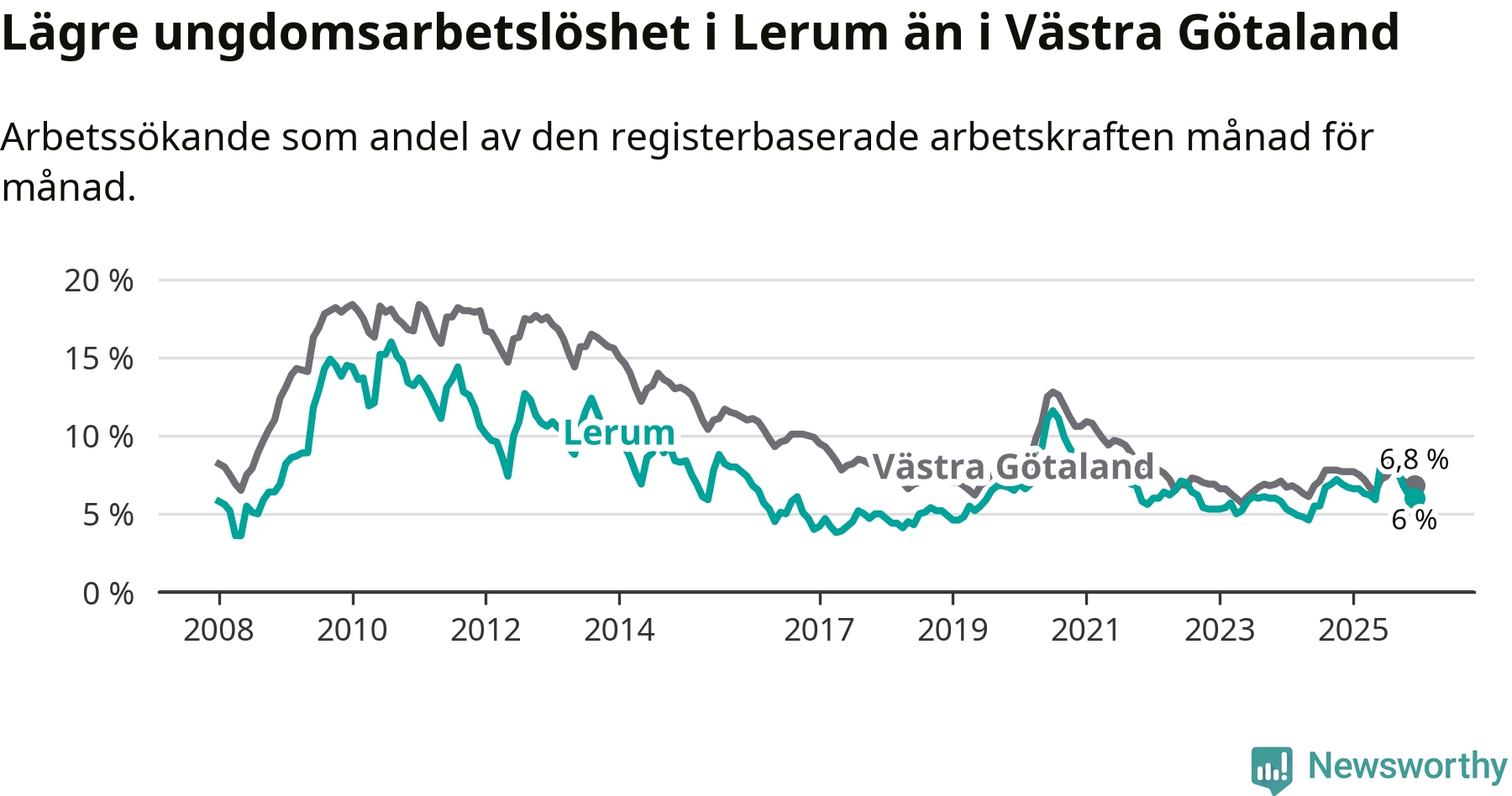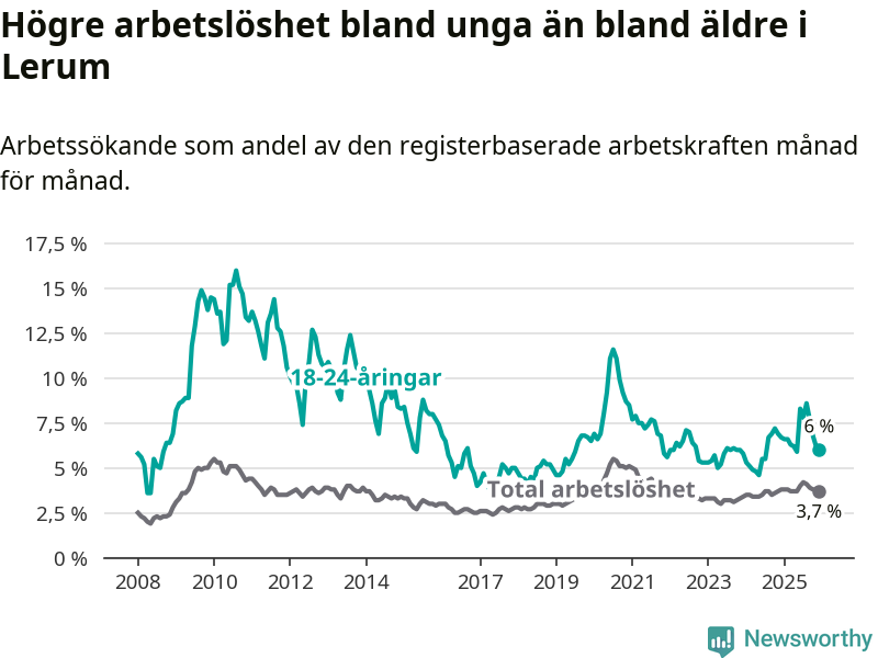 Precis som den totala arbetslösheten ligger ungdomsarbetslösheten i Lerum lägre än i Västra Götaland som helhet. Skillnaden mellan kommunen och länet är 0,8 procentenheter.