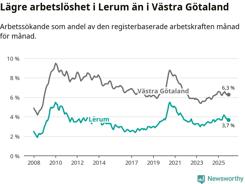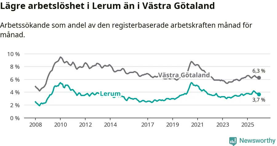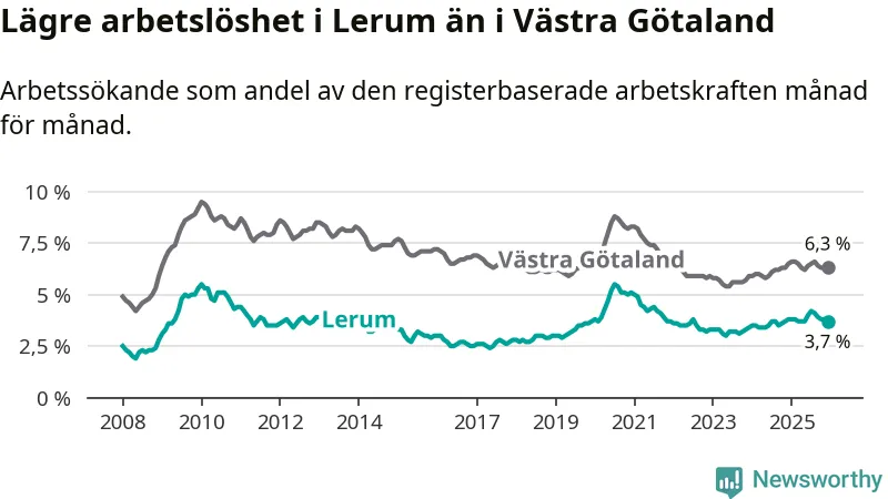 Under december månad rapporterade Lerums kommun en total arbetslöshet på 3,7 procent. Det är en minskning jämfört med samma tidpunkt i fjol (−0,1 procentenheter). Även i Västra Götalands län sjunker arbetslösheten .