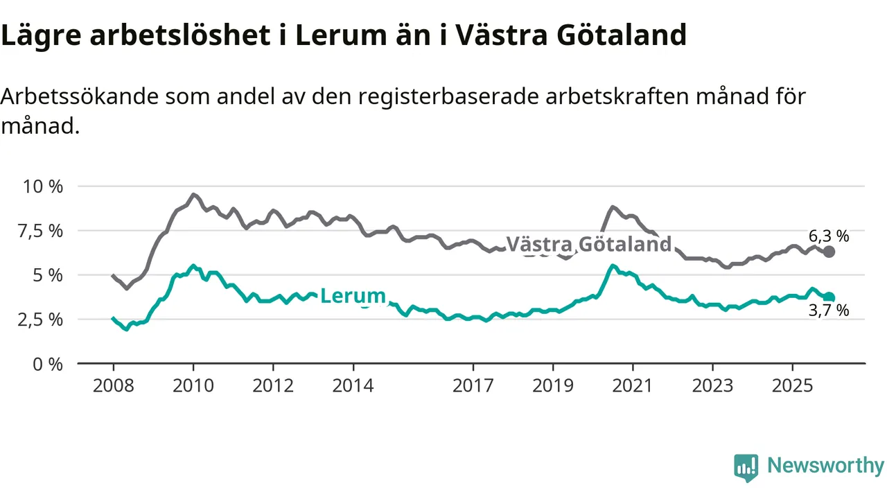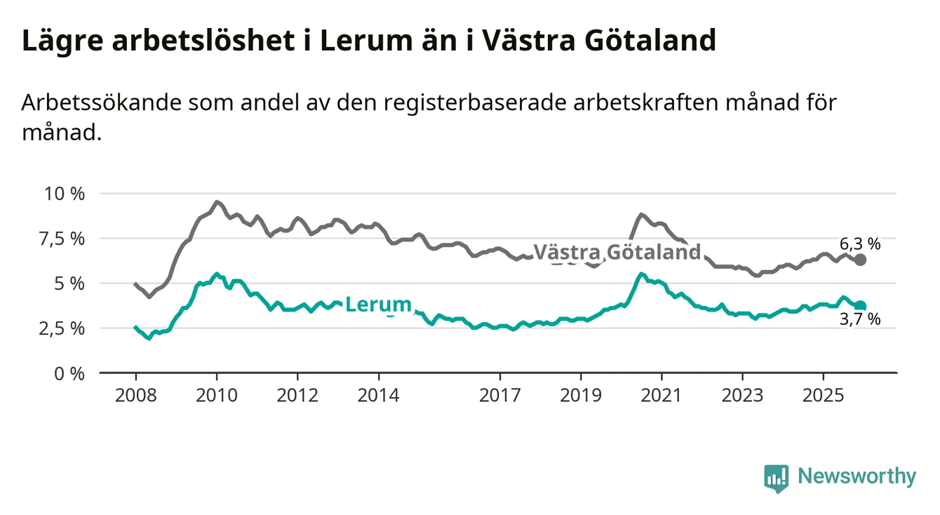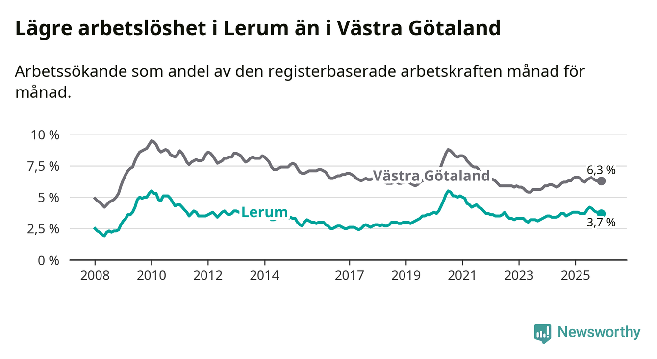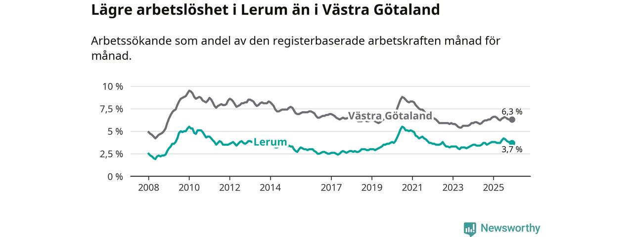 Lerum hade redan tidigare lägre arbetslöshet än snittet i hela Västra Götalands län och nu växer klyftan (3,7 procent i kommunen, jämfört med 6,3 procent i hela länet). Öckerö har den lägsta arbetslösheten i länet (3,0 procent), medan Gullspång har den högsta (8,8 procent). För att Lerum skulle komma ner i samma arbetslöshetsnivå som Öckerö skulle 154 personer behöva sysselsättas.