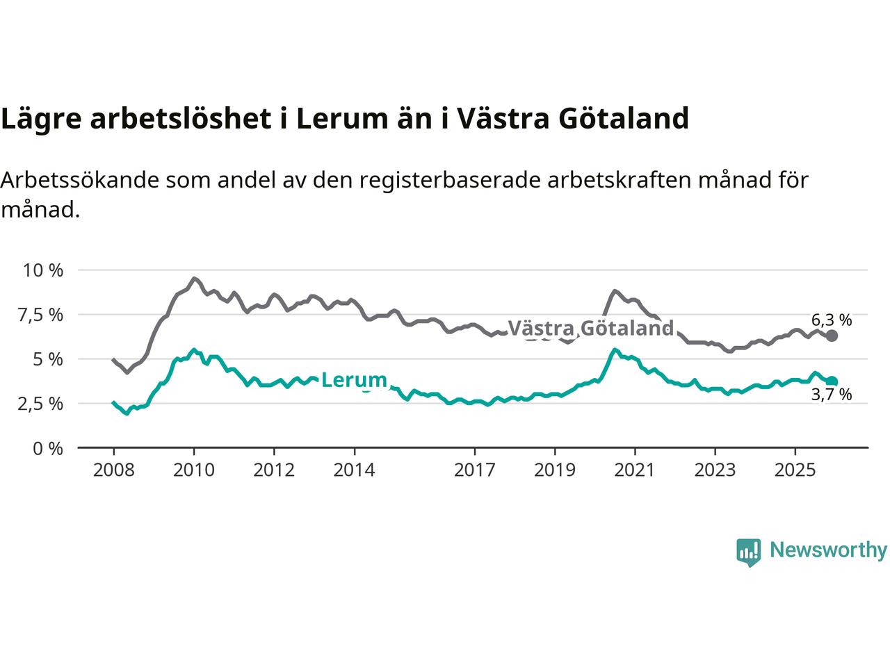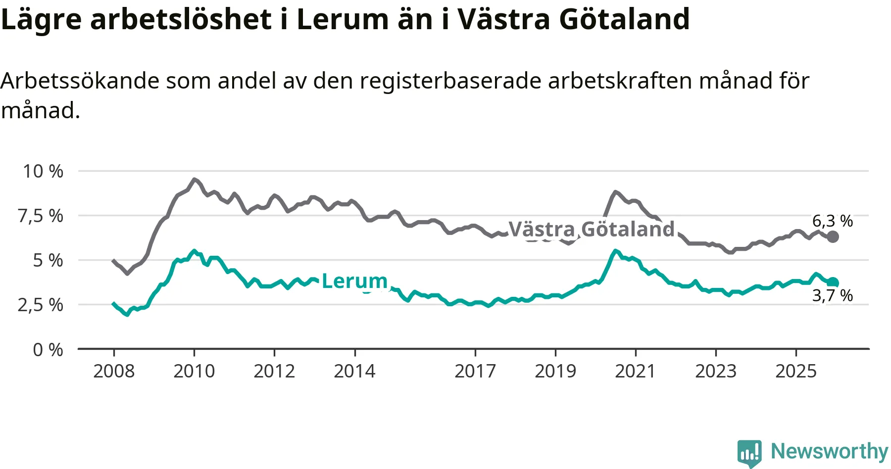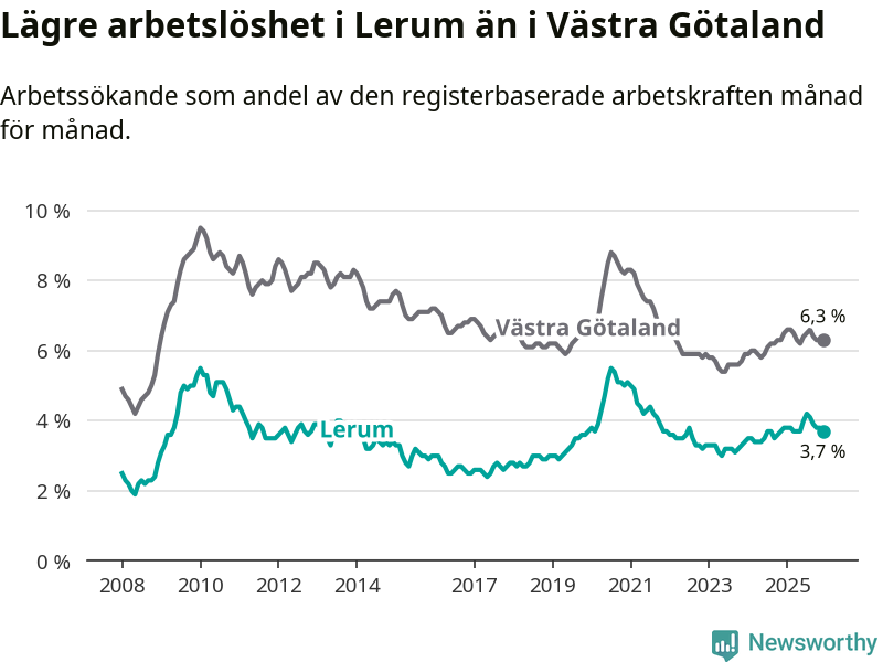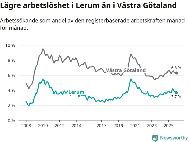 Lerum hade redan tidigare lägre arbetslöshet än snittet i hela Västra Götalands län och nu växer klyftan (3,7 procent i kommunen, jämfört med 6,3 procent i hela länet). Öckerö har den lägsta arbetslösheten i länet (3,0 procent), medan Gullspång har den högsta (8,8 procent). För att Lerum skulle komma ner i samma arbetslöshetsnivå som Öckerö skulle 154 personer behöva sysselsättas.